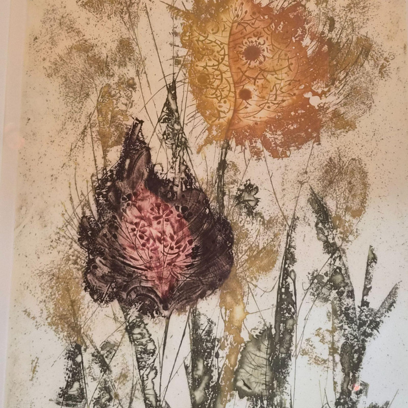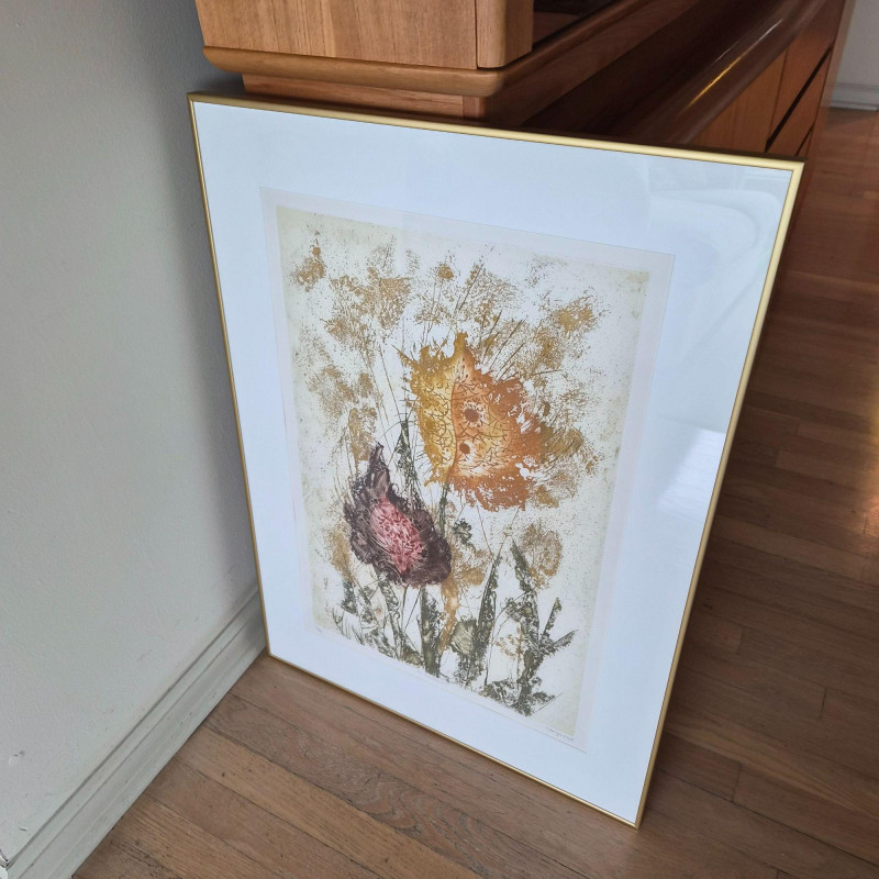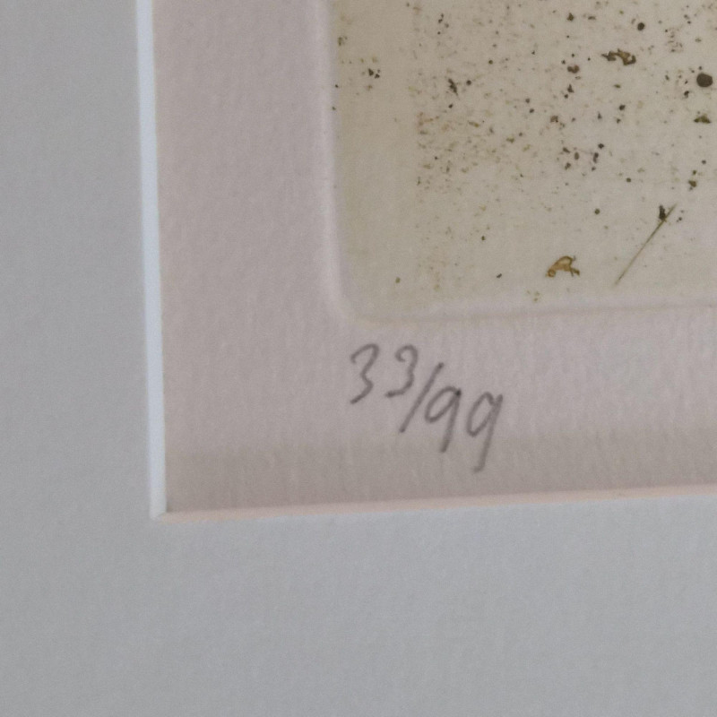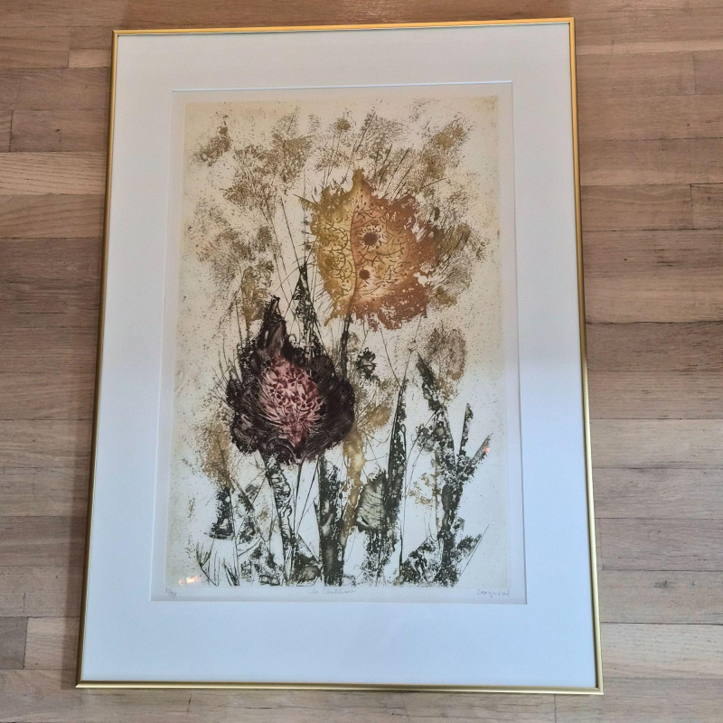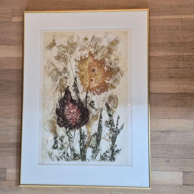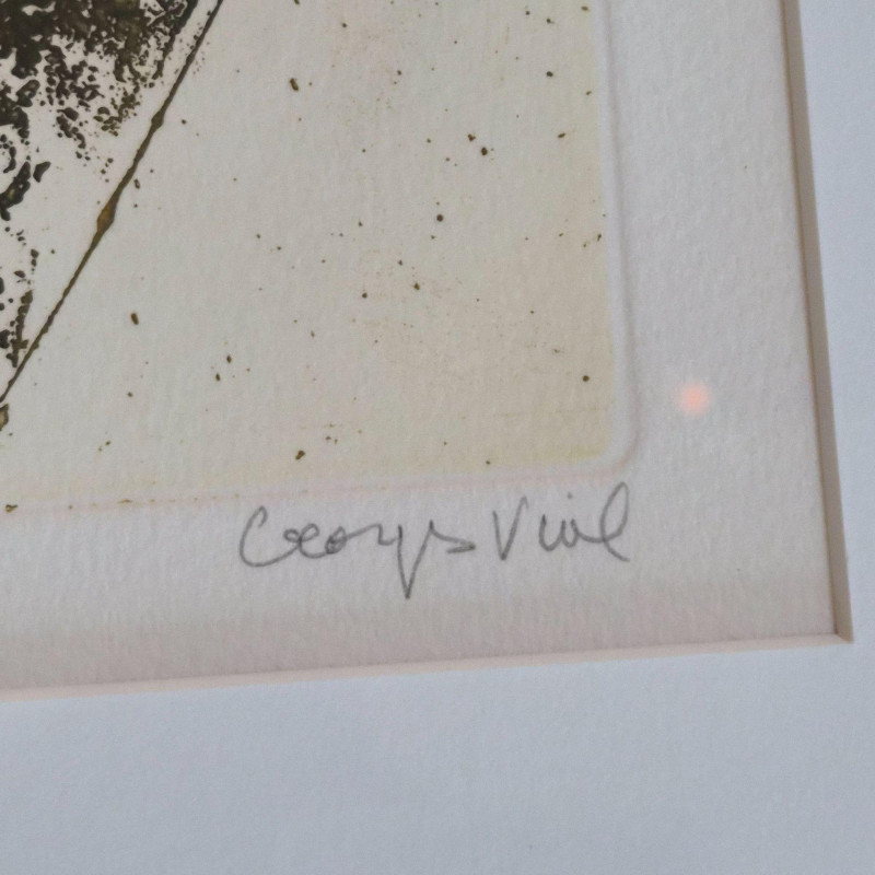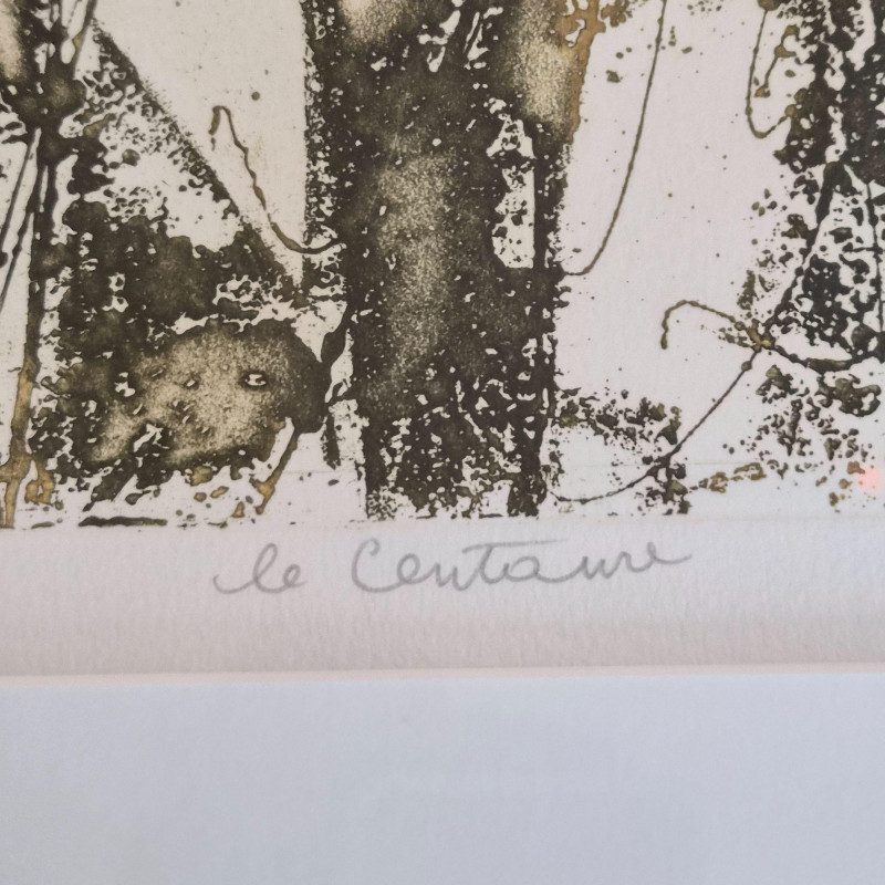 A limited‑edition color engraving by French artist Georges Vial, titled “Le Centaure.” The work features Vial’s signature organic texture and warm, earthy palette, rendered with the subtle dimensionality characteristic of his hand‑colored engravings. This piece is numbered 33/99 and signed by the artist in pencil along the lower margin. Presented in a gold metal frame with a clean, classic profile that complements the artwork’s natural tones. A refined, collectible print from a recognized French artist, ideal for contemporary, botanical, or European‑influenced interiors.