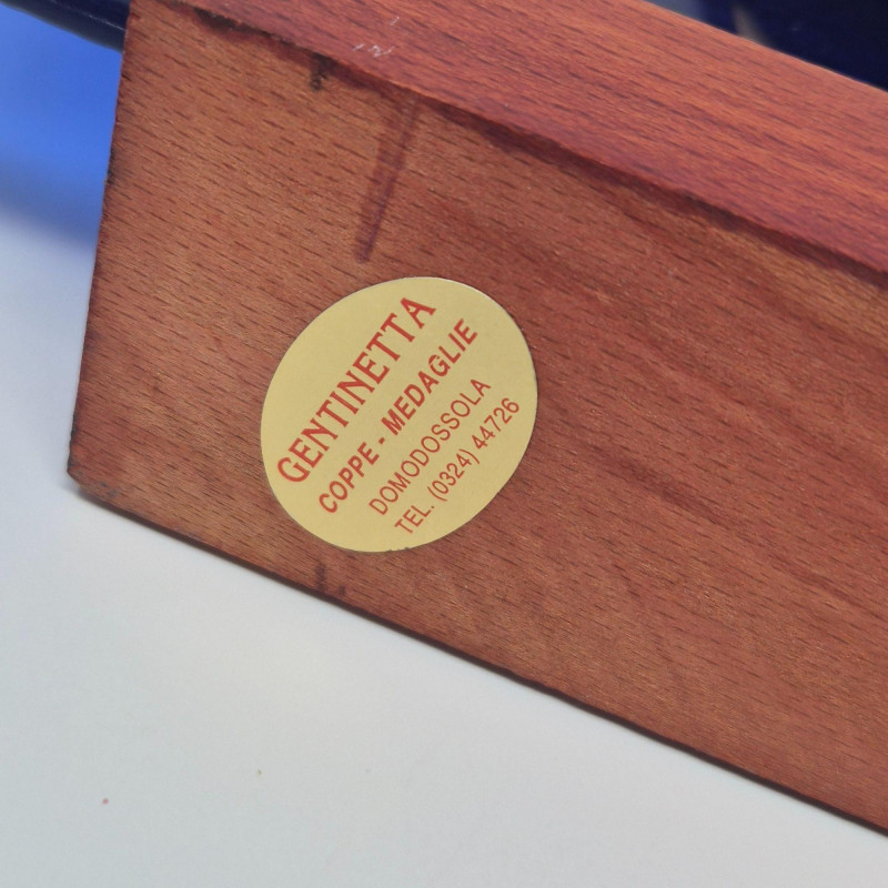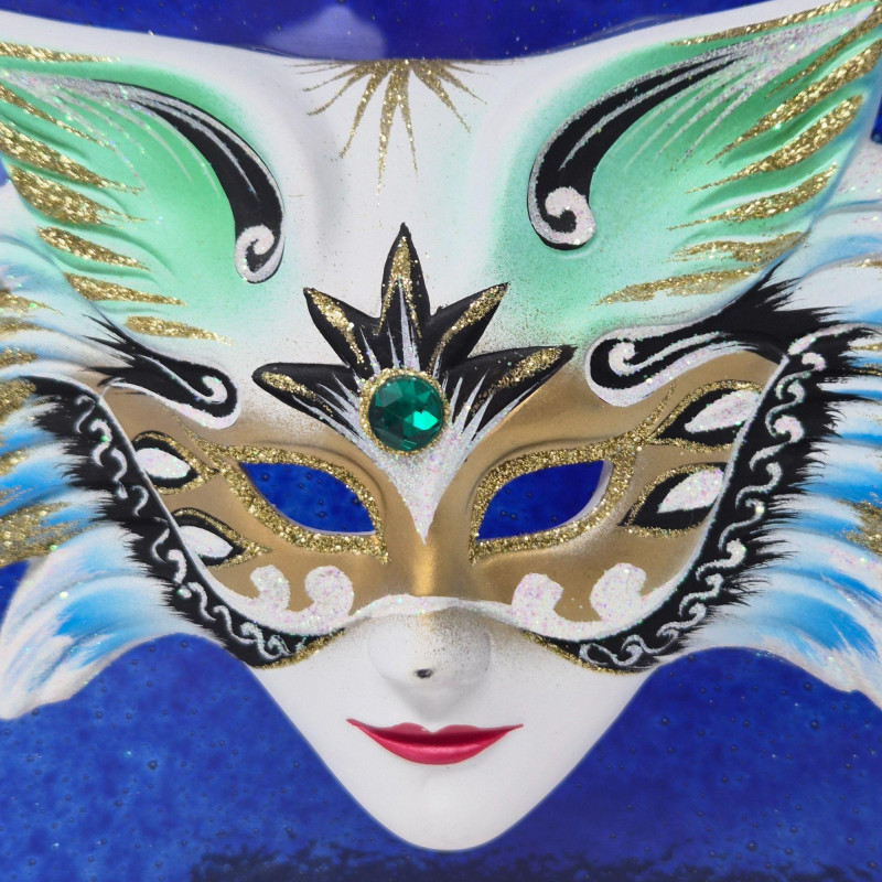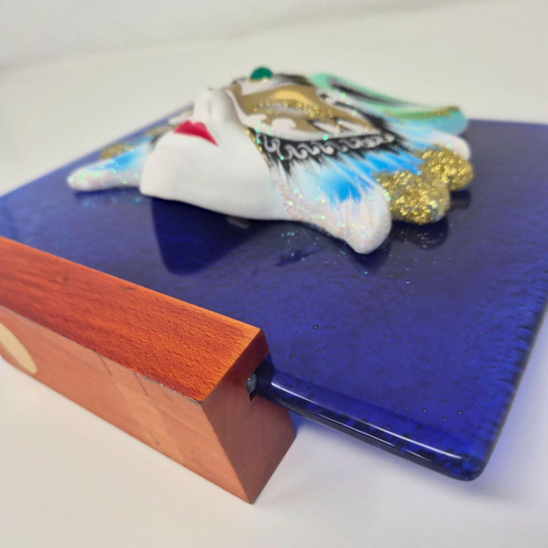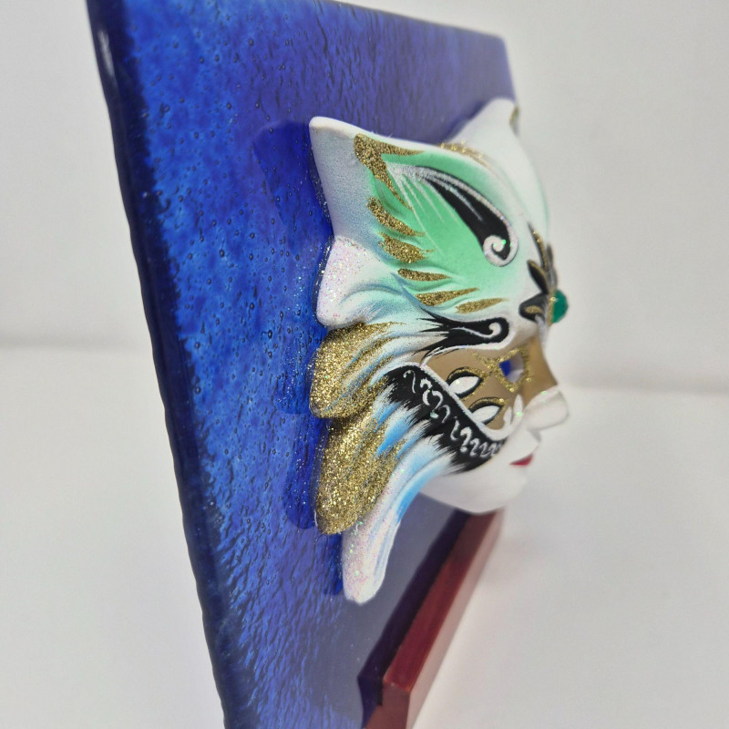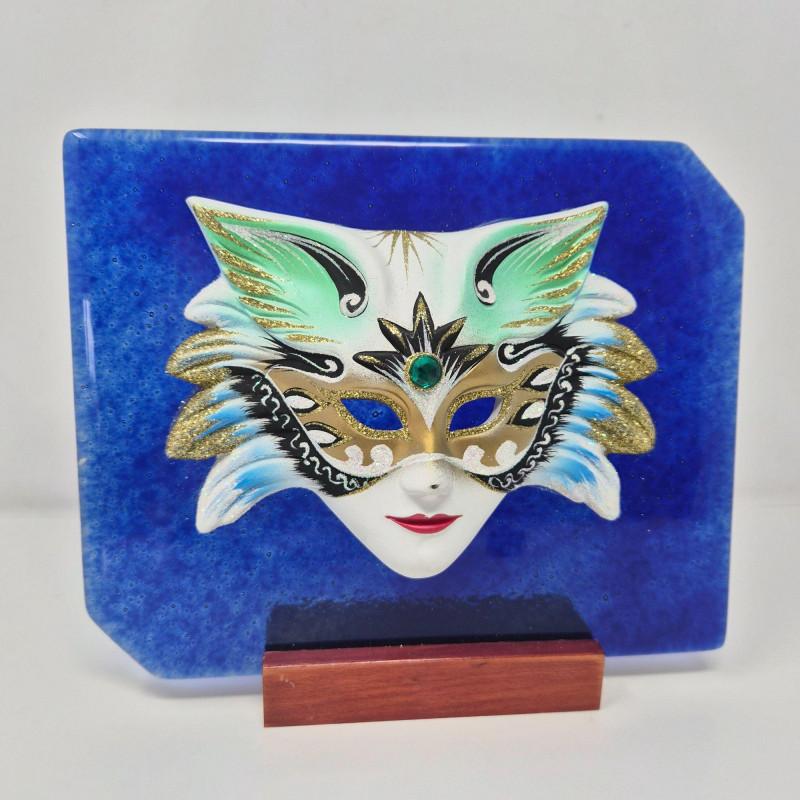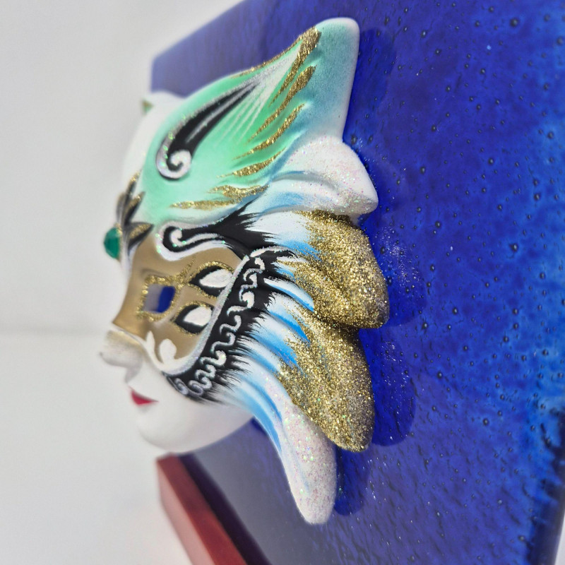 A striking Gentinetta ceramic mask mounted on a rich cobalt art‑glass panel, creating a dramatic, sculptural presentation. The mask features ornate detailing in gold, green, blue, and white with a central green cabochon accent, red lips, and feather‑like flourishes that evoke Venetian carnival artistry. The piece is set on a 2" deep wood base, giving it stability and a gallery‑style presence suitable for tabletop or shelf display. A vivid, theatrical decorative object with strong color and visual impact.