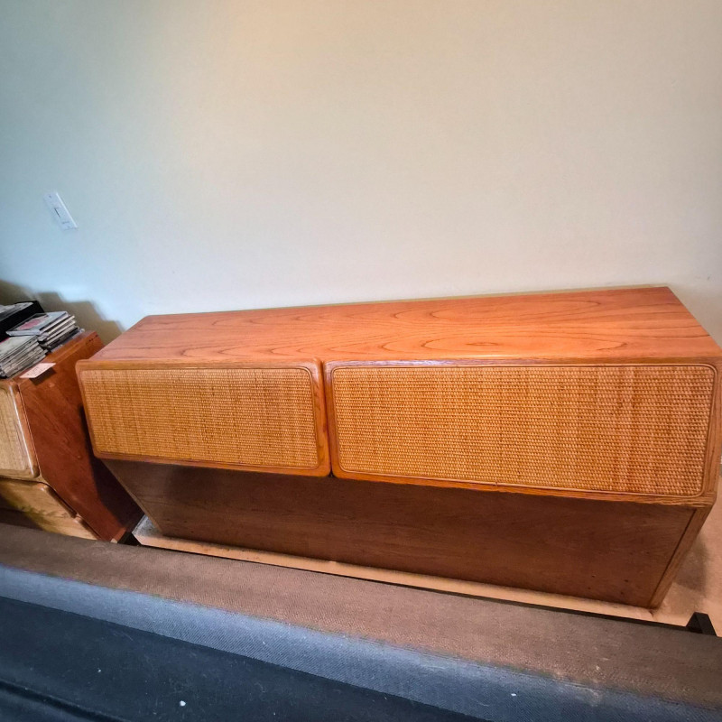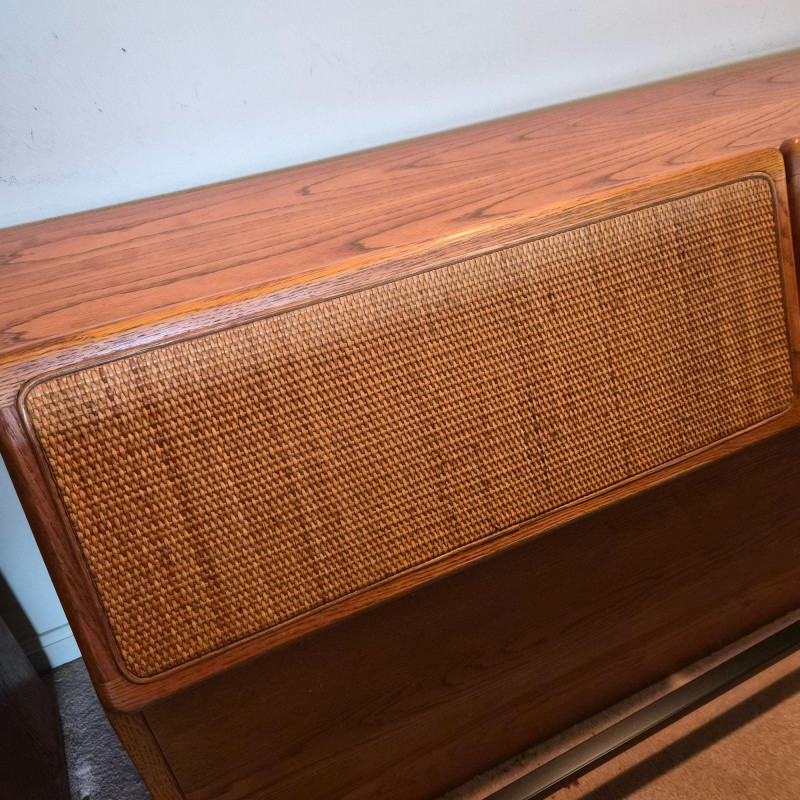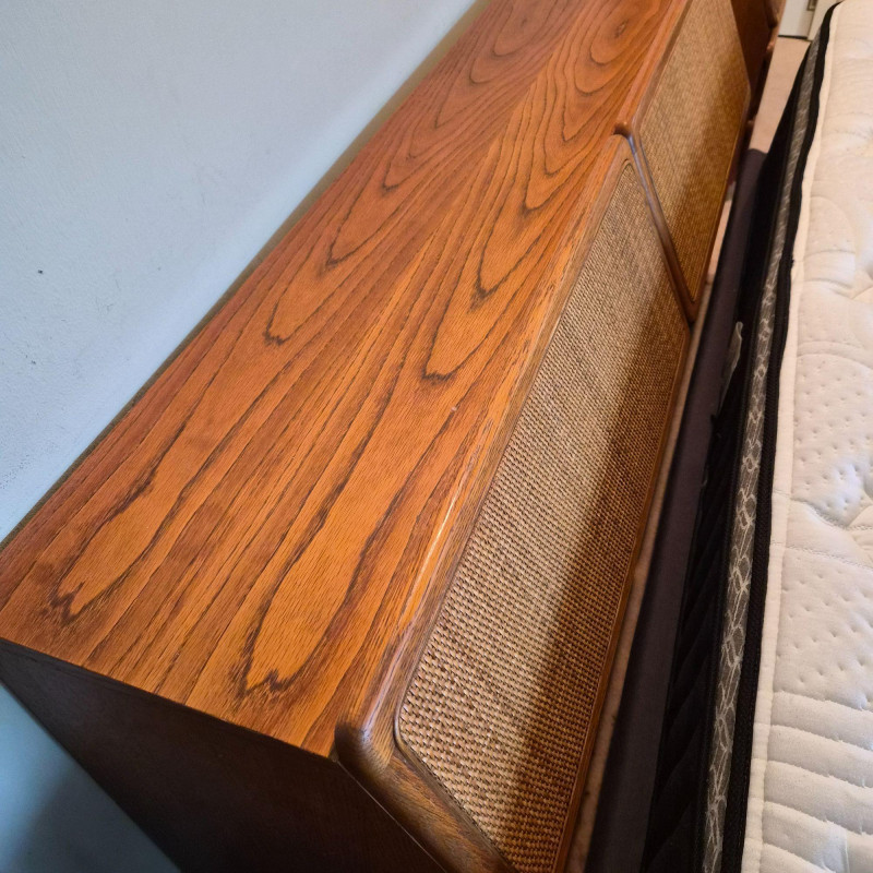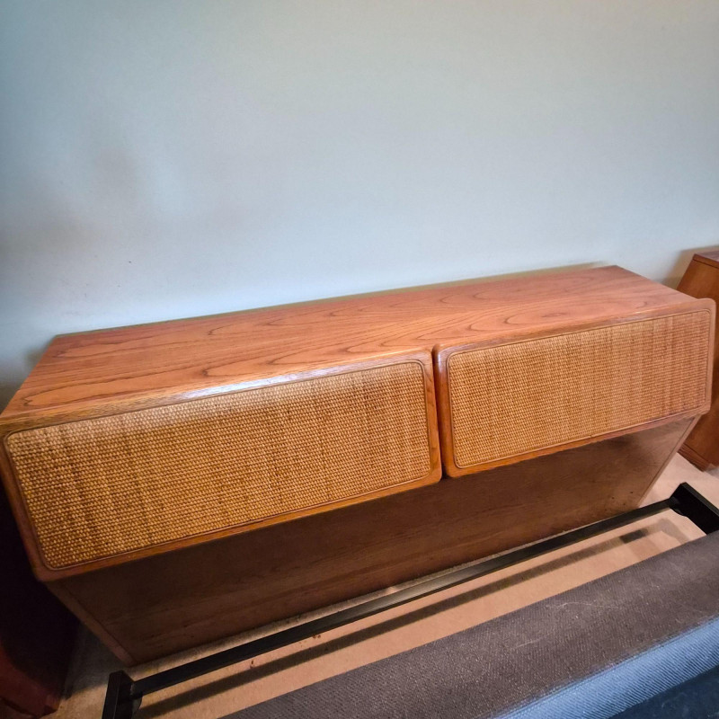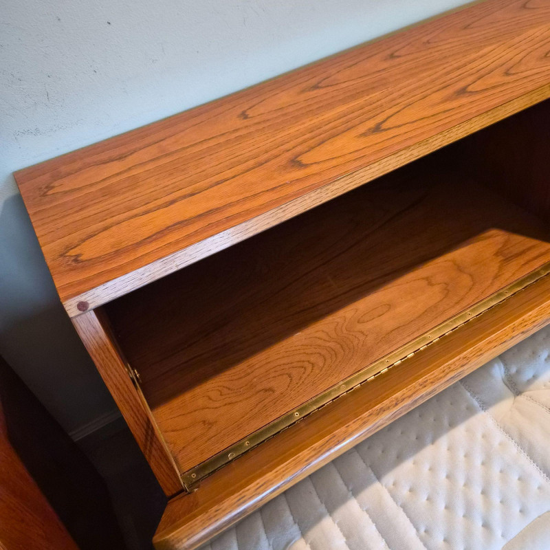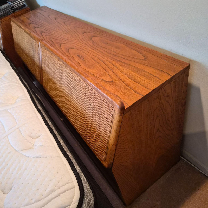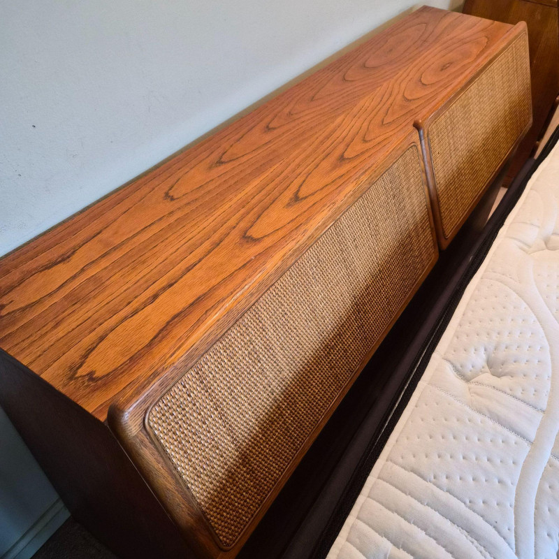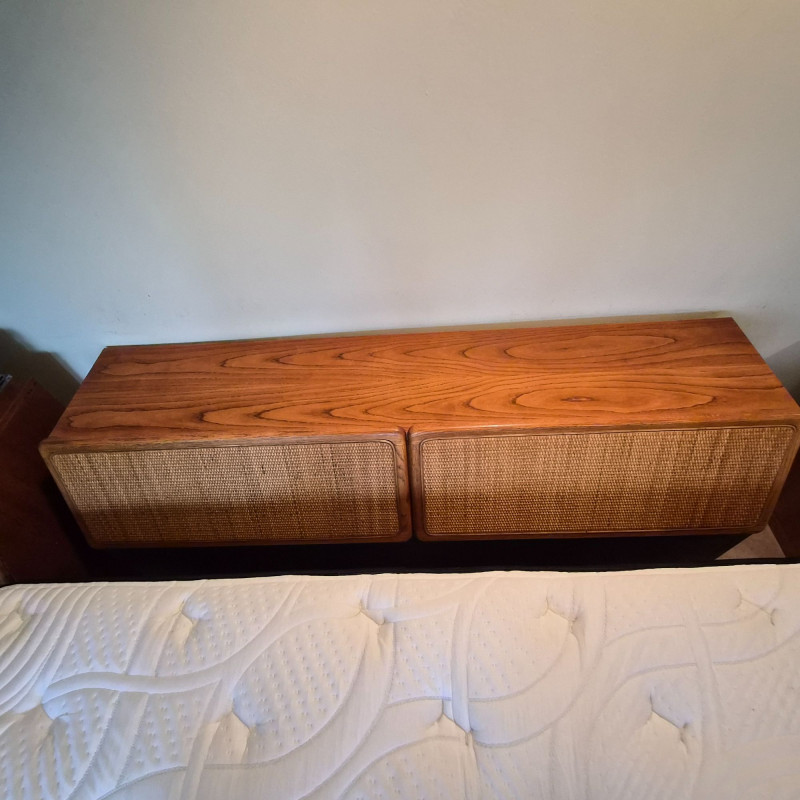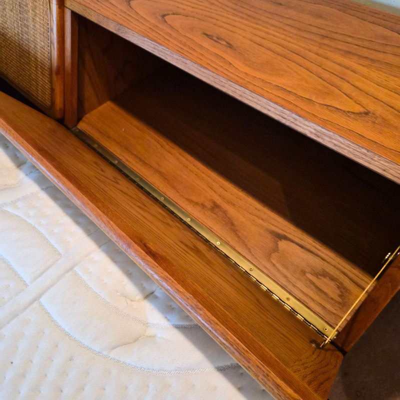 A stylish and functional Lane Furniture headboard featuring two pull‑down, hinged cupboard‑style cabinets with classic woven cane fronts. The warm wood tone and clean lines reflect Lane’s late‑20th‑century design language, blending natural texture with practical bedroom storage. Each cabinet opens downward on smooth hinges, offering discreet space for books, bedside essentials, or display items. The cane panels add an airy, organic touch that pairs well with both vintage and contemporary décor. A versatile and attractive piece for anyone looking to add character and storage to their bedroom setup. This headboard matches the highboy dresser and pair of bedside tables offered in this auction, completing the ensamble. Due to the size and weight of this item, placing a bid confirms your agreement to arrive with two or more able-bodied helpers, an appropriately sized vehicle (please review measurements), and any necessary moving equipment such as a dolly or hand truck. Failure to arrive prepared may result in forfeiture of the item without refund. Please note: there will be no staff on-site to assist with moving or loading.