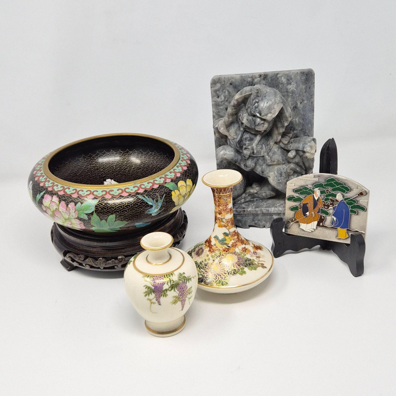 Eclectic grouping of Asian‑inspired décor, offering a blend of materials, motifs, and regional styles. This lot includes: