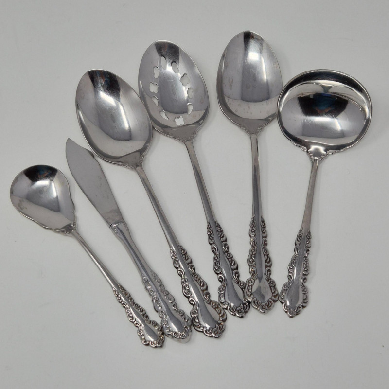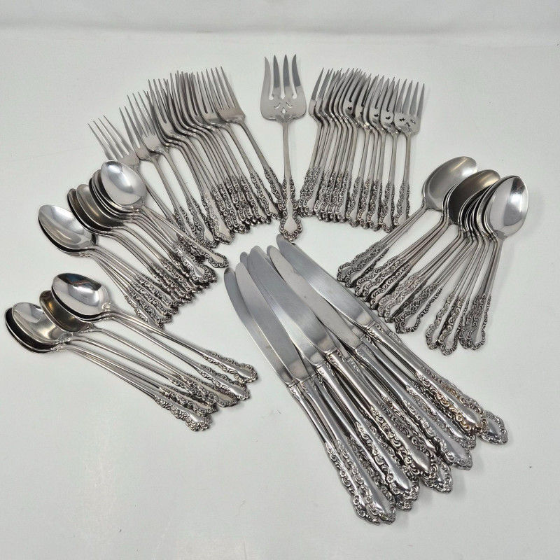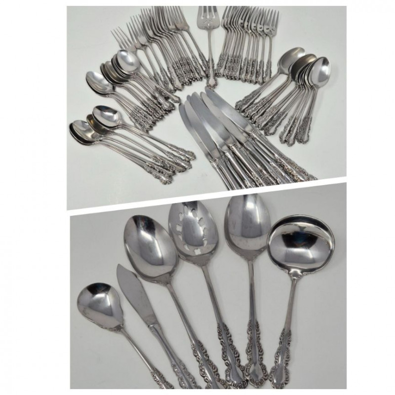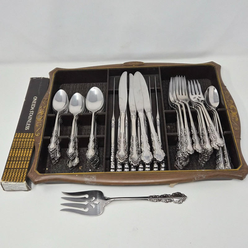 A beautifully coordinated Oneida Heirloom Stainless flatware set in the elegant “Shelley” pattern, crafted in premium quality tableware. This set features ornate, traditional handles with classic scrollwork and a full service for eight, plus a generous assortment of matching serving utensils. Service for 8 Includes: Dinner forks Salad forks Dinner knives Soup spoons Teaspoons Additional Serving Pieces: (2) large serving forks Solid serving spoons Perforated serving spoon Ladle Sugar spoon and Spreader A timeless, durable stainless set in Oneida’s beloved Shelley pattern — ideal for both everyday dining and formal table settings.