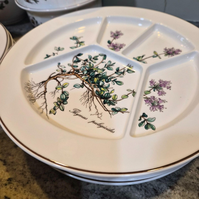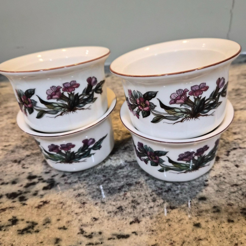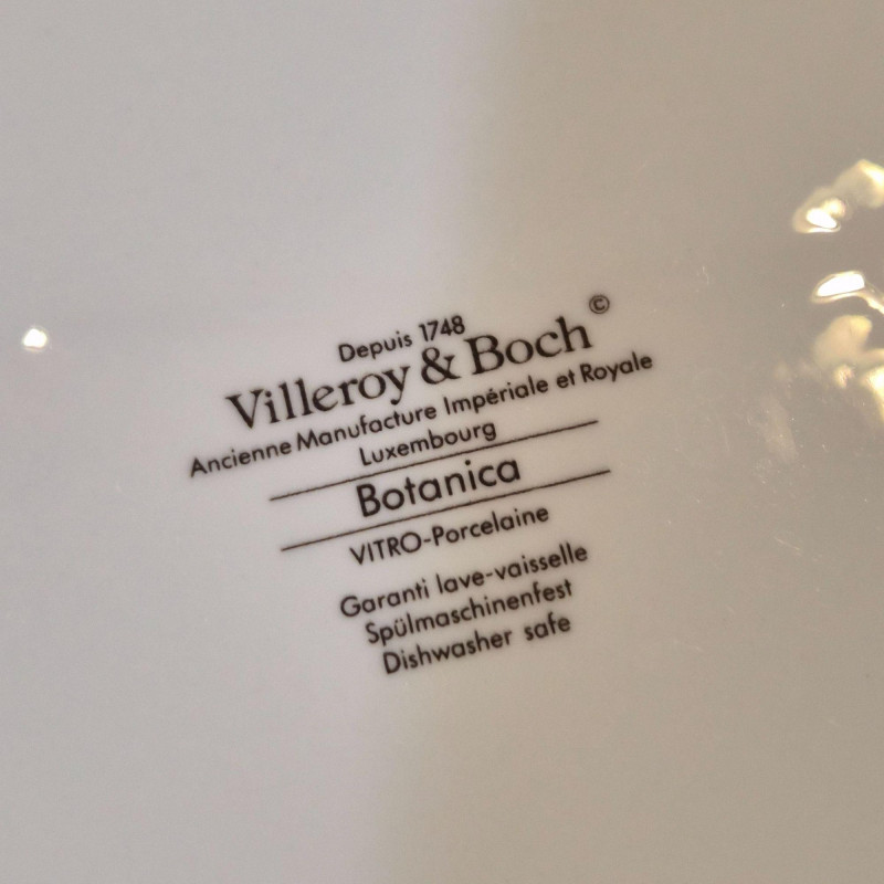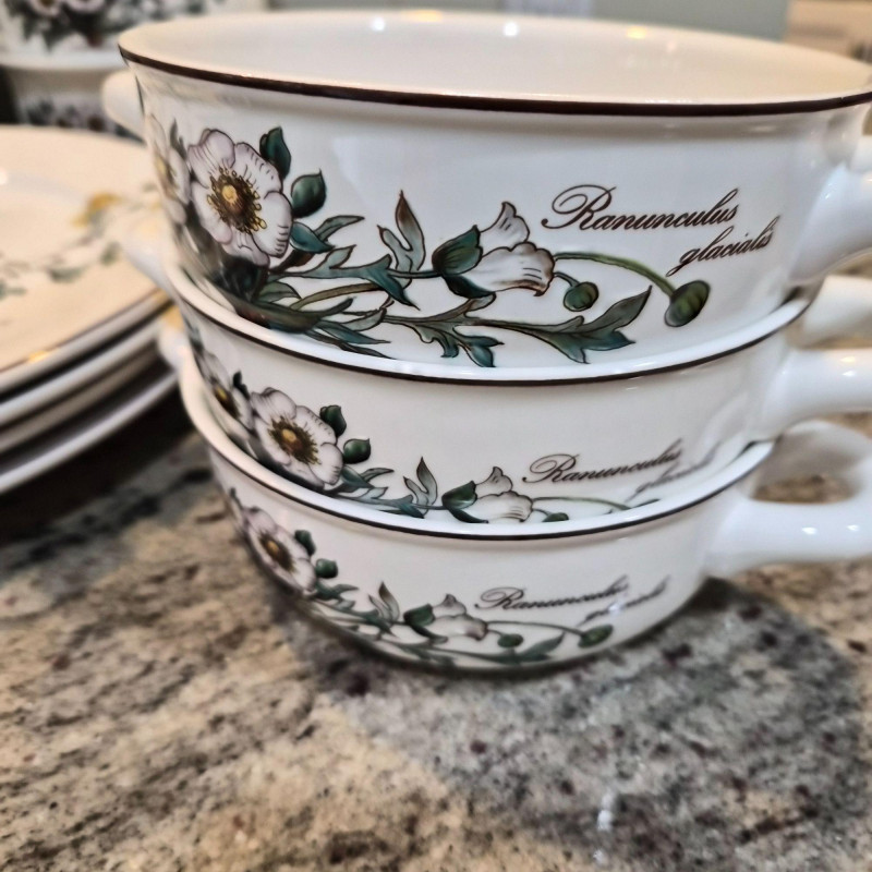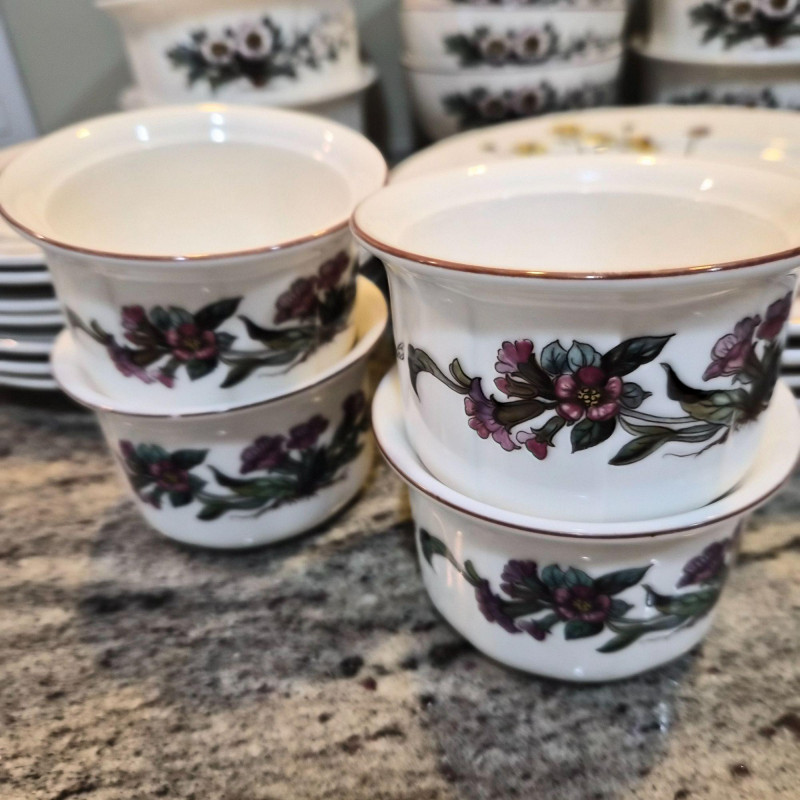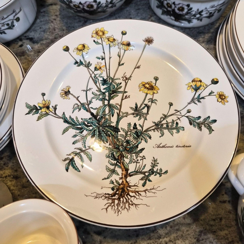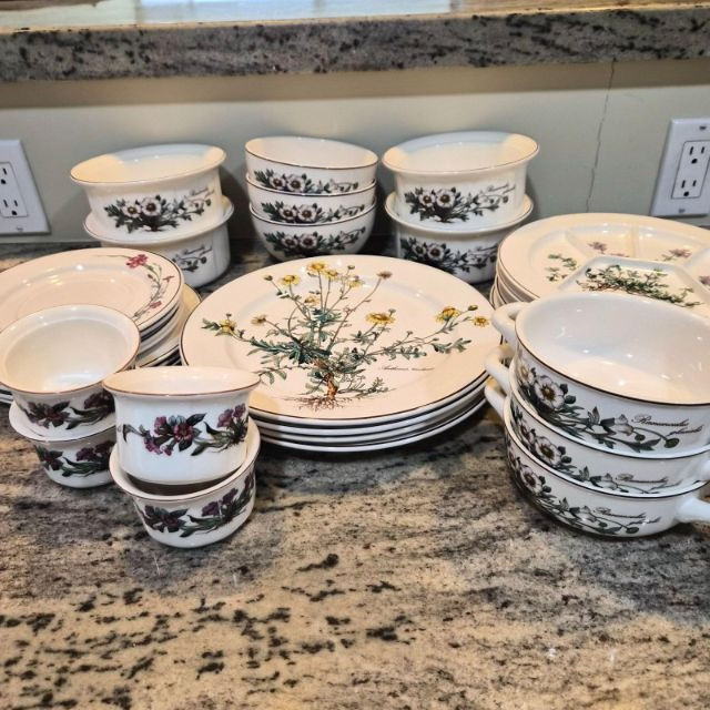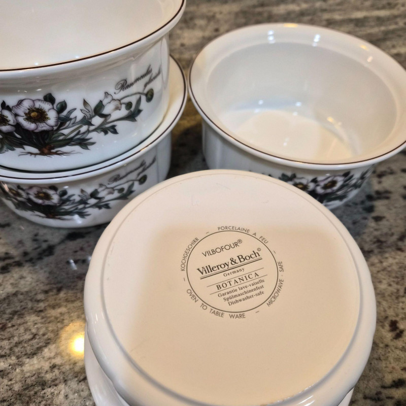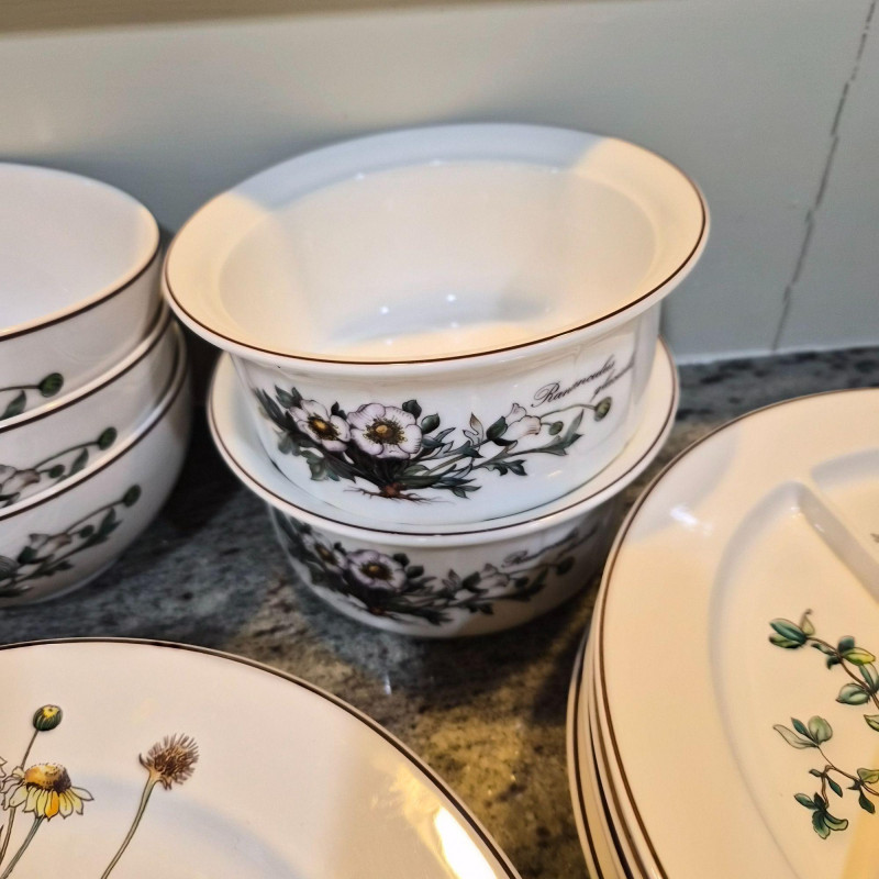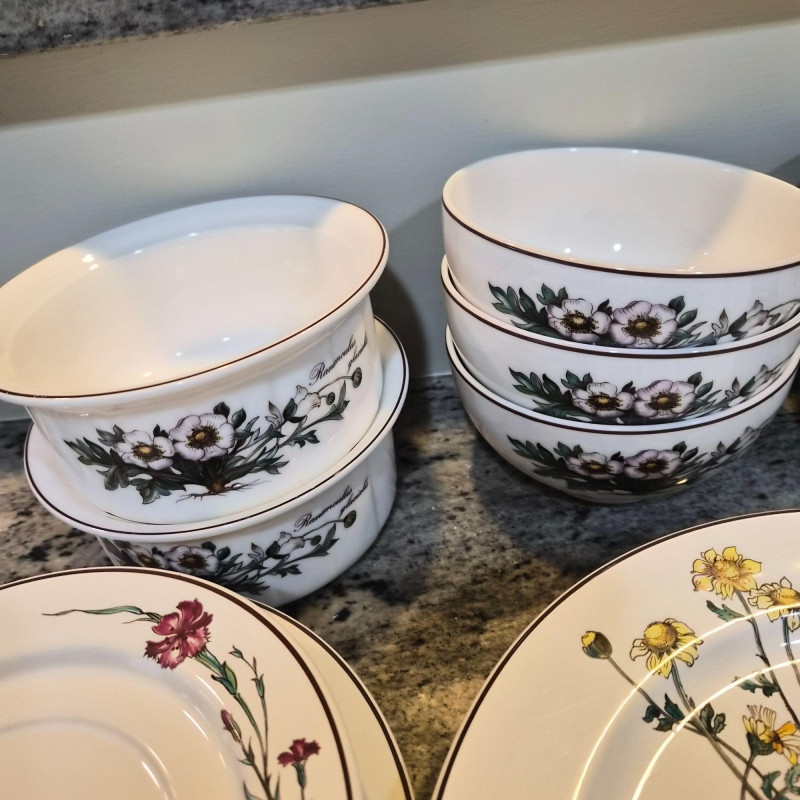 A charming and versatile grouping from the beloved Villeroy & Boch “Botanica” line, featuring richly detailed botanical illustrations with labeled floral motifs. This mixed set includes four‑piece place settings along with additional coordinating pieces—perfect for everyday use, garden‑themed tables, or collectors filling in their service. (4) 9.75" divided plates (4) 10.5" dinner plates (4) 6" oven‑to‑table casserole serving bowls (4) 3.4" ramekins (4) 7.5" bread & butter plates (3) 8" salad plates (3) 5.5" cereal bowls (3) 5" double‑handle soup bowls