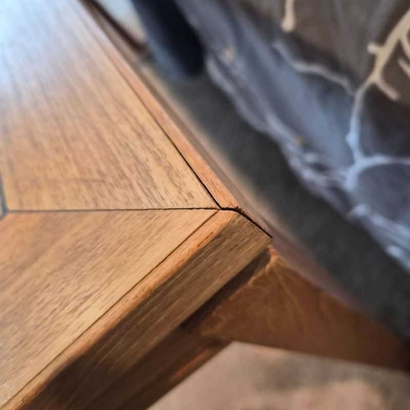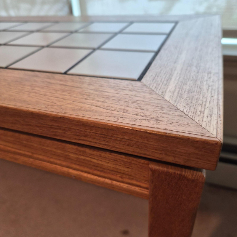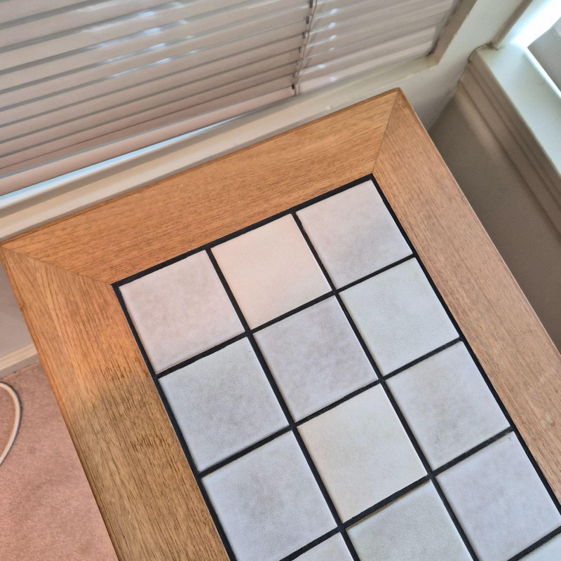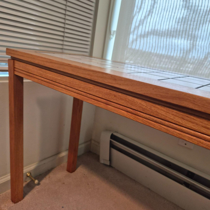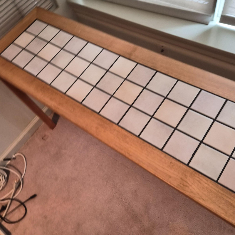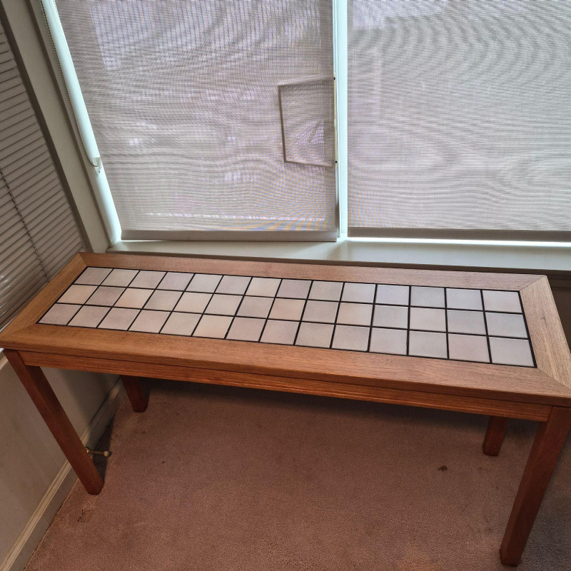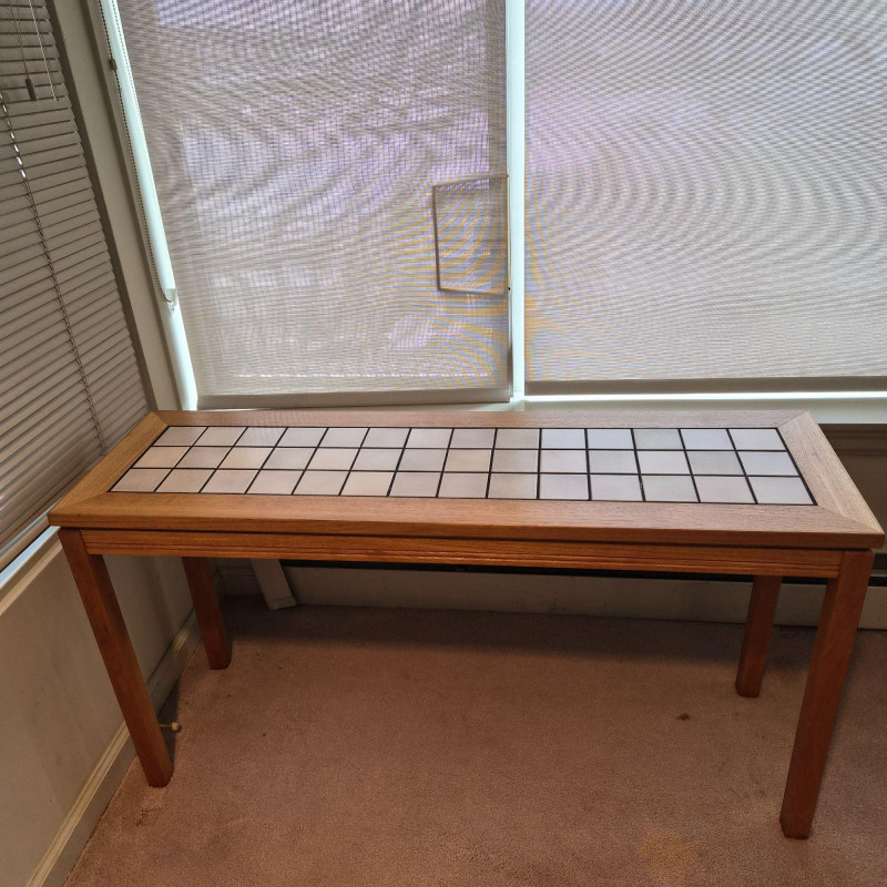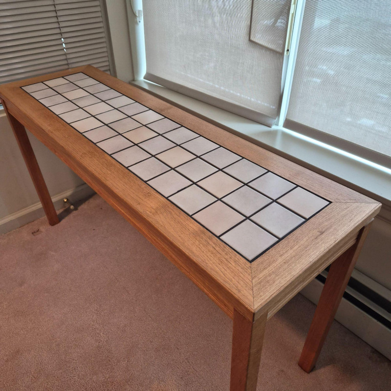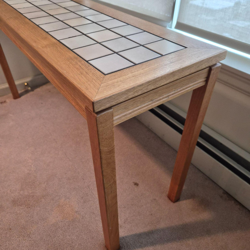 A sleek Denmark‑style tiled entry table featuring a rectangular grid of light ceramic tiles set within a warm wood frame with mitered corners. The clean lines and mixed‑material design give it a modern‑rustic look that works beautifully in entryways, hallways, or as an accent table in living spaces. Sturdy construction with a practical, easy‑to‑clean tiled top — ideal for plants, décor, or everyday drop‑zone use. Note - one corner has small spot slightly pulling apart (likely easy fix).