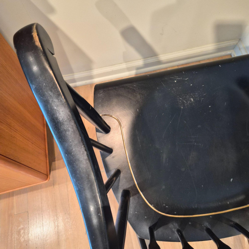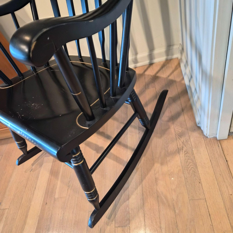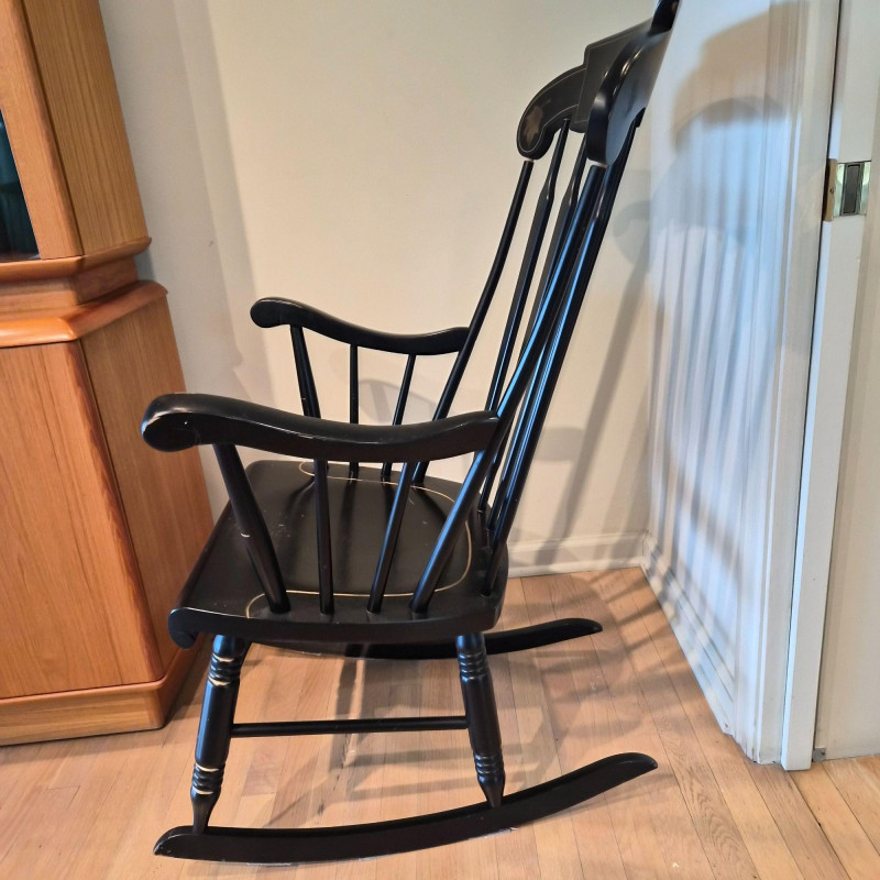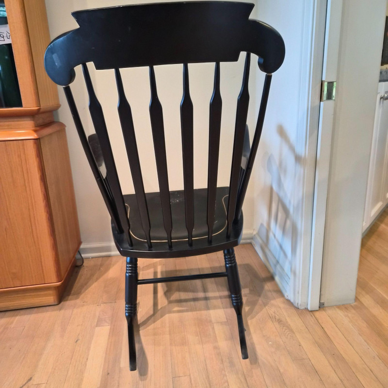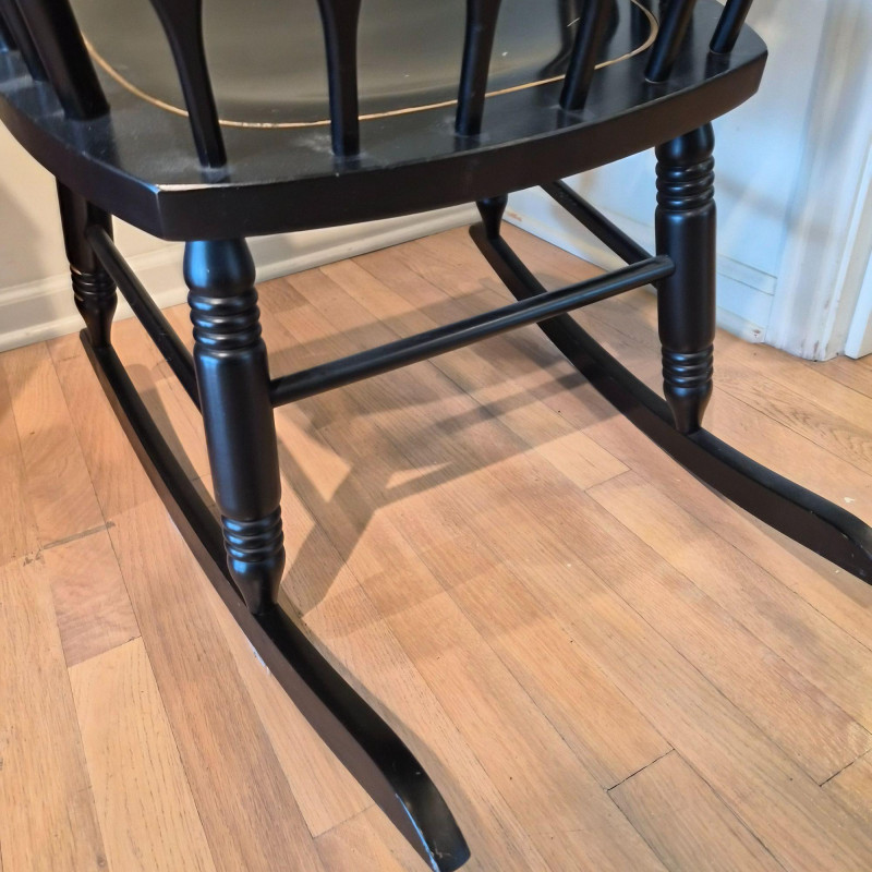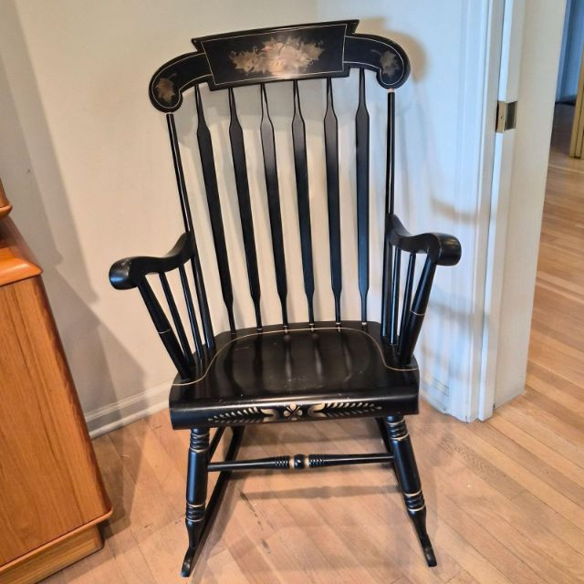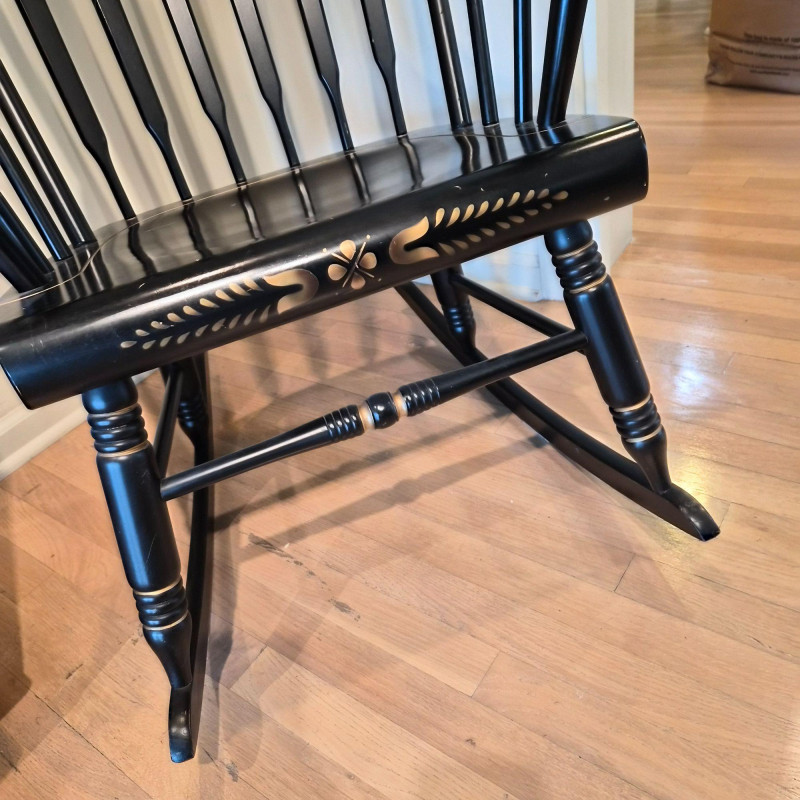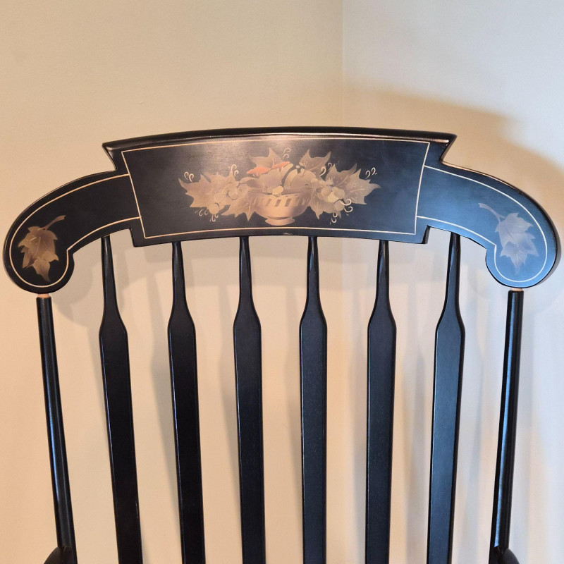 A traditional Windsor‑style rocking chair in a rich ebony finish, featuring a curved spindle back, turned legs, and smooth, shaped armrests. The top crest rail includes a decorative painted motif with gold accents, adding a touch of folk‑art charm to the classic silhouette. The chair rocks smoothly and has a 17" seat height, making it comfortable for reading nooks, nurseries, or living‑room accent seating. A timeless piece with both functional comfort and decorative appeal.