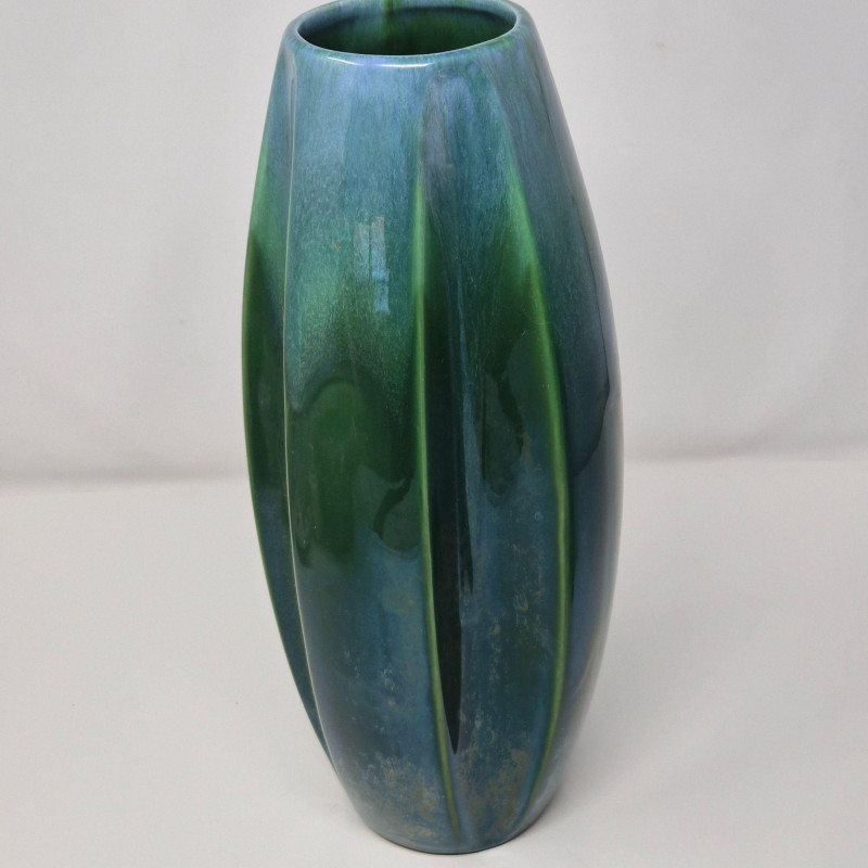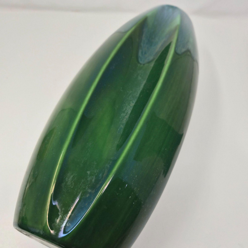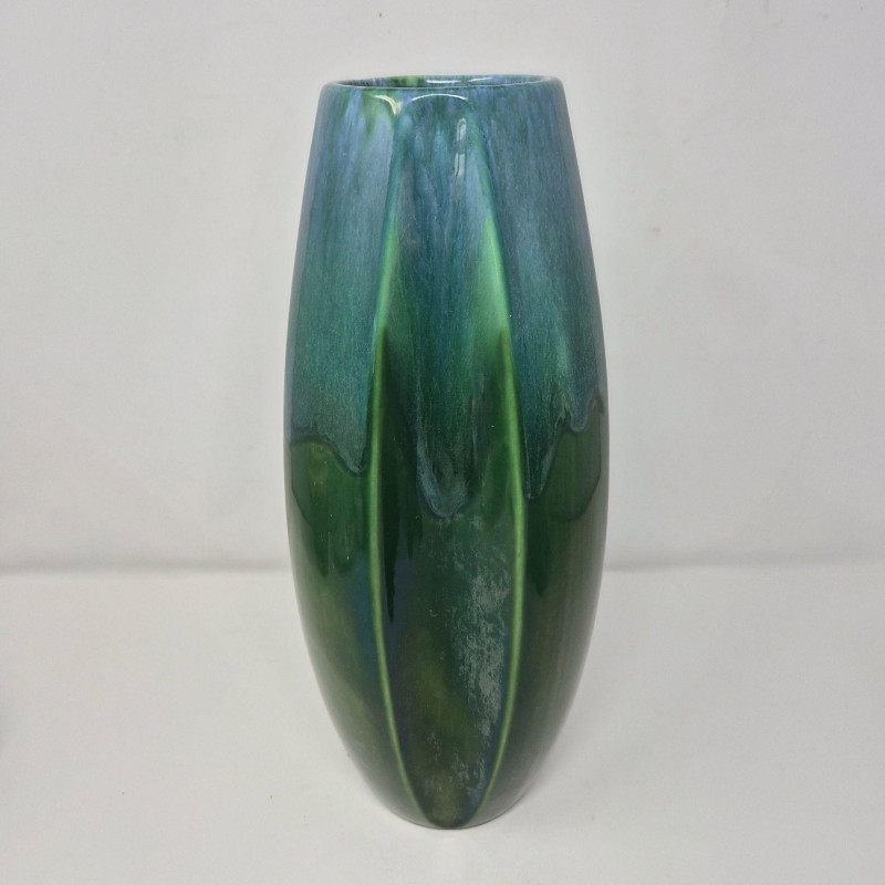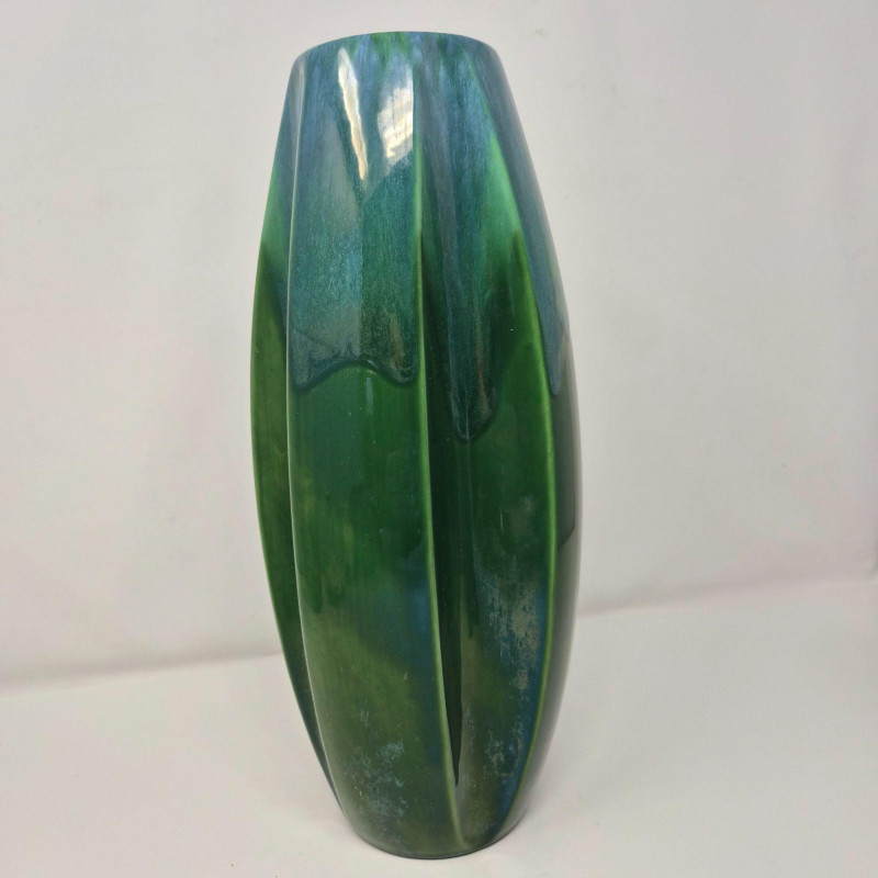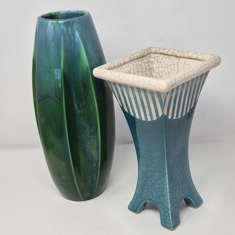 A tall 13.5" x 5" vase featuring a flowing green‑to‑blue and subtle iridescent glaze with an indented scalloped pattern. Organic, fluid, and richly dimensional. Together, they create a compelling contrast of structured modern form and lush, painterly glaze work—perfect for collectors of contemporary studio ceramics or anyone building a curated décor vignette.