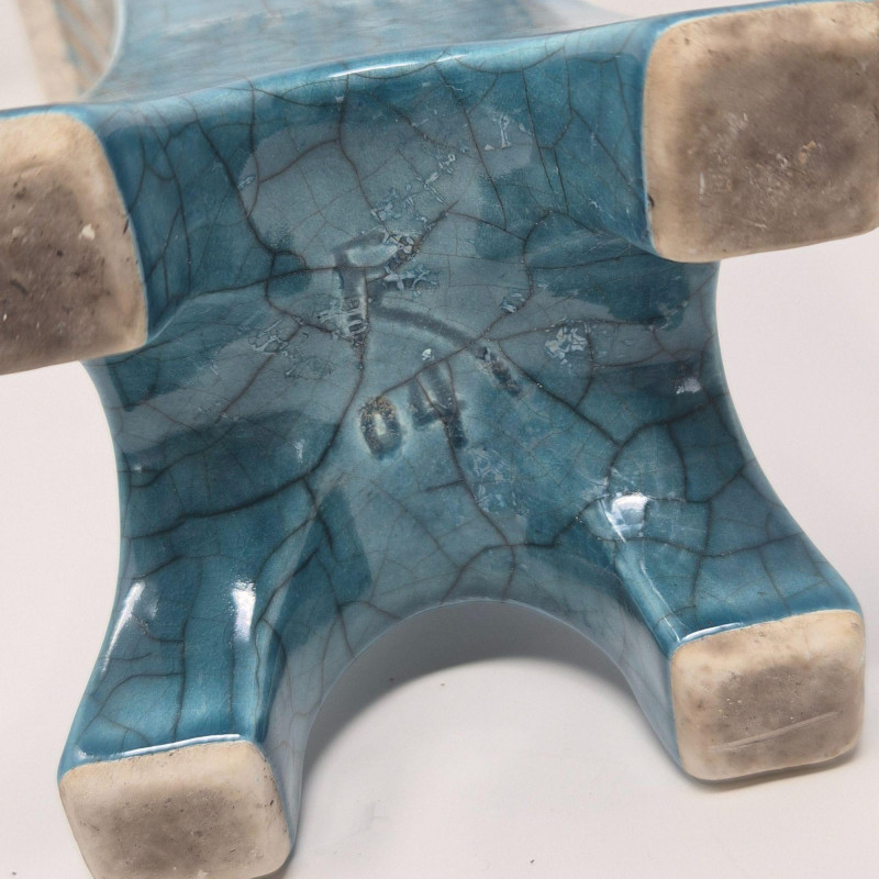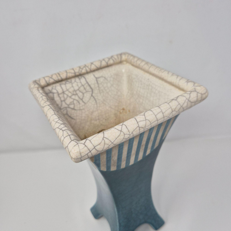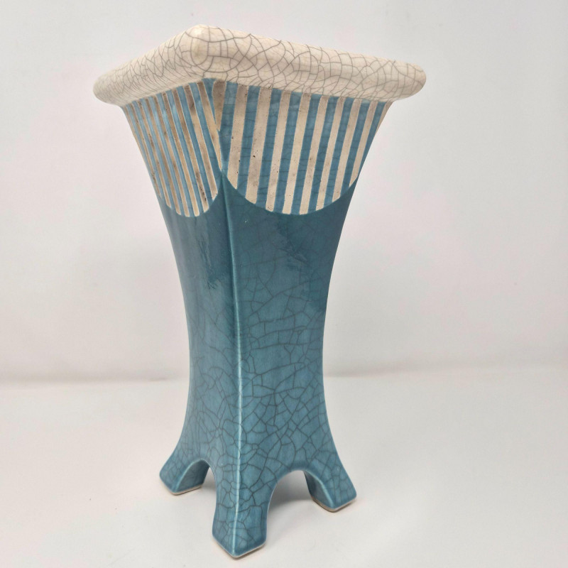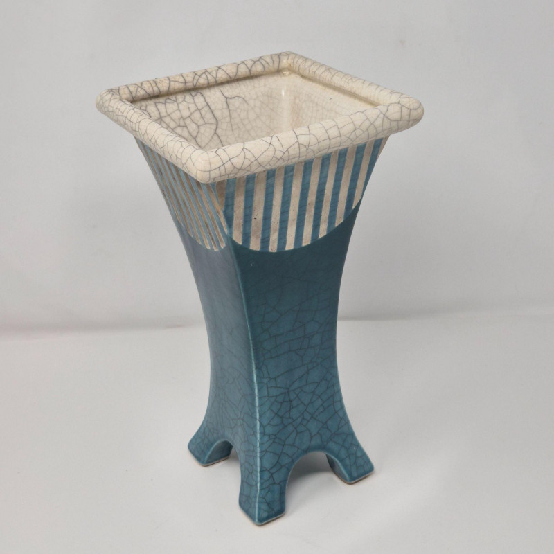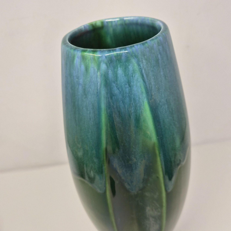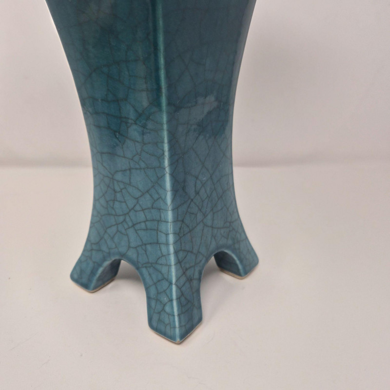 A tapering, architectural tower‑form vase with a square footprint and flared legs. Signed PC ’04. Measures 5.5" x 5.5" x 10.75". Modern, geometric, and beautifully hand‑crafted. Green/Blue Iridescent Drop‑Glaze Vase