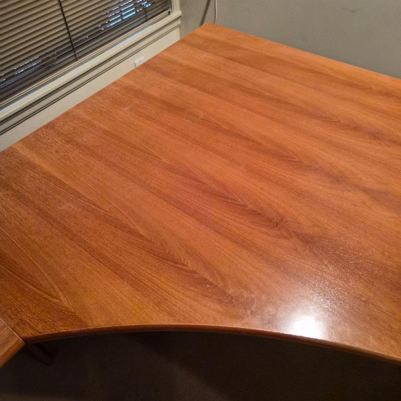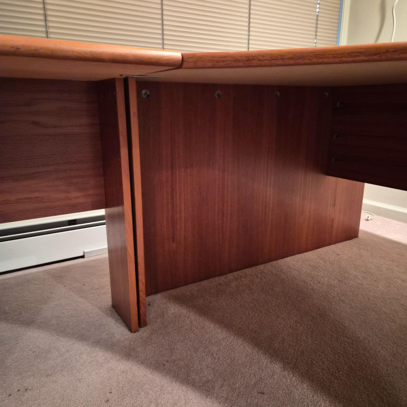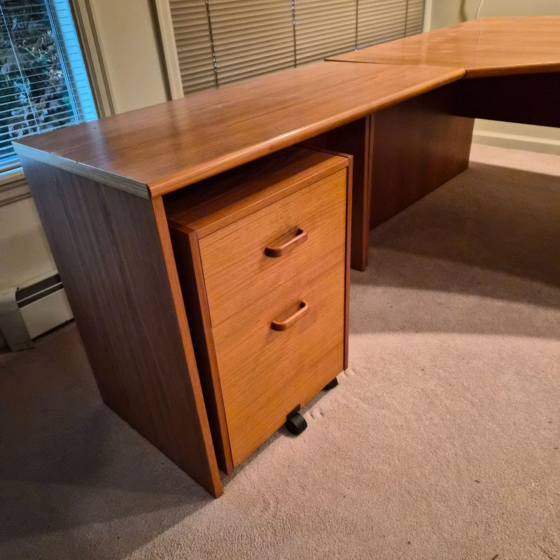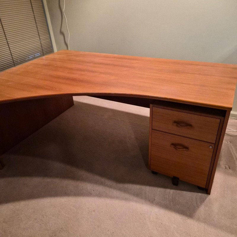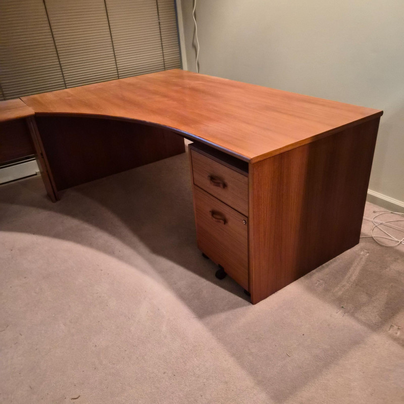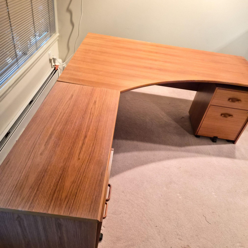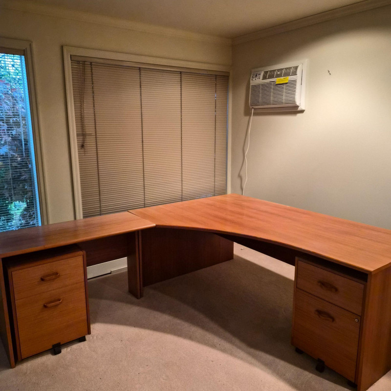 A spacious L‑shaped wood desk unit with clean, modern lines and a warm finish. Built with sturdy construction, this desk provides a generous work surface ideal for home offices, studios, or multi‑purpose rooms. The unit does come apart for easier transport. Buyers will need tools to dismantle (see photos for screw types and connection points).
