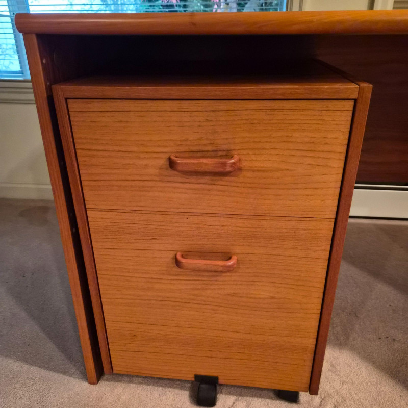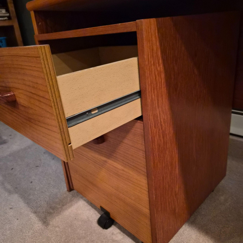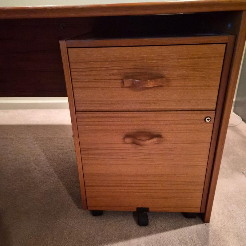 Shows some surface wear consistent with normal use. Includes two matching rolling file cabinets, each with dual drawers and casters for flexible placement. Dimensions: 88" long × 72" wide × 30" deep. Due to the size and weight of this item, placing a bid confirms your agreement to arrive with two or more able-bodied helpers, an appropriately sized vehicle (please review measurements), and any necessary moving equipment such as a dolly or hand truck. Failure to arrive prepared may result in forfeiture of the item without refund. Please note: there will be no staff on-site to assist with moving or loading.