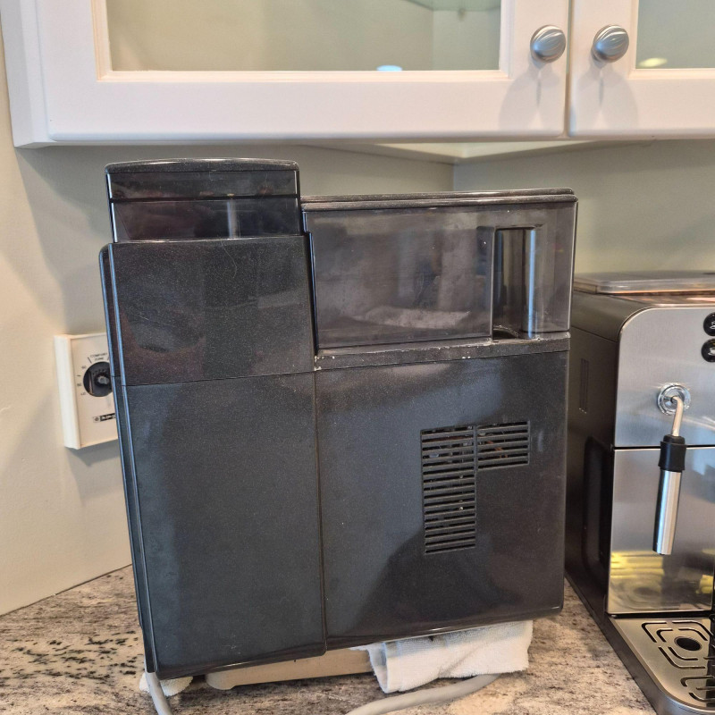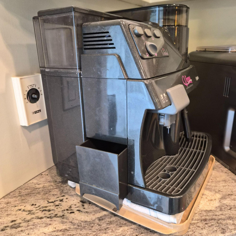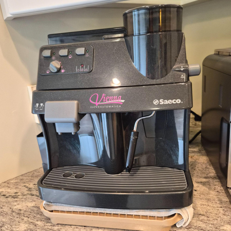 A classic Saeco Vienna Superautomatica (model SUP018) fully automatic espresso and coffee maker, known for its reliability and simple, user‑friendly operation. Features include an integrated bean hopper and grinder, front‑panel controls for brewing strength and volume, and a steam wand for frothing milk. The machine delivers espresso, coffee, and milk‑based drinks at the push of a button, making it a great everyday countertop brewer for home or office use. Presents in clean condition with normal signs of use.