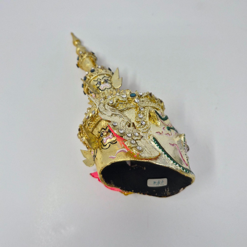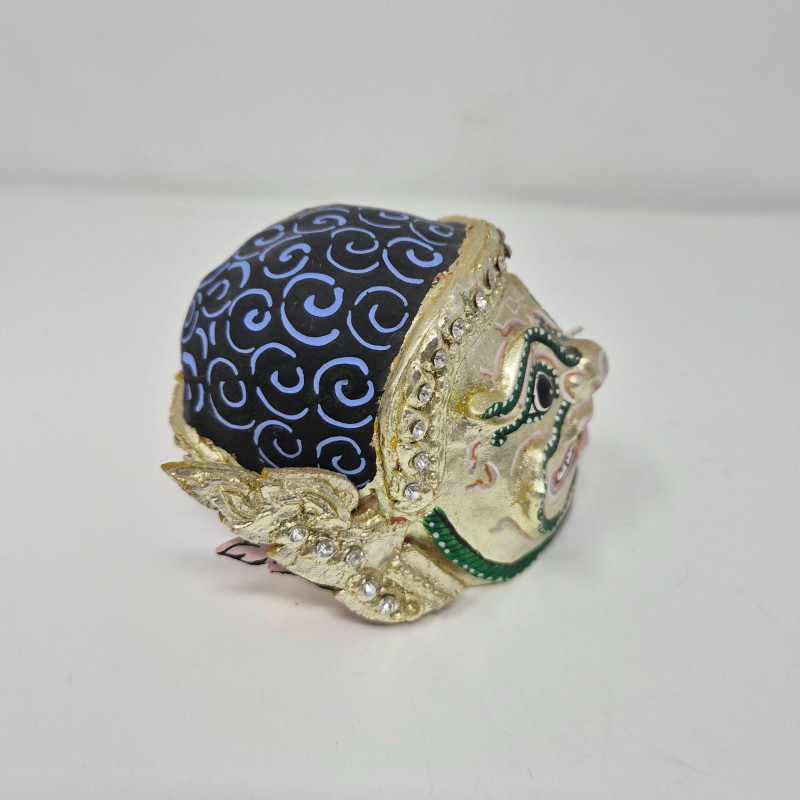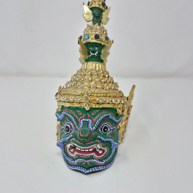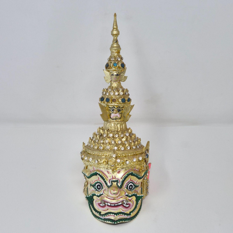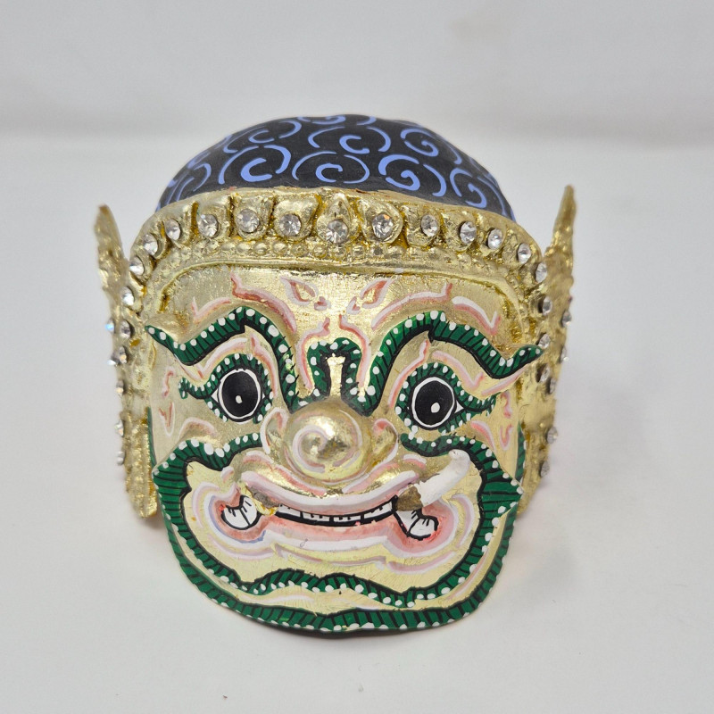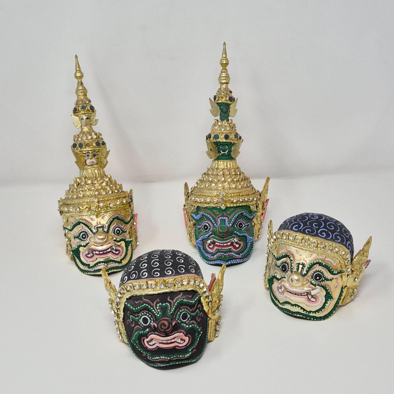 A vibrant set of four Thai Khon decorative paper‑mâché souvenir masks, each richly painted with traditional colors, gold gilding, expressive features, and ornate headdress details (a couple of the crystals may be missing). These masks echo the dramatic style of classical Thai performance art and make striking wall or shelf décor. Two larger masks, each approx. 10" tall Two smaller masks, each approx. 4" tall A bold, cultural accent grouping perfect for collectors of global art, theatrical décor, or handcrafted world‑market pieces.