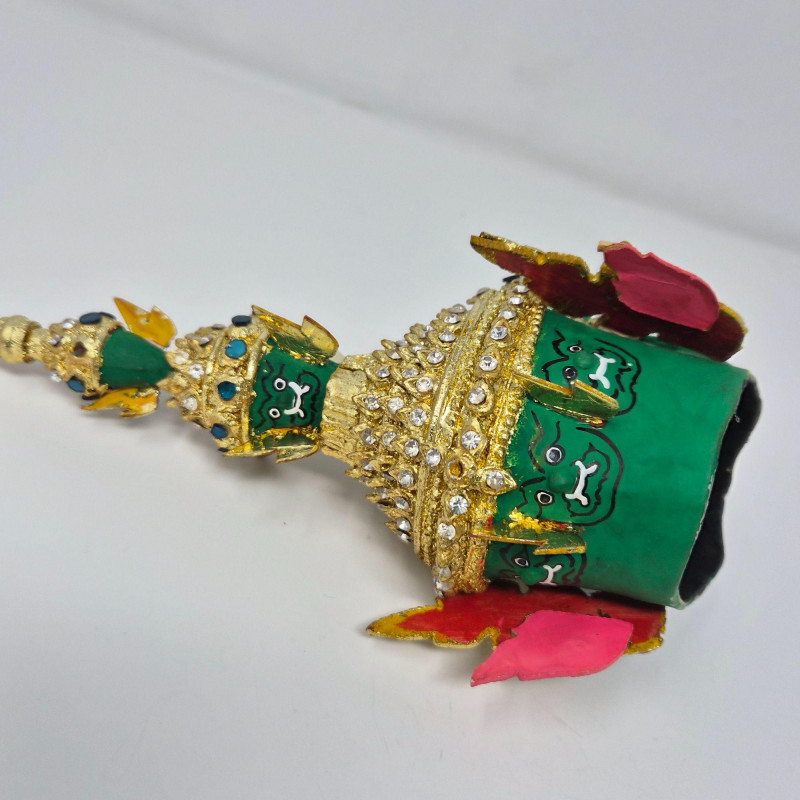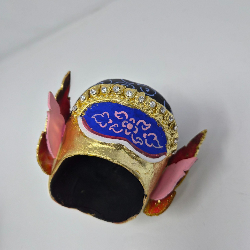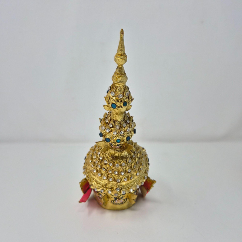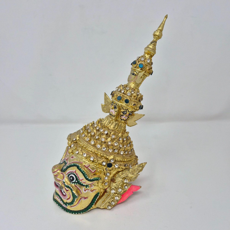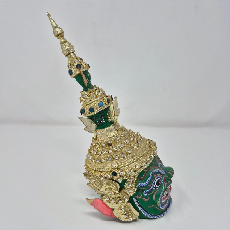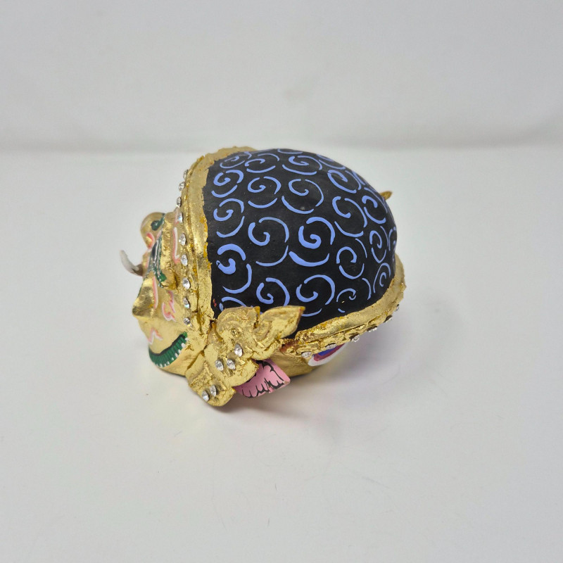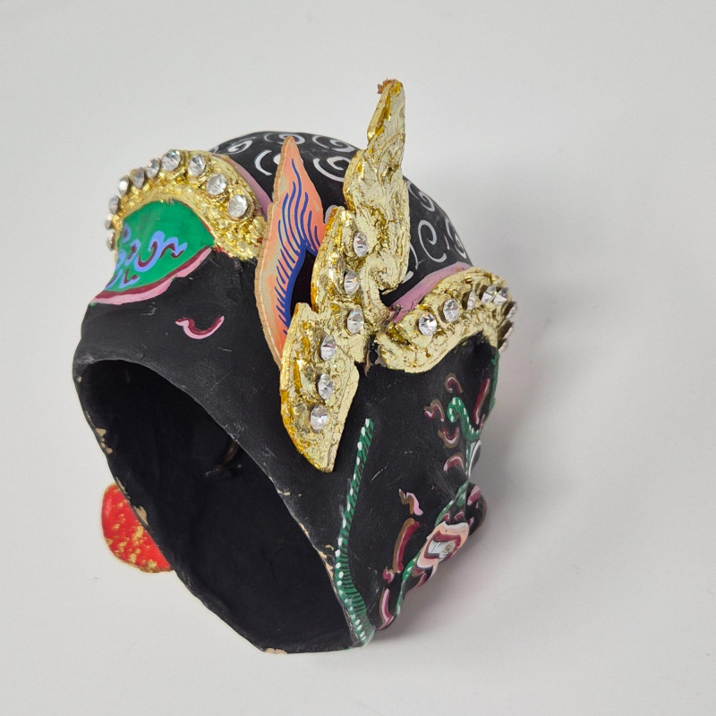 A vibrant set of four Thai Khon decorative paper‑mâché souvenir masks, each richly painted with traditional colors, gold gilding, expressive features, and ornate headdress details (a couple of the crystals may be missing). These masks echo the dramatic style of classical Thai performance art and make striking wall or shelf décor. Two larger masks, each approx. 10" tall Two smaller masks, each approx. 4" tall A bold, cultural accent grouping perfect for collectors of global art, theatrical décor, or handcrafted world‑market pieces.