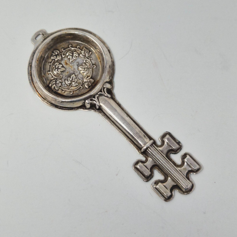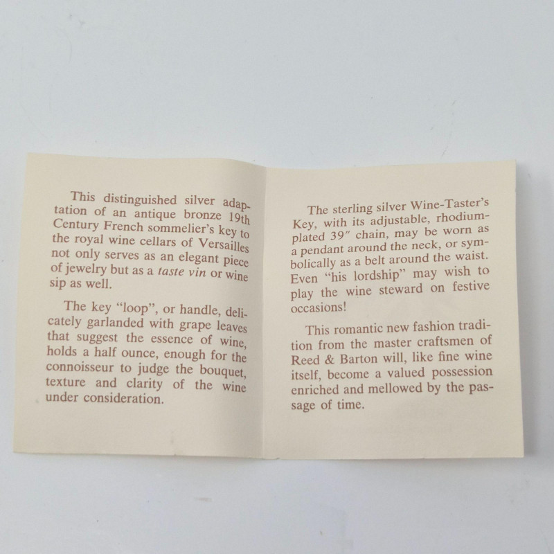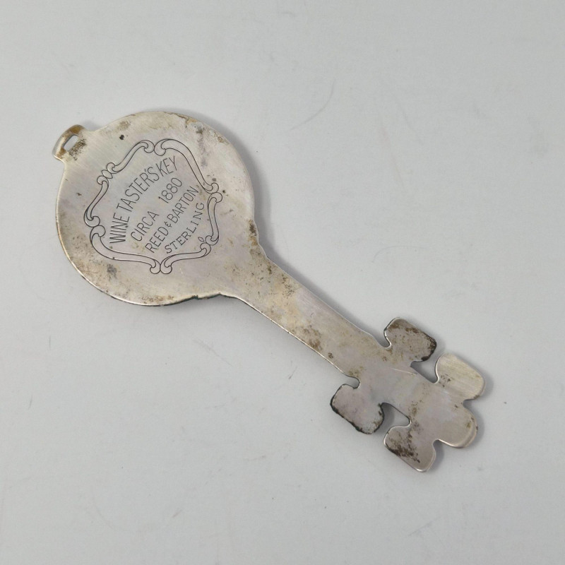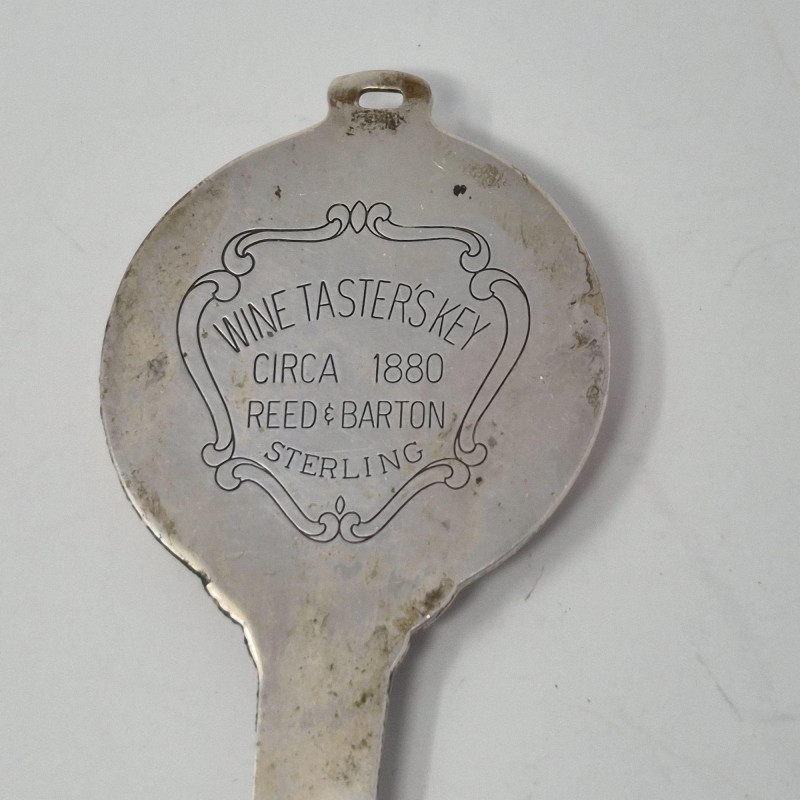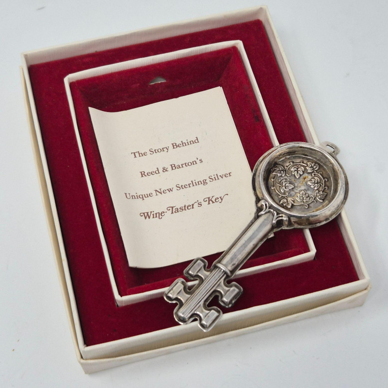 A curated trio of sterling and silver‑accent décor pieces, featuring a Reed & Barton sterling wine key, measuring 3.75" and stored in red velvet presentation box with its original display card. A bale will need to be added to the key if you use the included rectangular paper clip style chain as a necklace. The chain can also be used as a belt. This is a striking collectible accent for barware or silver enthusiasts. Also included: Rhodium‑plated silver‑tone chain, approx. 39" long Single weighted sterling candleholder, 2.5" tall with warm red interior Silver‑plated candle snuffer with elongated linked chain and tapered handle