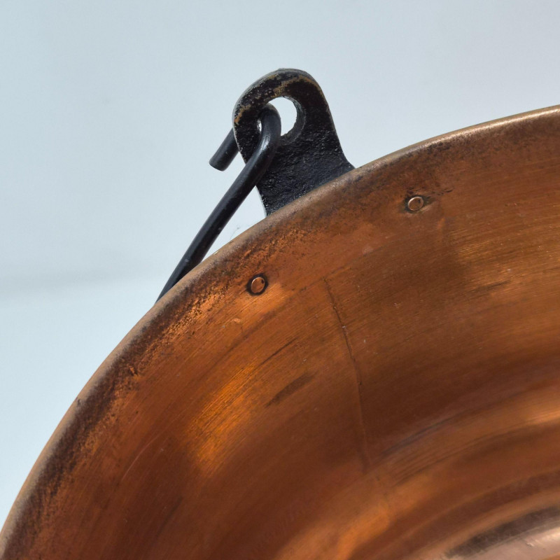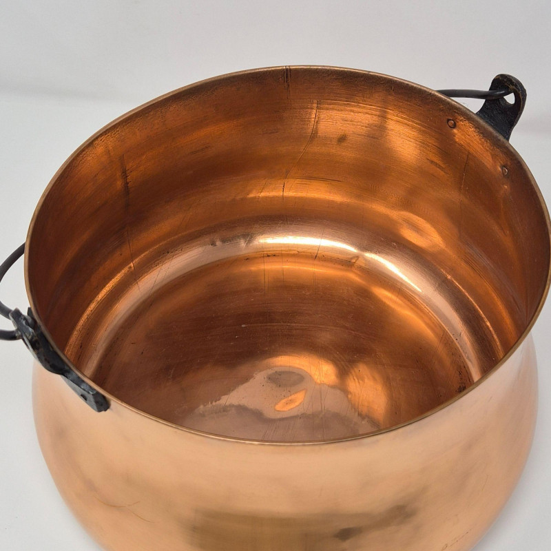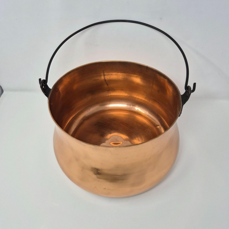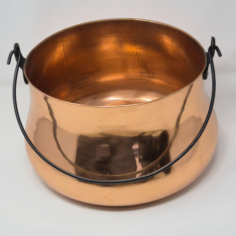 Handcrafted solid copper cauldron with a rounded body, flared rim, and sturdy black metal swing handle. The warm copper surface has a smooth, polished finish with natural variations typical of traditional Indian copperwork. A versatile piece suited for hearth décor, rustic kitchen styling, or as a functional vessel for display or storage. A classic example of traditional copper craftsmanship.
