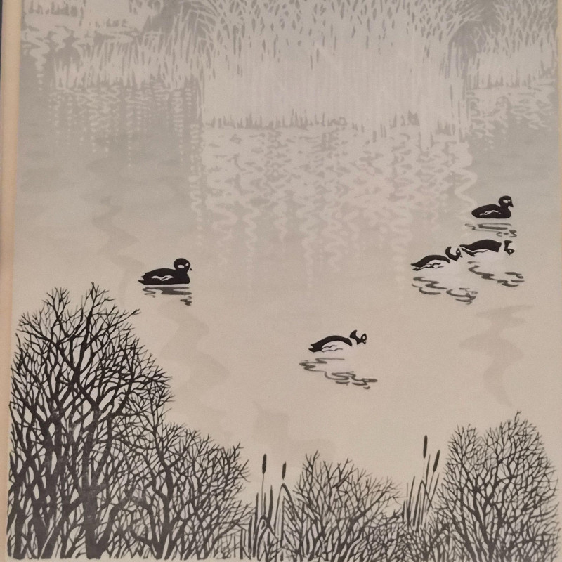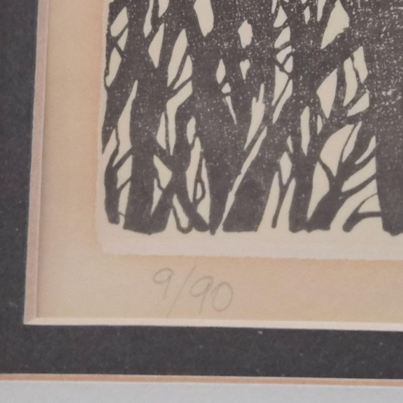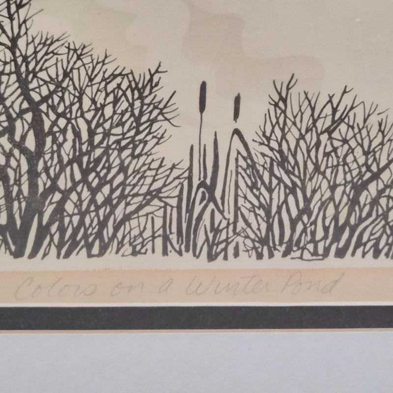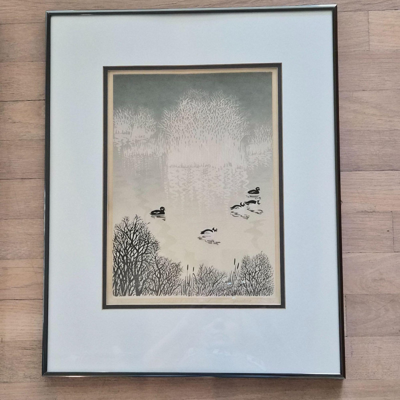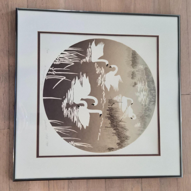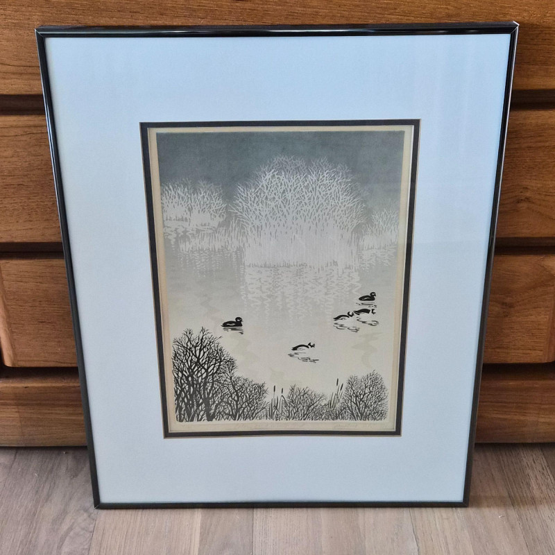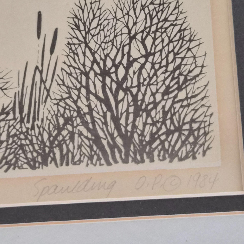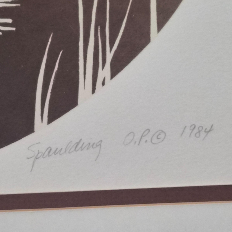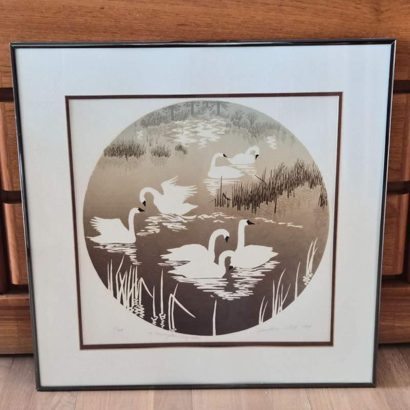 A calming pair of signed Spaulding nature prints, each framed in a dark metal‑colored frame for a clean, contemporary finish. The duo features two tranquil water scenes: 1984 20" × 20" swan print — a circular composition of swans gliding through reeds, rendered in soft earth tones. Numbered 9/55. 1984 16" × 20" duck print — a peaceful waterscape with ducks drifting across reflective water, framed by delicate shoreline branches. Numbered 9/90. Together, they create a harmonious, nature‑inspired wall display perfect for bedrooms, living rooms, or any space that benefits from a quiet, serene touch. Lewis and Nancy Spaulding are a husband‑and‑wife serigraphy team who became known throughout the Pacific Northwest for their nature‑driven, poetic serigraphs. They began printmaking together in the early 1970s and continued producing editions for decades, often signing their works individually but exhibiting as a duo. Their studio was located near the San Juan Islands, and they were known for welcoming visitors and collectors.