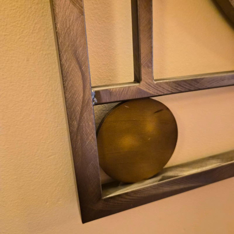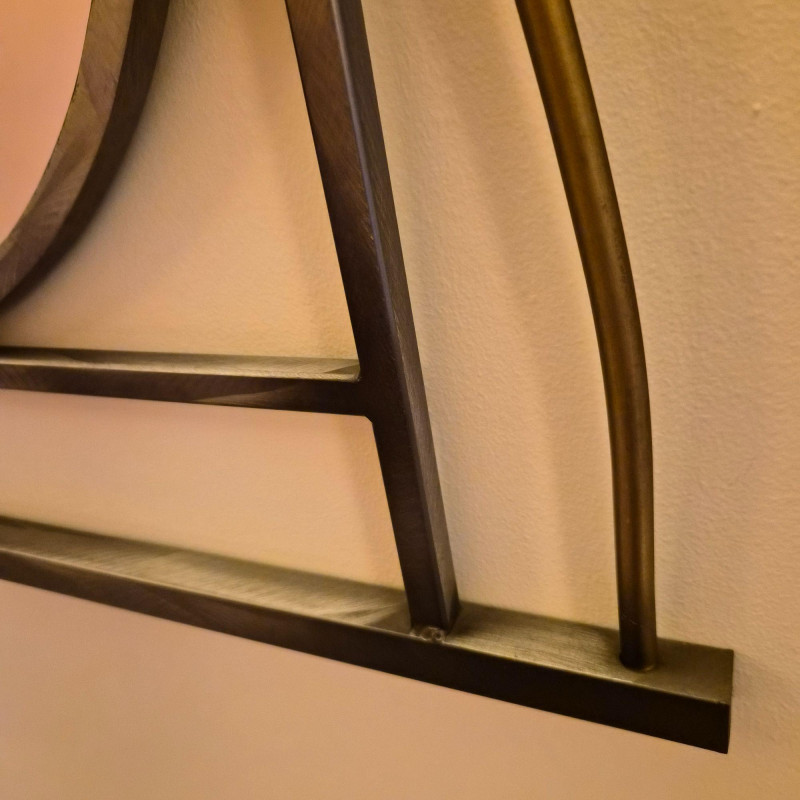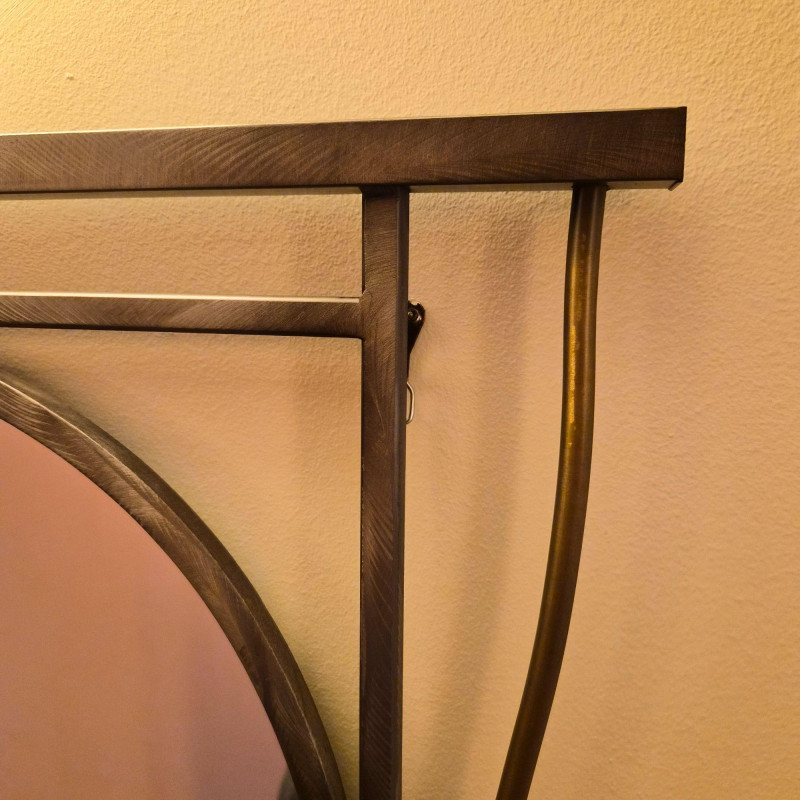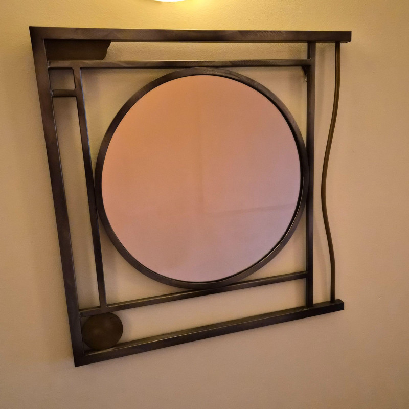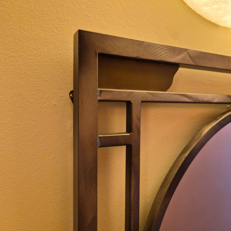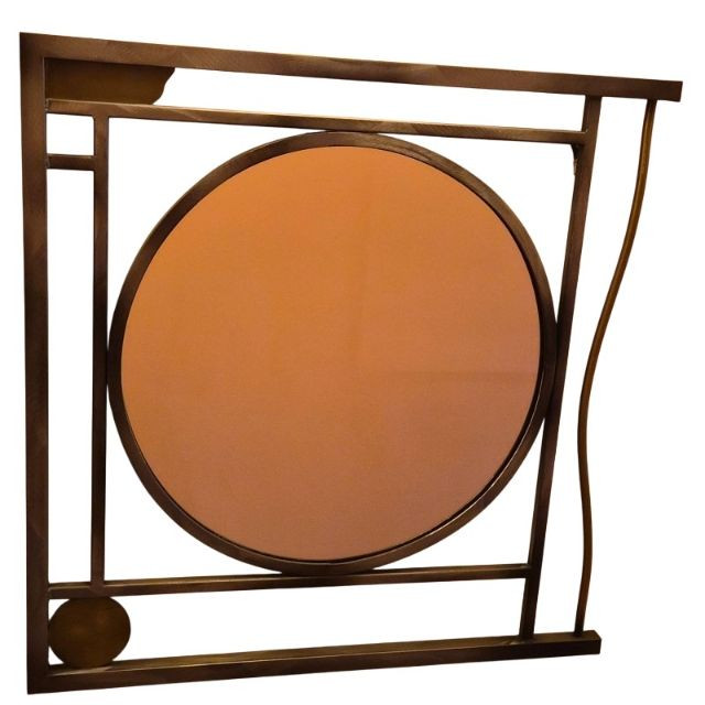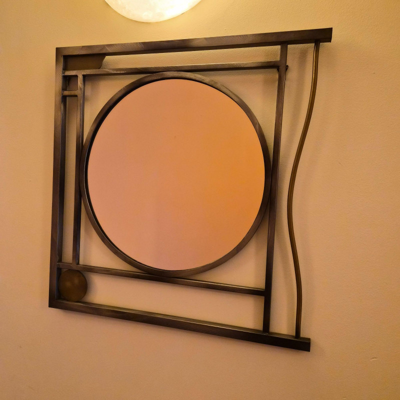 An artful modern wall mirror featuring a sculptural, geometric metal frame composed of intersecting straight and curved lines. The large central circular mirror is complemented by a smaller circular element integrated into the lower portion of the design, creating an asymmetrical, contemporary focal point. Finished in a warm bronze‑tone metal that adds depth and modern character. A distinctive statement piece ideal for entryways, living rooms, or modern eclectic interiors.