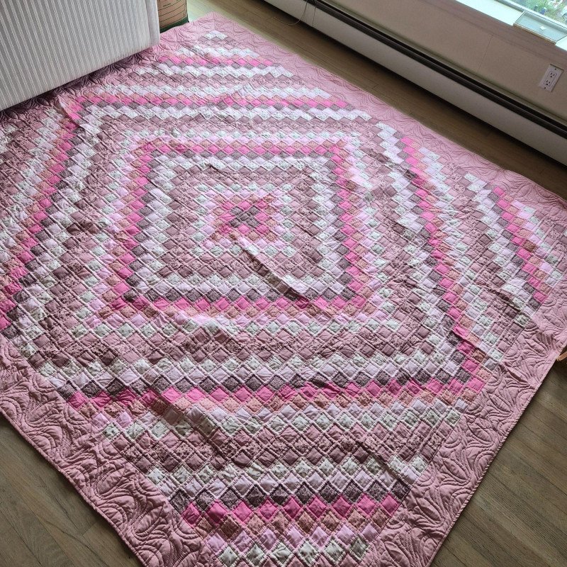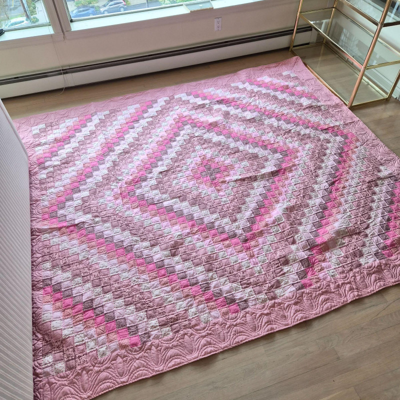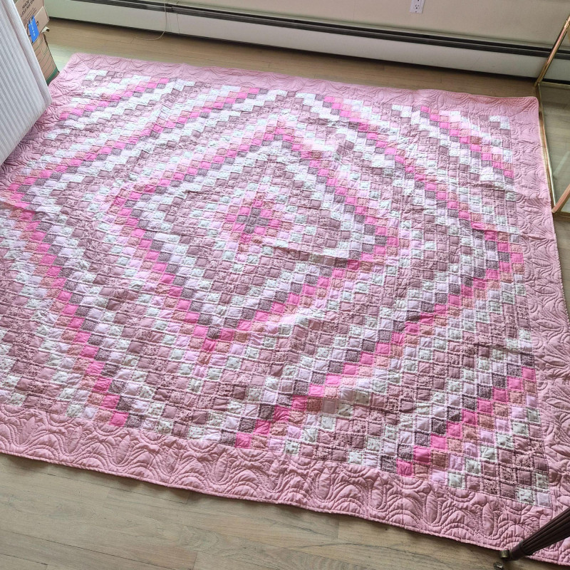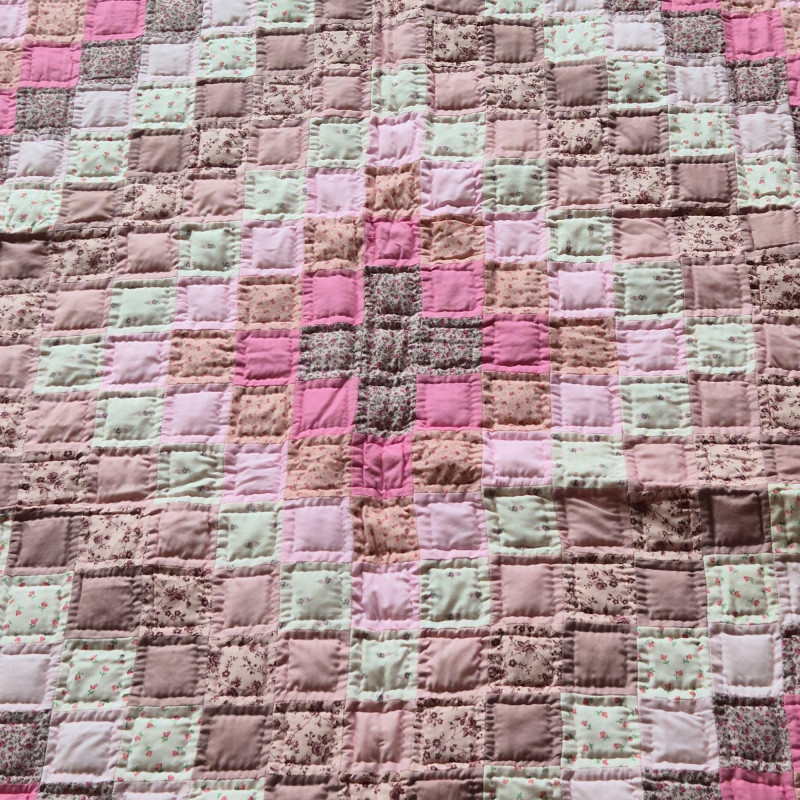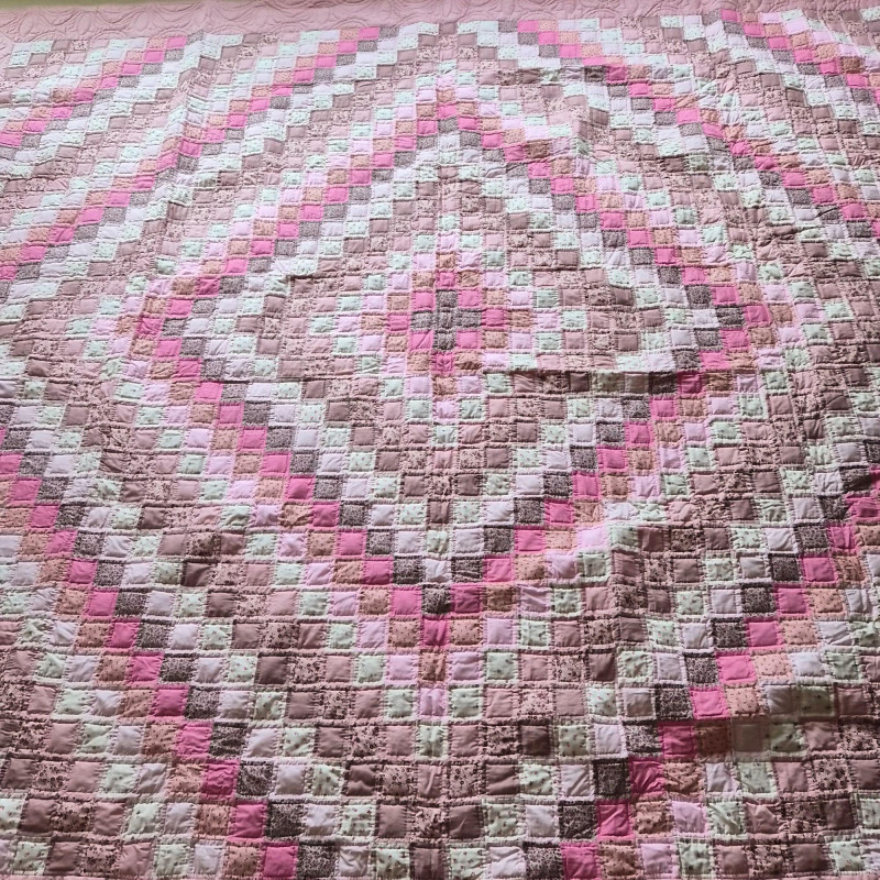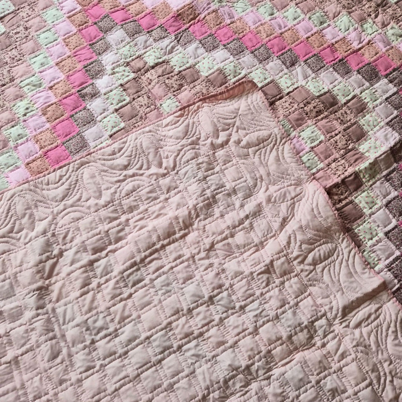 A beautifully crafted vintage patchwork quilt in a soothing palette of soft pastels—pinks, browns, beige, and mint—along with the central darker‑toned motif and the mix of floral and patterned prints, small squares arranged in a striking geometric layout. Small square patches radiate outward in concentric diamond formations, creating a subtle gradient effect that shifts gently across the quilt. The outer border features a decorative stitched motif that adds texture and a finished, heirloom touch. Generously sized at 104" × 90", ideal for a queen or full bed, or for display as a statement textile. A lovely piece for collectors of handmade quilts, lovers of soft‑palette décor, or anyone drawn to traditional patchwork craftsmanship.