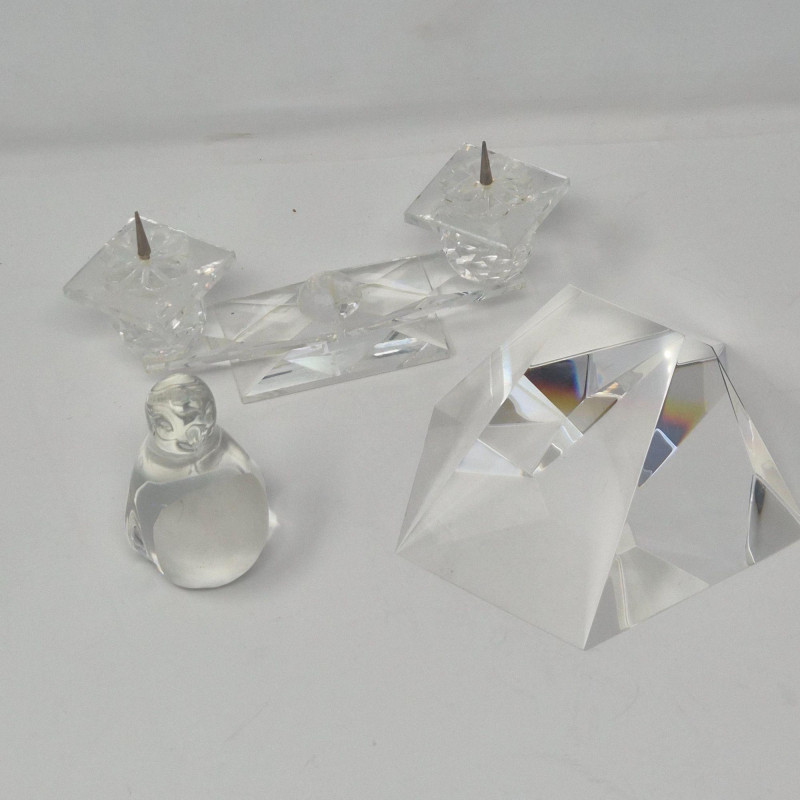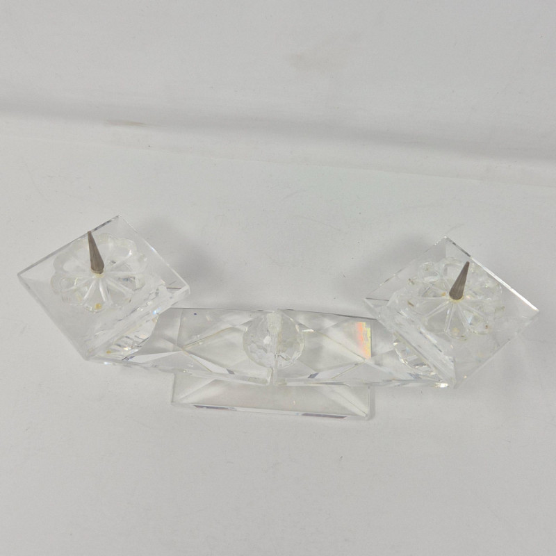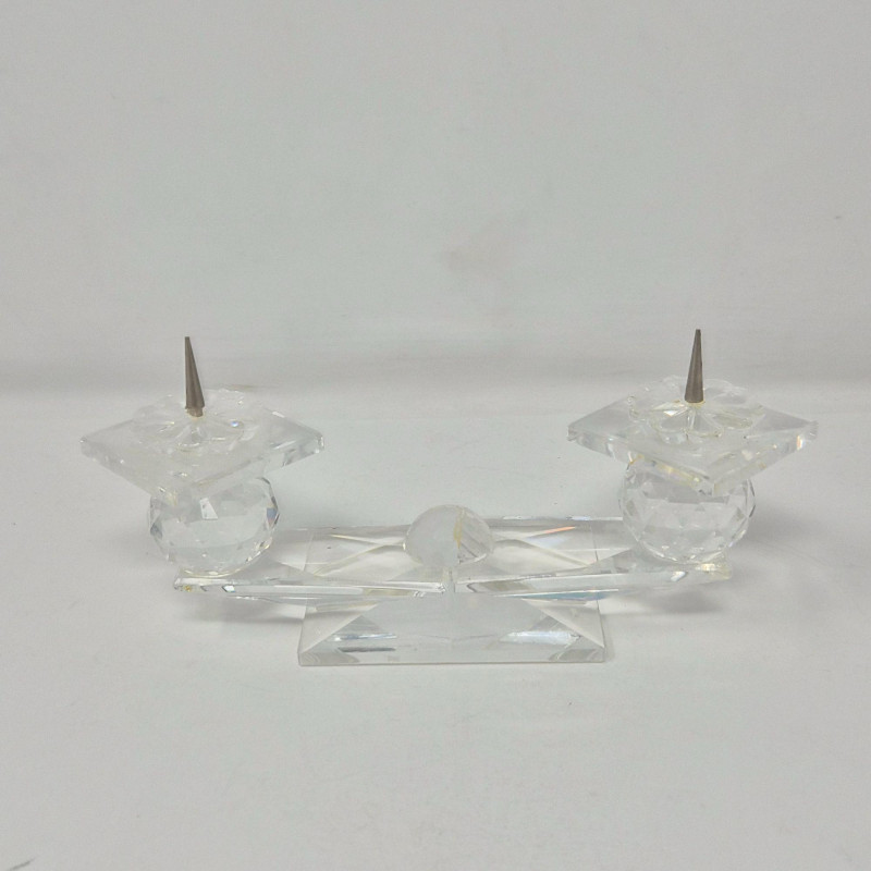 Sleek double candle holder with squared bases and metal spikes for taper candles. Modern, minimal, and highly reflective. A crisp, luminous grouping ideal for collectors of fine crystal or for adding elegant sparkle to any display.