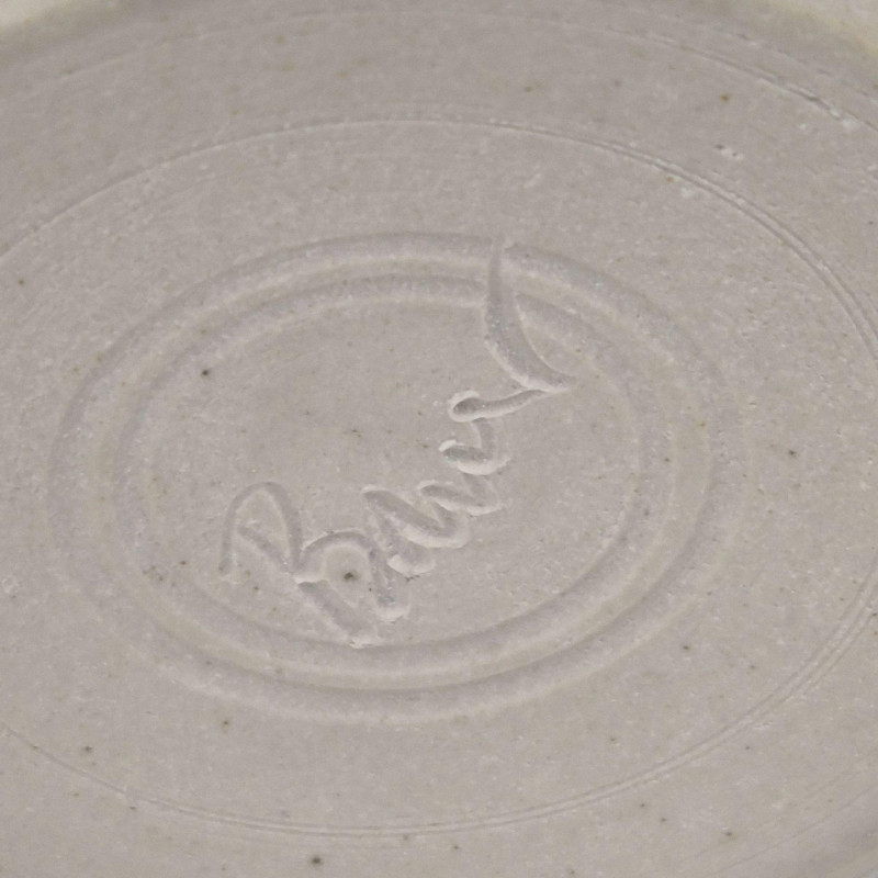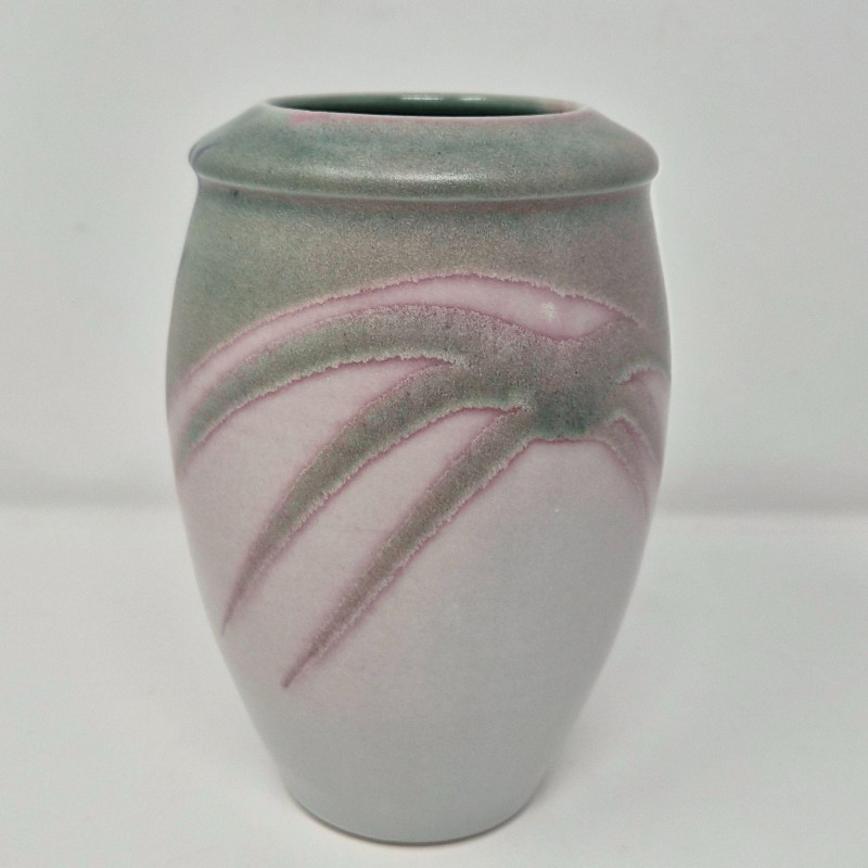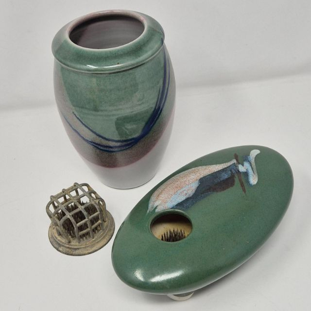A sculptural trio for floral arranging and display, blending handmade pottery with classic ikebana tools: Signed Bauer Pottery Vase — 6.5"