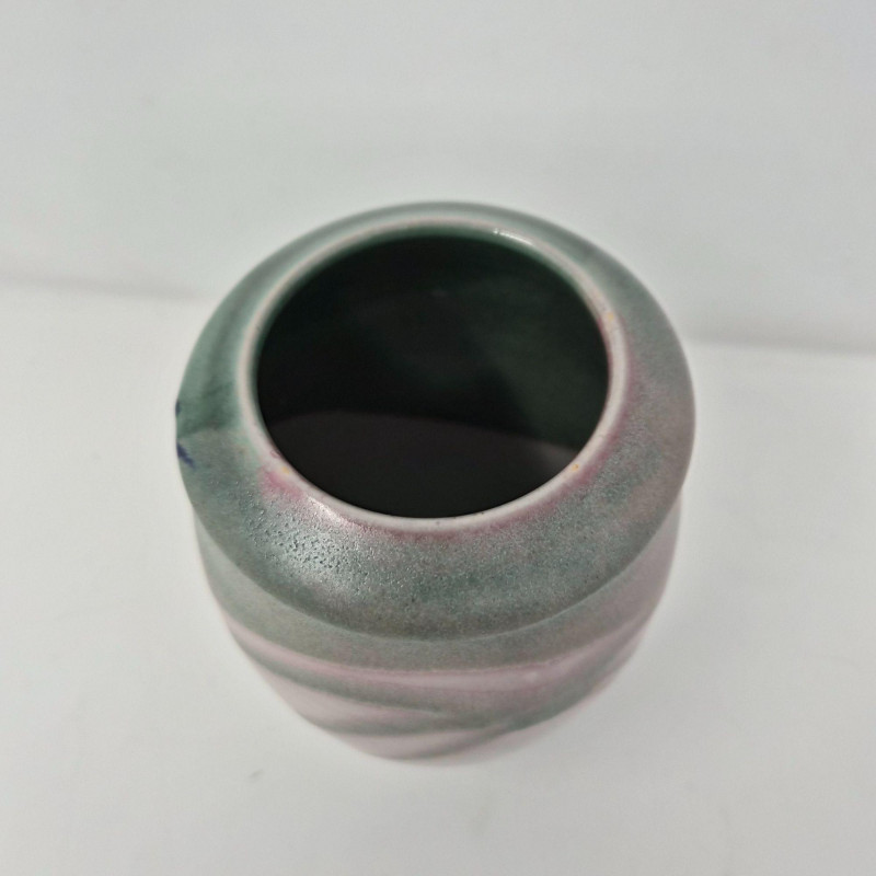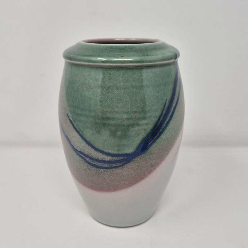 Wheel‑thrown vase with layered green, blue, and purple glaze. Artist‑signed; ideal for single stems or small sculptural arrangements. Ikebana Pottery Vase with Frog — 8" × 4.5"