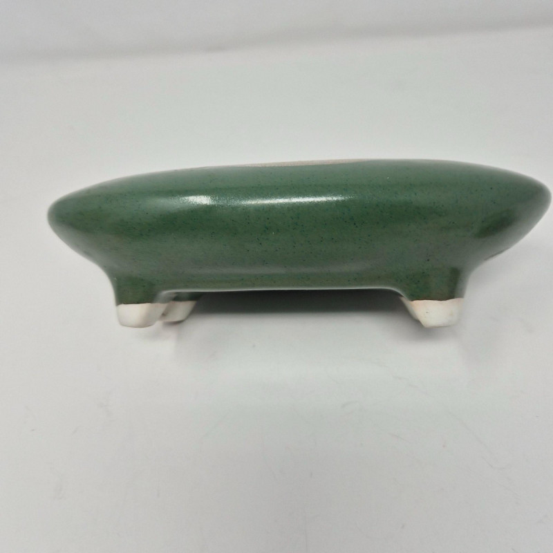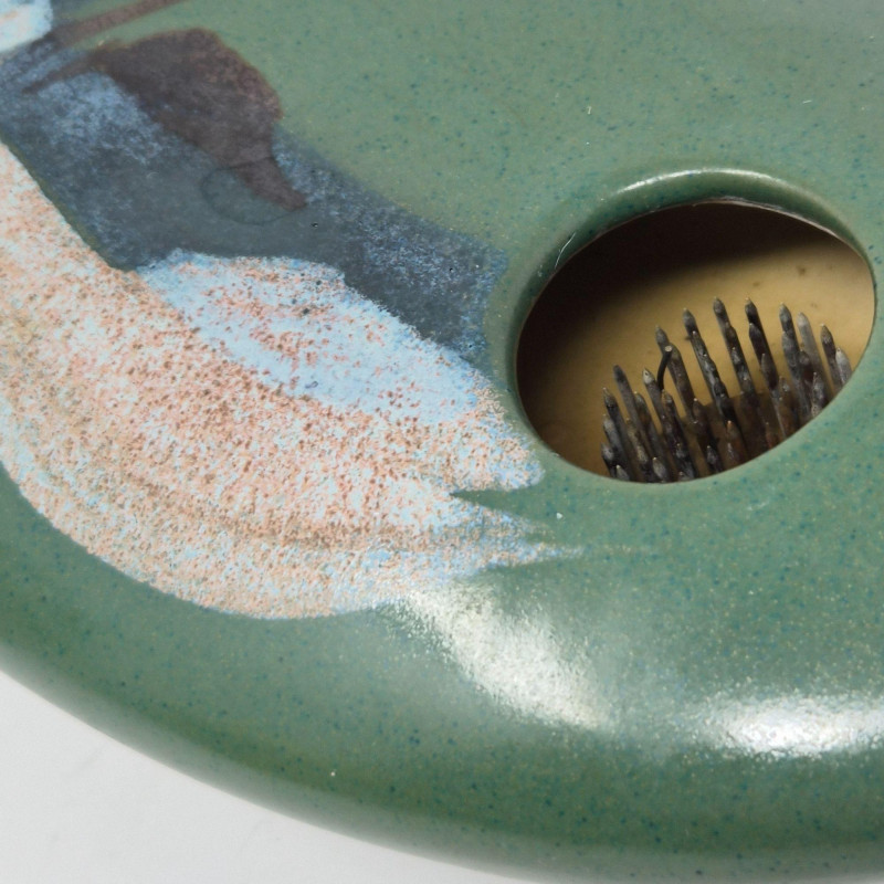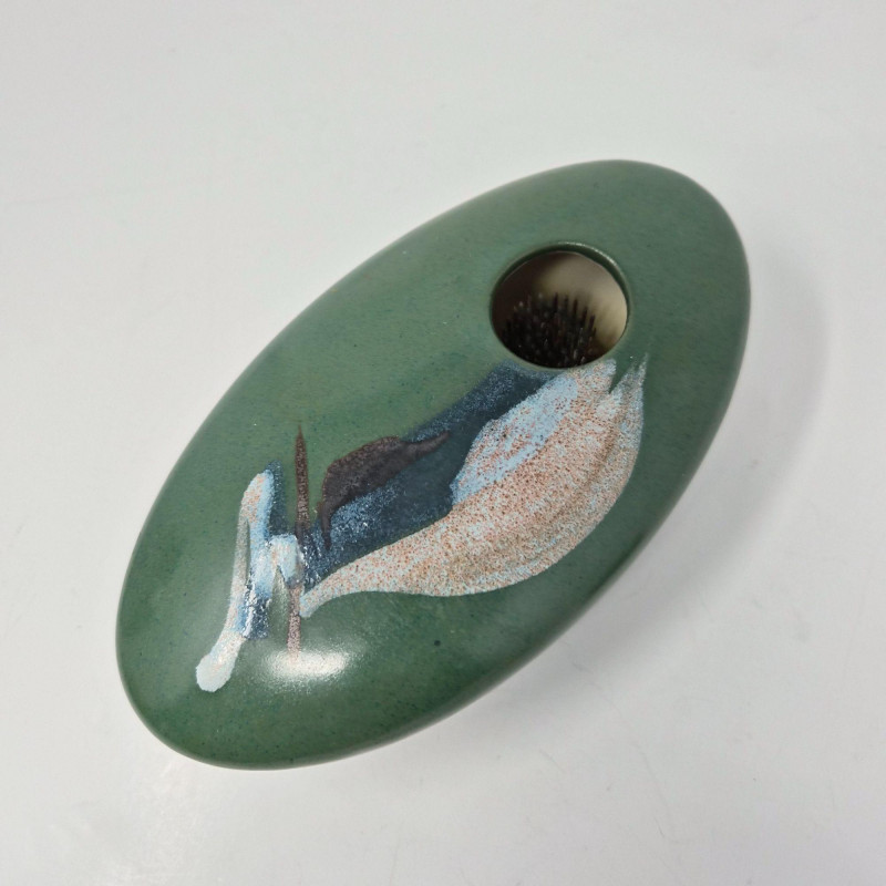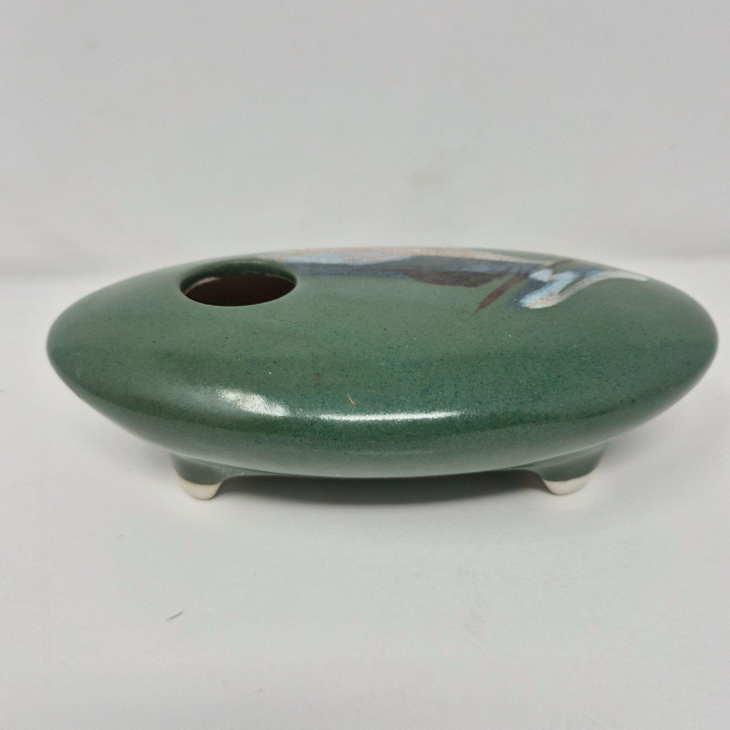 Flat oval ikebana vessel with central opening and built‑in metal flower frog. Features painterly glaze work in greens, blues, and earth tones. Bottom feet. Vintage Metal Flower Frog