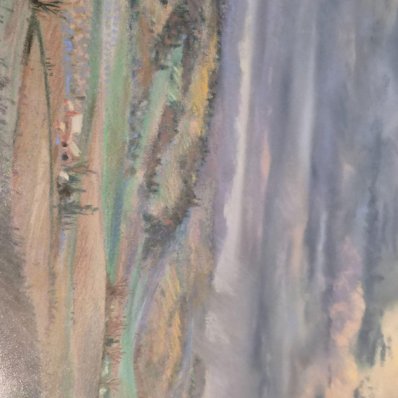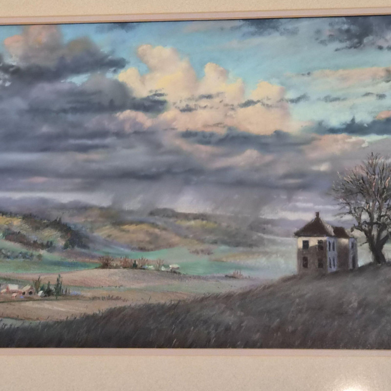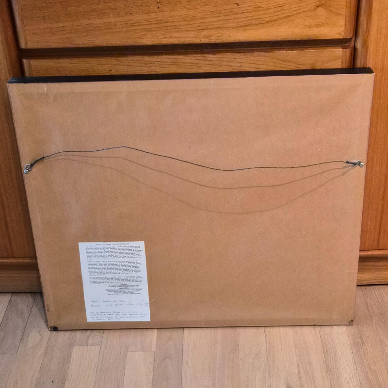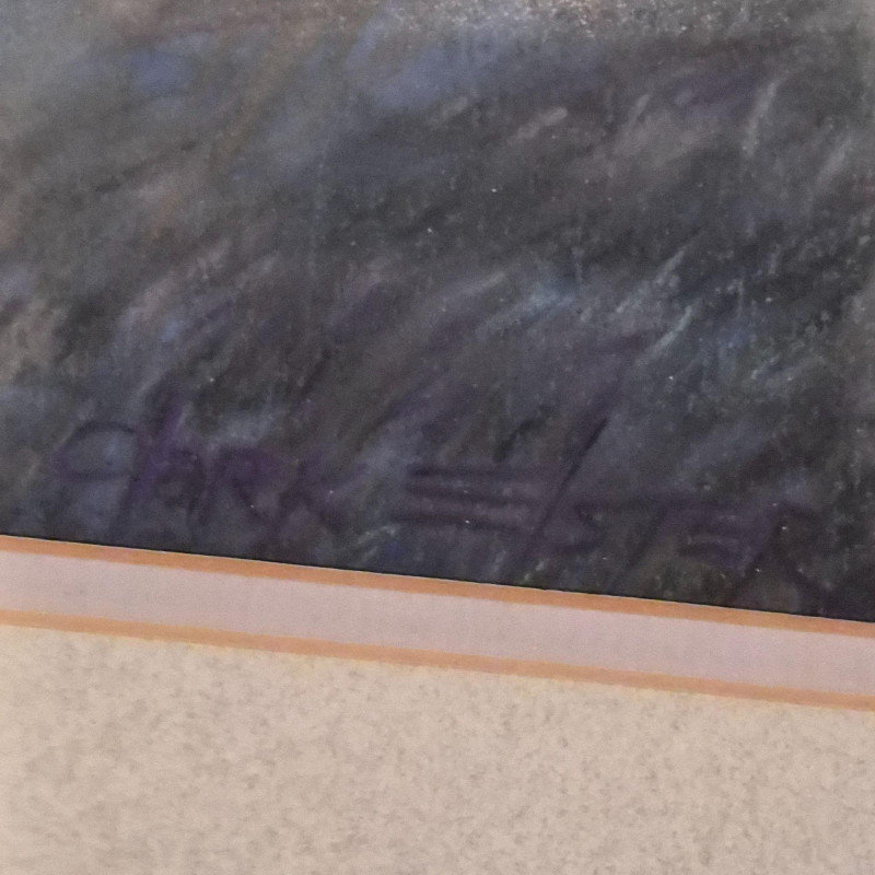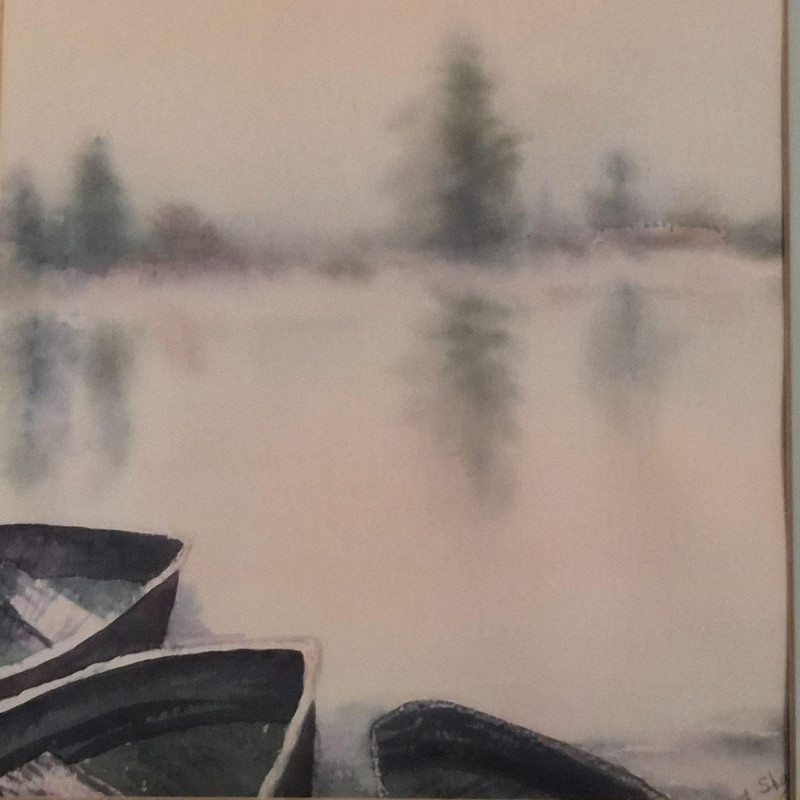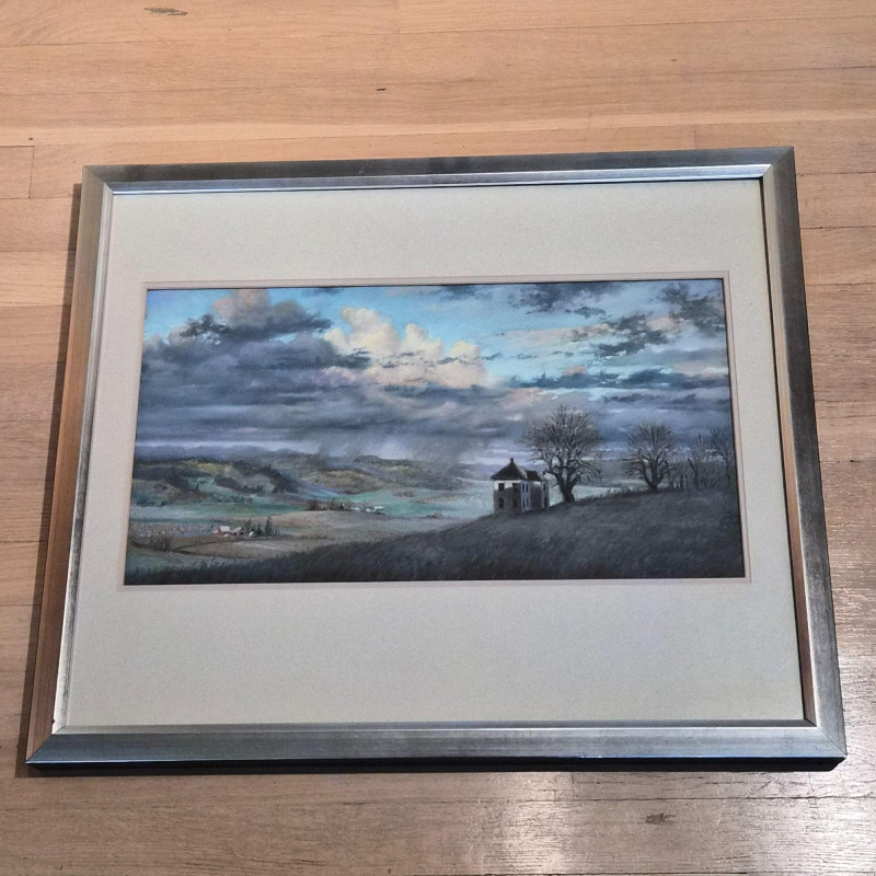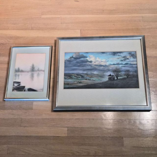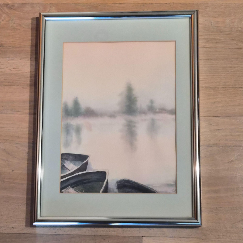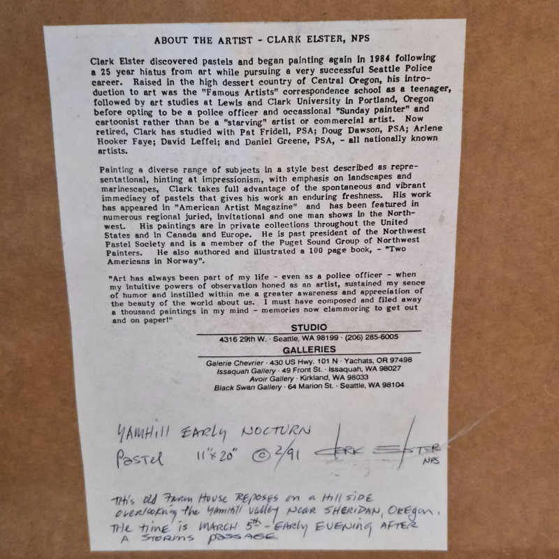 An impressionist-style watercolor painting Ethereal Morning: 19th Century Style Impressionist Watercolor - Foggy Landscape This evocative watercolor captures a moment of profound stillness. The artist utilizes a masterful impressionist technique to render several dark rowing boats anchored in the foreground, their forms grounded against a soft, atmospheric mist. Beyond the water, silhouetted trees emerge from the fog, creating a sense of depth and quiet mystery. Signature Note: The piece is signed by the artist, though the signature is currently tucked partially beneath the frame, adding an air of undiscovered provenance. Measures 12" x 16". "Yamhill Early Nocturn" by Clark Elster (1991) - Atmospheric Oregon Landscape Description: A stunning example of Northwest regionalism, this original pastel by Clark Elster titled "Yamhill Early Nocturn" (February 1991) transports the viewer to the rolling hillsides of Oregon’s Yamhill Valley. The composition features a lone farmhouse braced against the drama of a stormy day. Elster’s use of light and shadow perfectly captures the "nocturn" transition—where the heavy, brooding sky meets the vibrant, wind-swept greens of the valley. Measures with frame 26" x 22".