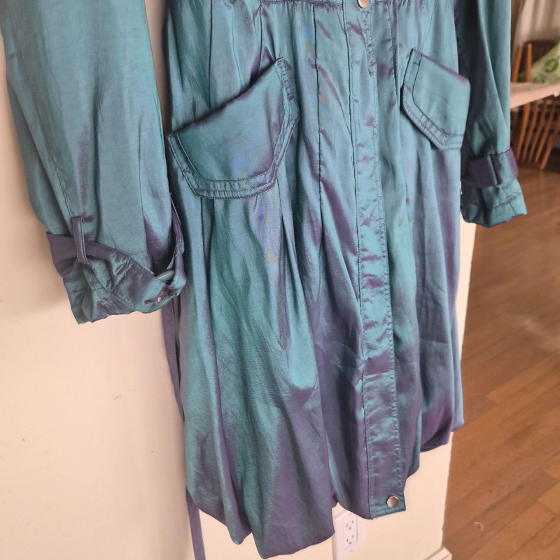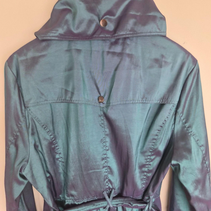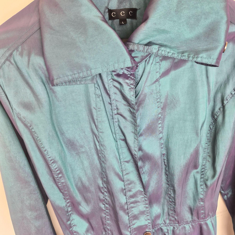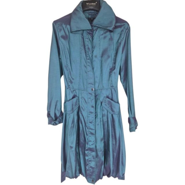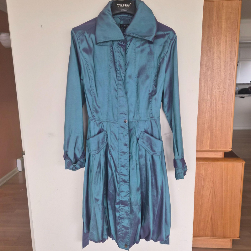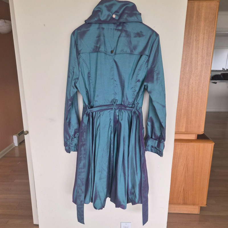 Striking vintage‑style iridescent coat by CCC, designed by Samuel Dong, featuring a dramatic jewel‑toned finish that shifts between teal, aquamarine, and subtle purple hues. Crafted from a water‑resistant iridescent fabric, likely a polyester‑nylon blend, this piece has a luminous, metallic sheen with a color‑changing effect. The coat is designed with a signature bubble hem that creates a voluminous fit‑and‑flare silhouette, complemented by a large convertible collar for versatile styling. Midi length with sculptural shaping gives the garment a bold yet wearable presence, functioning as either a trench‑style coat or coat dress. A distinctive statement piece with architectural lines and eye‑catching shimmer. Size Large.