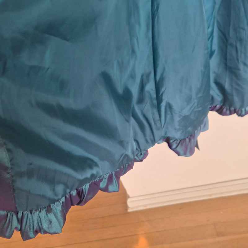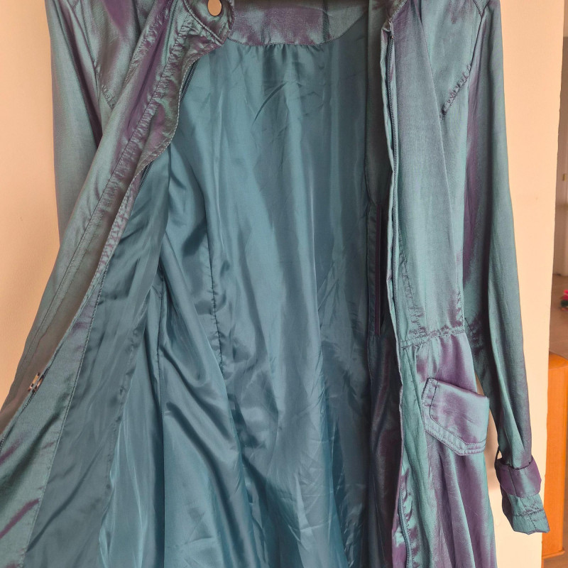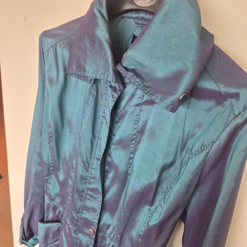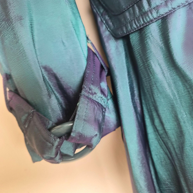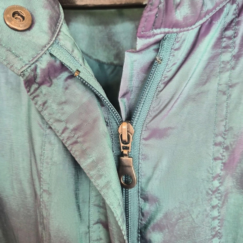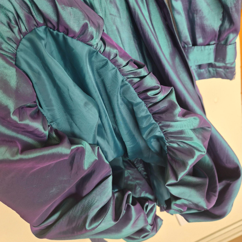 Striking vintage‑style iridescent coat by CCC, designed by Samuel Dong, featuring a dramatic jewel‑toned finish that shifts between teal, aquamarine, and subtle purple hues. Crafted from a water‑resistant iridescent fabric, likely a polyester‑nylon blend, this piece has a luminous, metallic sheen with a color‑changing effect. The coat is designed with a signature bubble hem that creates a voluminous fit‑and‑flare silhouette, complemented by a large convertible collar for versatile styling. Midi length with sculptural shaping gives the garment a bold yet wearable presence, functioning as either a trench‑style coat or coat dress. A distinctive statement piece with architectural lines and eye‑catching shimmer. Size Large.