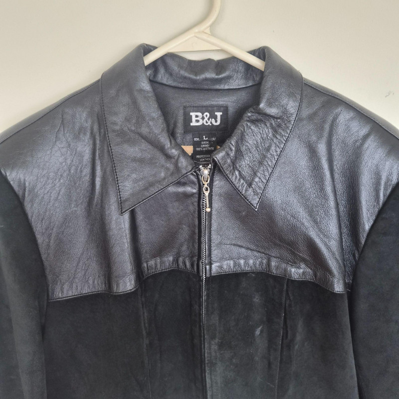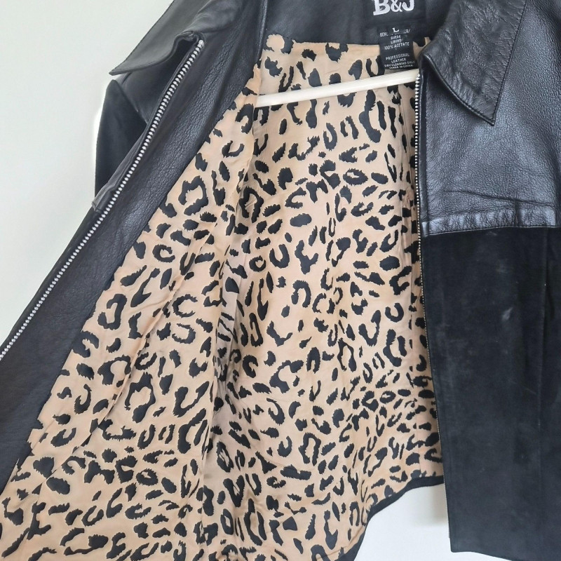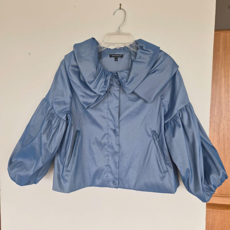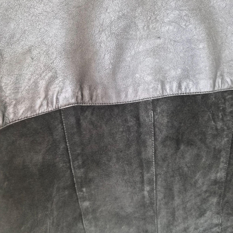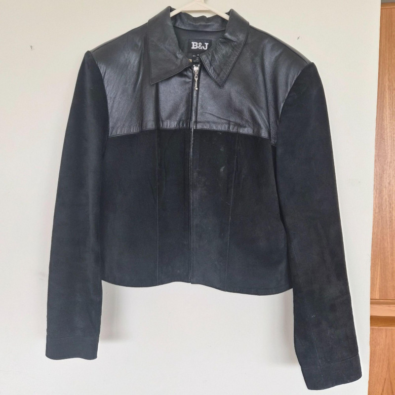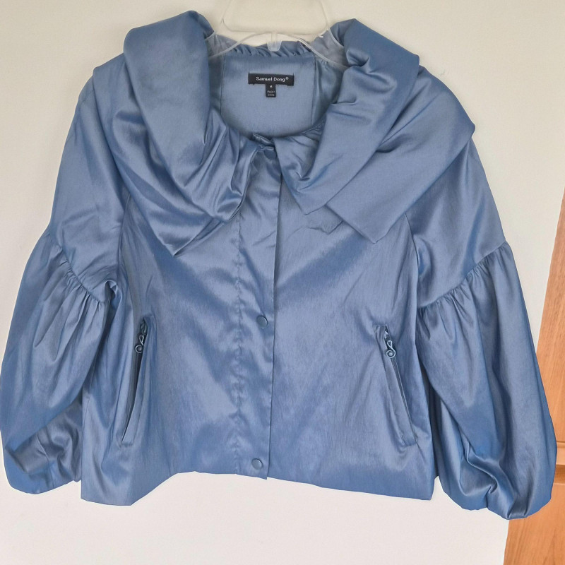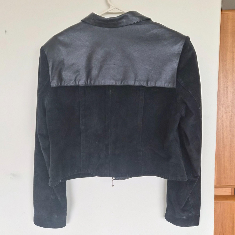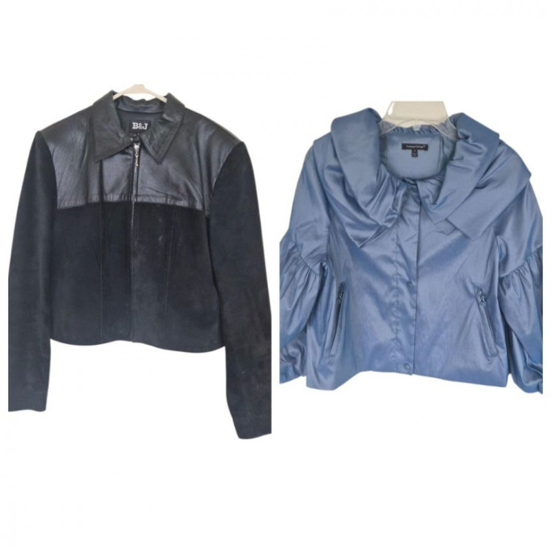 Two designer waist coats offered together, showcasing contrasting textures and distinctive style. • BJ Leather short black jacket featuring a leather upper and suede lower panel, accented with an animal print lining. Cropped silhouette with a bold material contrast. Size Large. • Samuel Dong shimmer waist coat in a periwinkle iridescent finish with a lightly padded, puffy construction. Eye‑catching sheen with sculptural appeal. Size Medium. An eclectic pairing of statement outerwear highlighting unique fabrics and design details.