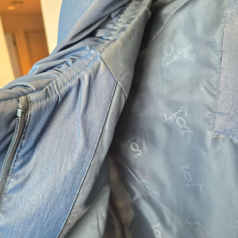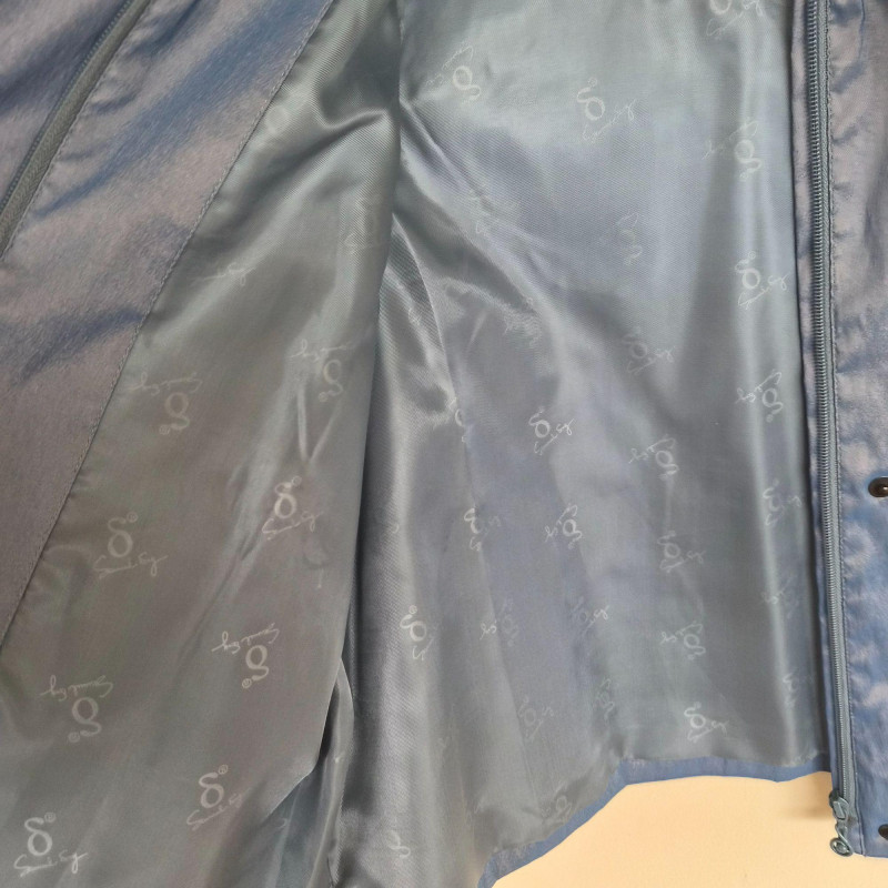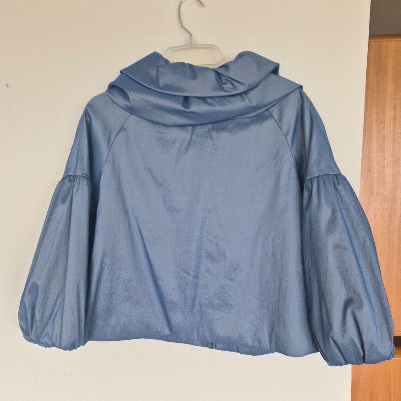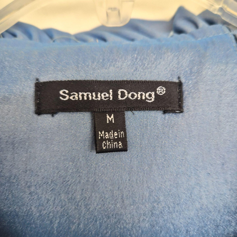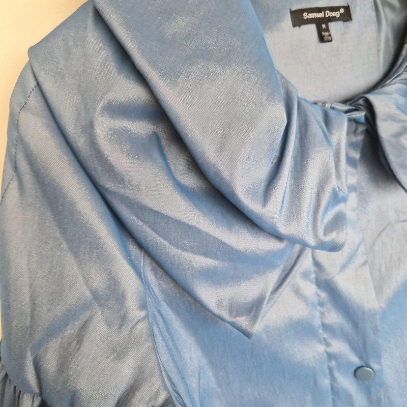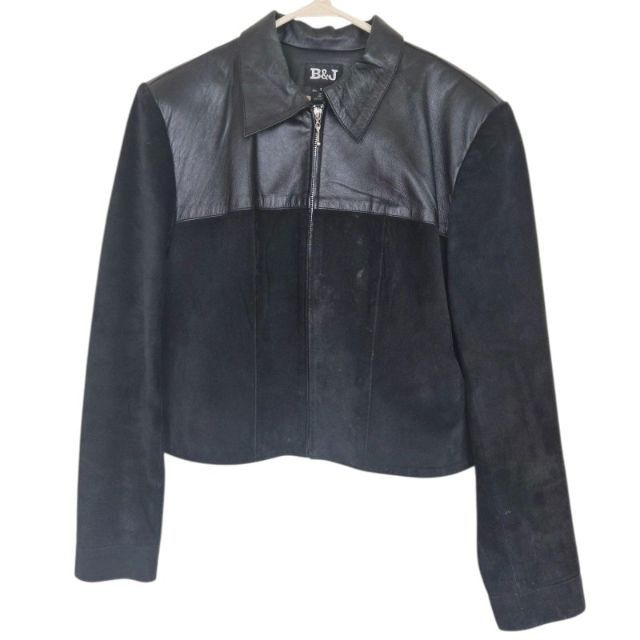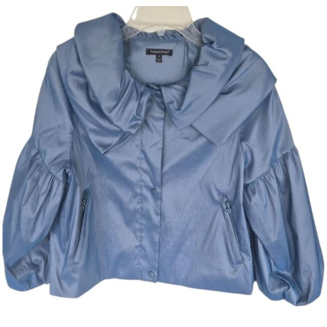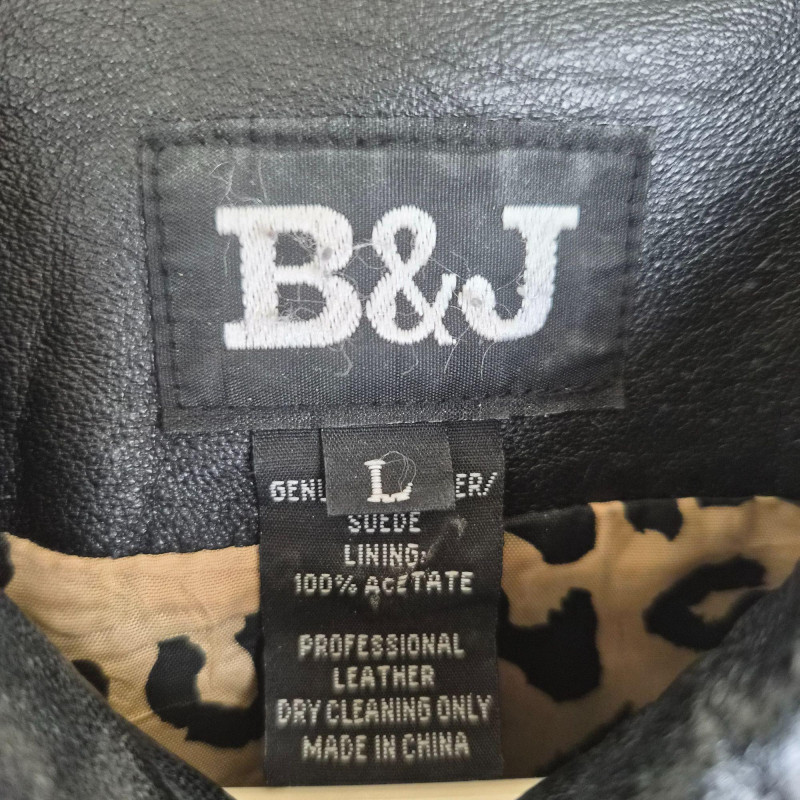 Two designer waist coats offered together, showcasing contrasting textures and distinctive style. • BJ Leather short black jacket featuring a leather upper and suede lower panel, accented with an animal print lining. Cropped silhouette with a bold material contrast. Size Large. • Samuel Dong shimmer waist coat in a periwinkle iridescent finish with a lightly padded, puffy construction. Eye‑catching sheen with sculptural appeal. Size Medium. An eclectic pairing of statement outerwear highlighting unique fabrics and design details.