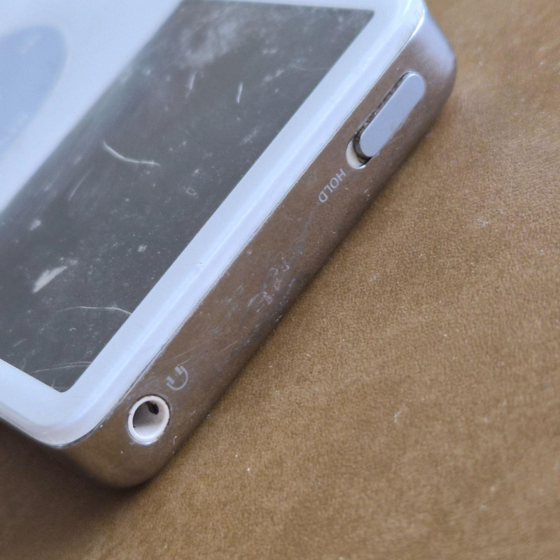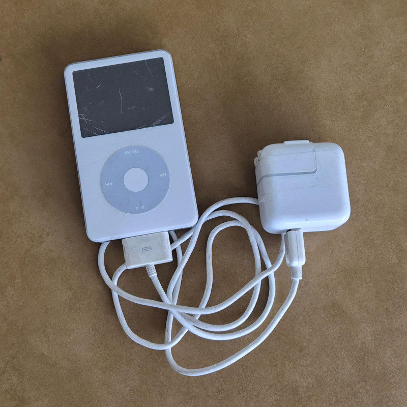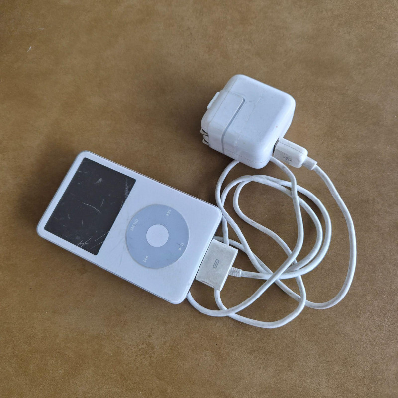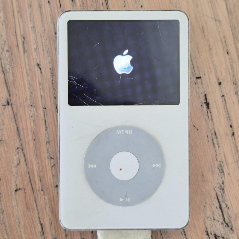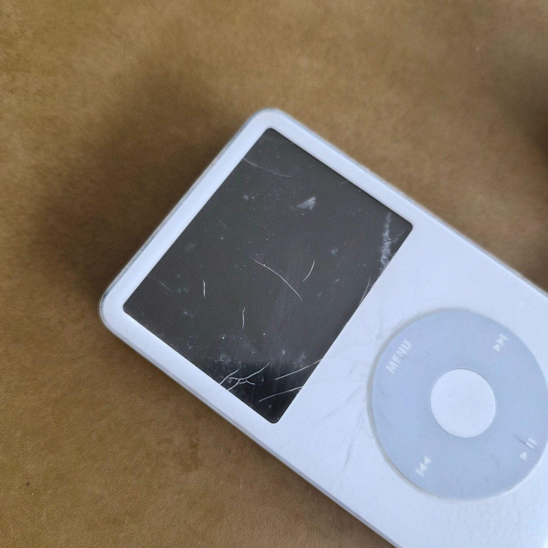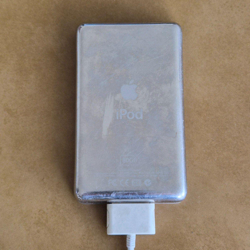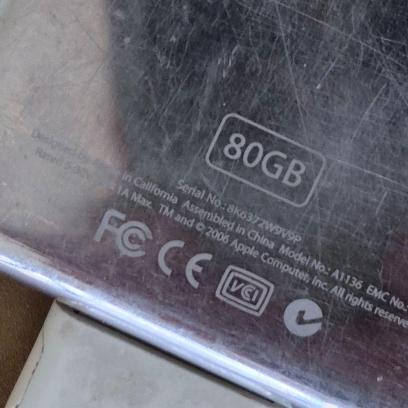 5th generation Apple iPod with 80GB storage capacity. The device powers on and displays normal surface scratches and wear from prior use. Classic white finish with click wheel interface. No additional testing has been performed beyond powering on. Cosmetic wear is visible but consistent with age and use. A collectible and functional example of Apple’s iconic portable music player.