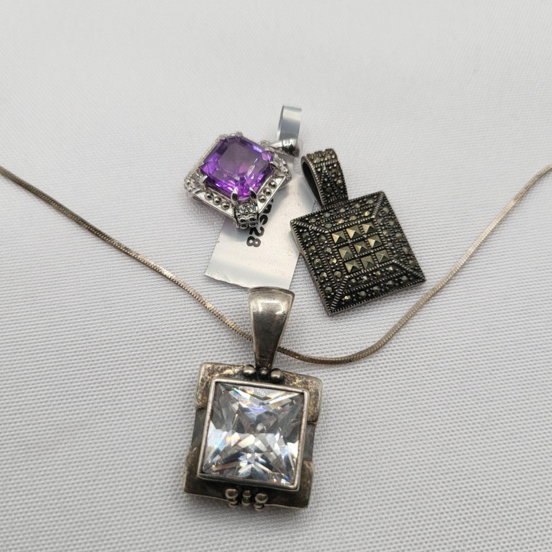 Lot # 69 - Trio Gemstone Pendants & Sterling Silver - Amethyst, Quartz, Marcasite Starting Bid: $ 10.00 Bids: This sale will end in: |