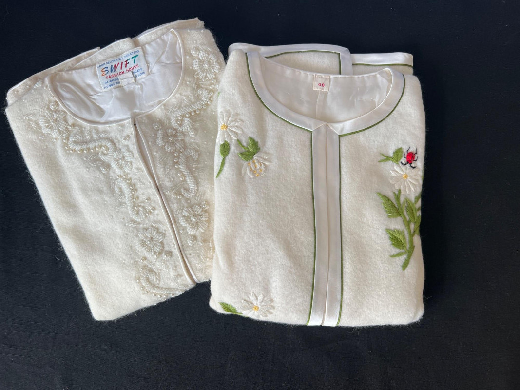 Lot # 166 - Two Vintage Cream Cardigans — Embroidered & Beaded Floral Designs Starting Bid: $ 5.00 Bids: Bidding starts in: |