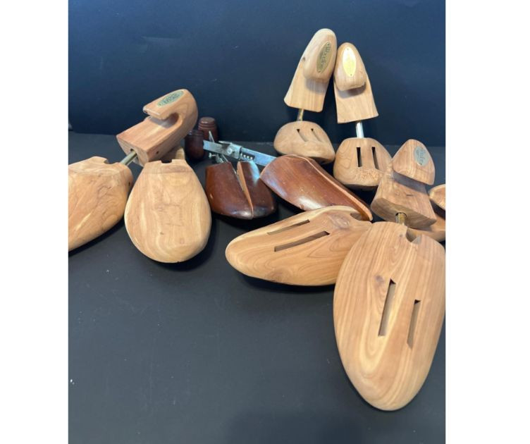 A grouped lot of four pairs of classic wooden shoe trees, ideal for maintaining the shape and longevity of leather shoes. Each pair features a natural wood finish with spring‑loaded tension to support the toe box and heel. Perfect for collectors, resellers, or anyone who appreciates proper shoe care.