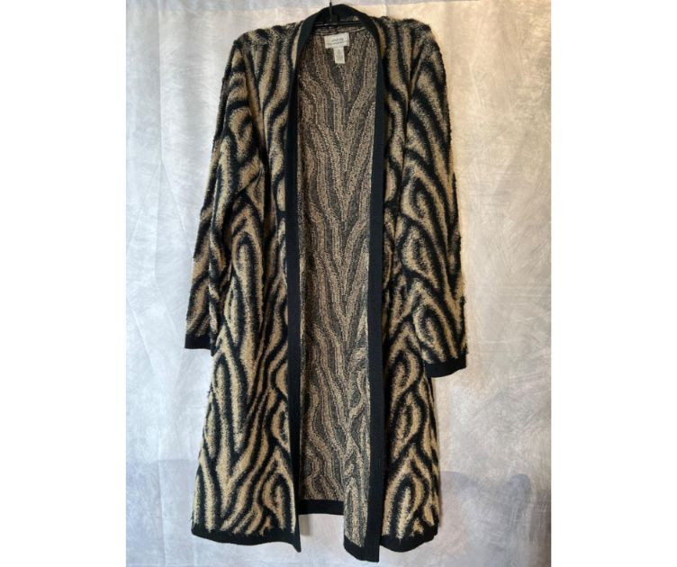 A striking Chicos long‑sleeve full‑length sweater, featuring a bold neutral animal‑inspired pattern in black and beige tones. This open‑front knit has a soft, cozy feel with a textured exterior and a beautifully patterned interior lining, giving it visual depth and designer‑level presence. Finished with clean black trim along the front opening and cuffs for a polished look. A versatile layering piece perfect for adding statement style to denim, leggings, or workwear.