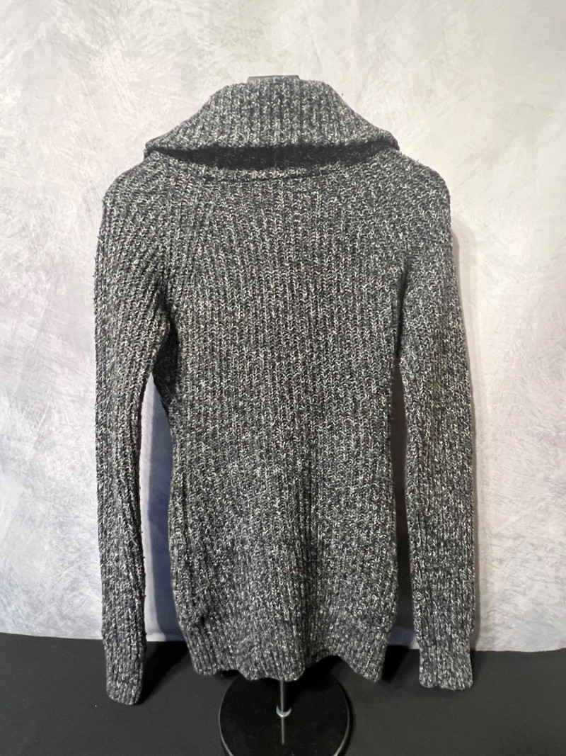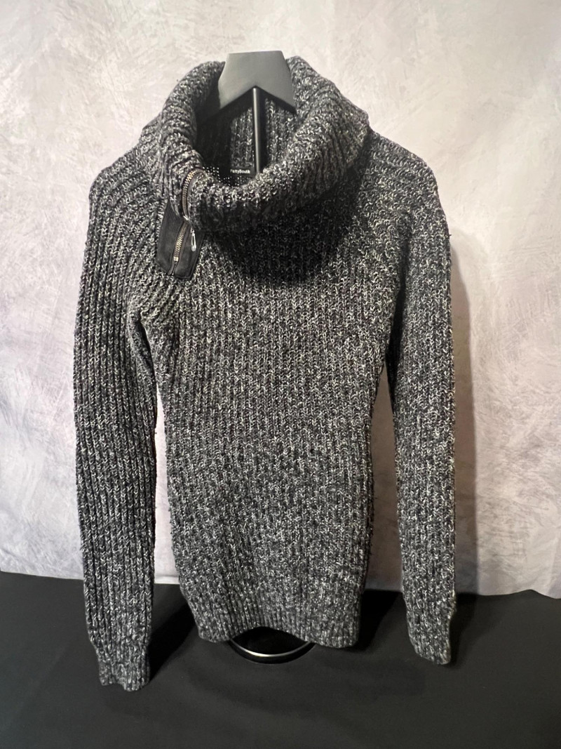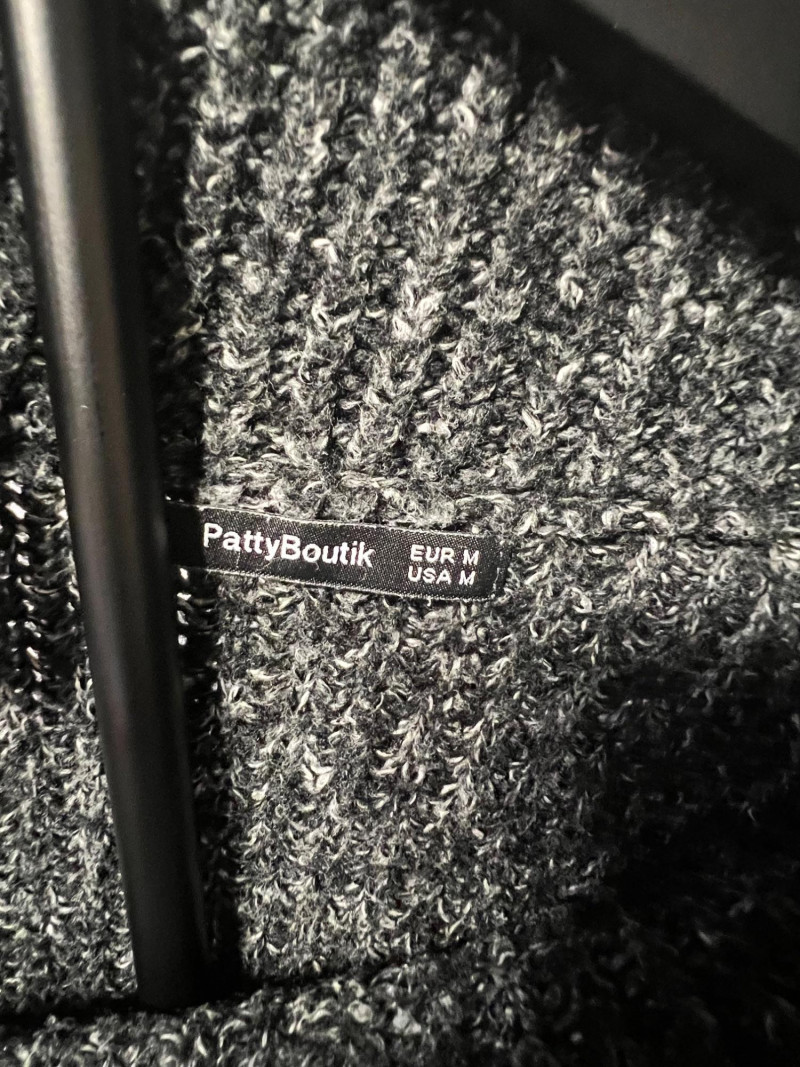 Patty Boutik women’s size Medium sweater in a deep charcoal knit with a textured rib pattern. Features the brand’s signature asymmetrical zip collar that can be worn open or closed for different looks. Soft, stretchy knit with a modern, structured silhouette — a versatile piece for layering and everyday wear.