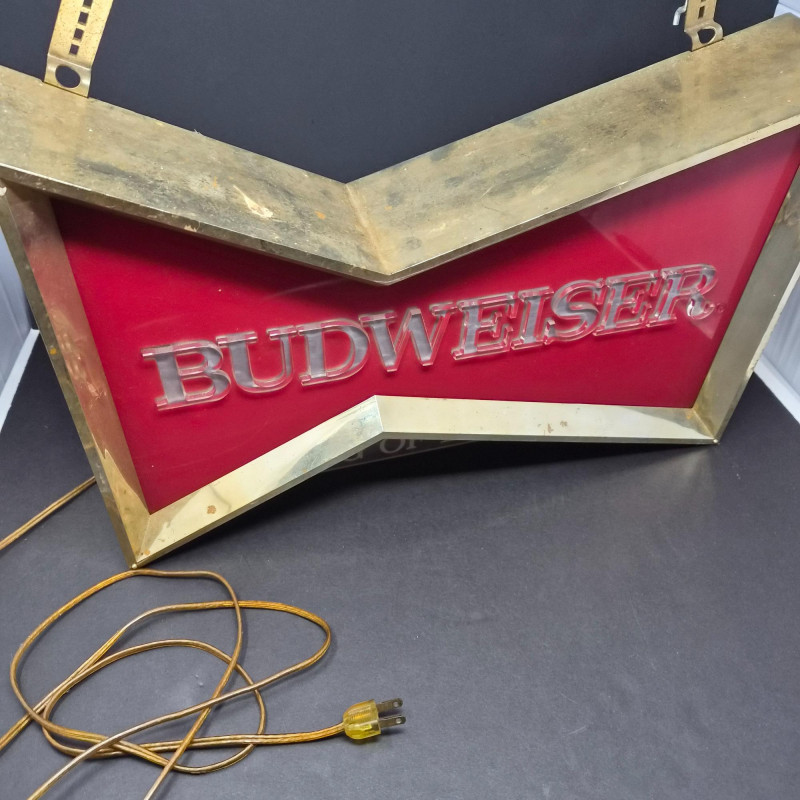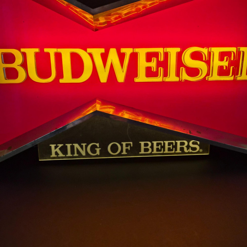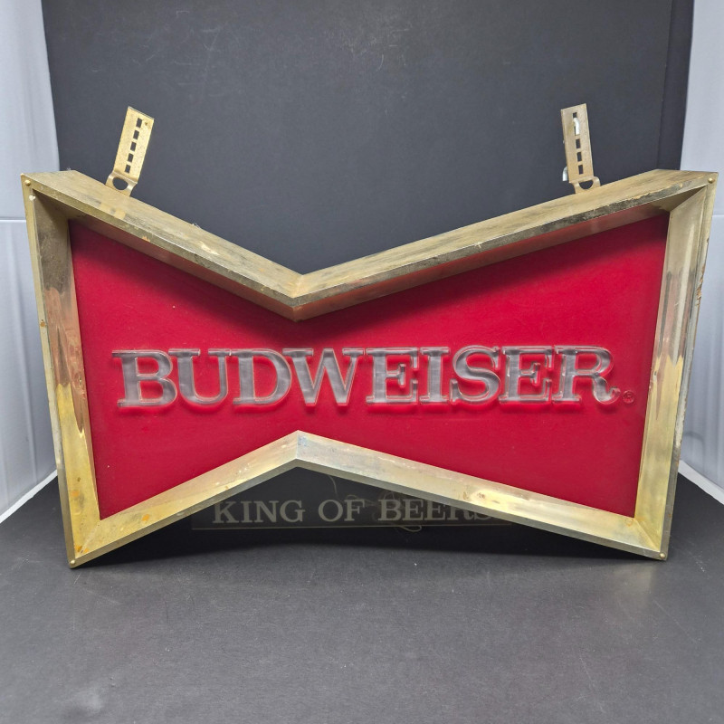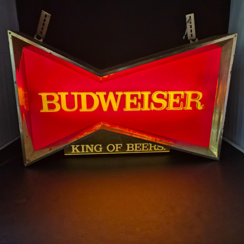 A glowing tribute to classic American beer culture, this vintage Budweiser neon sign features the iconic “King of Beers” slogan in vibrant red and white tubing. Encased in a gold-tone plastic housing with a functional pull cord, it’s fully operational and ready to light up your bar, garage, or game room. A must-have for collectors of Breweriana or fans of retro advertising. Condition: Operational; light wear consistent with age Features: Pull cord activation, gold plastic frame Era: Likely late 1970's-1980's Use: Wall-mounted display, bar décor, collector’s item
