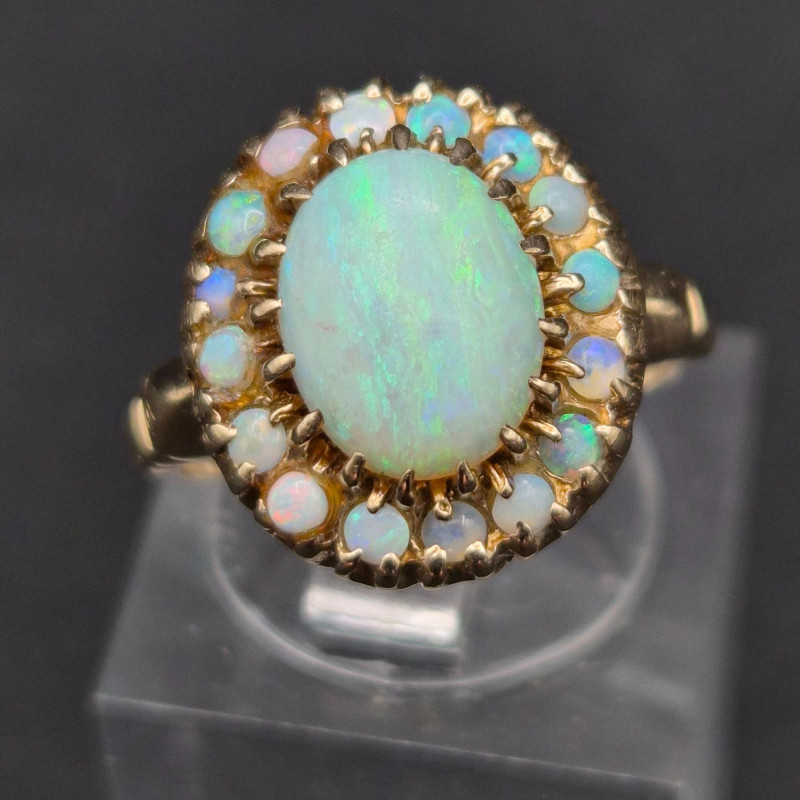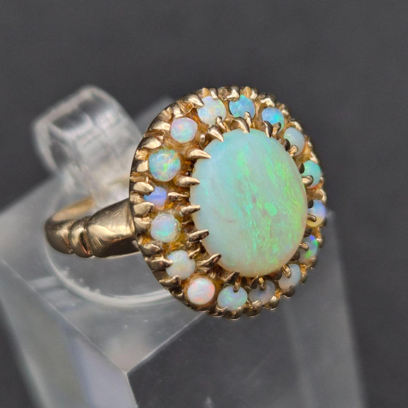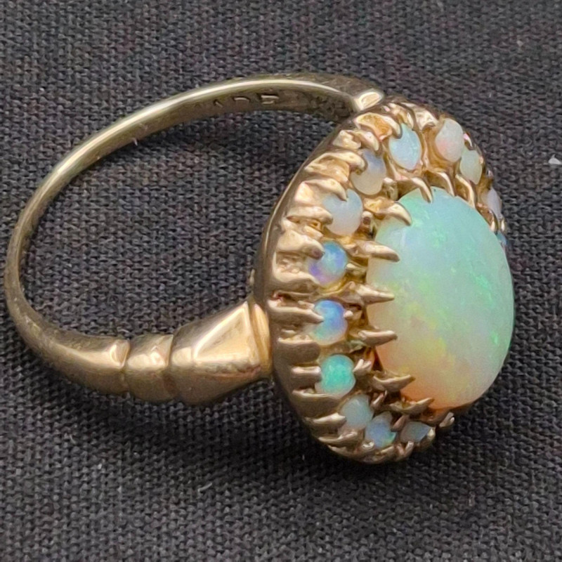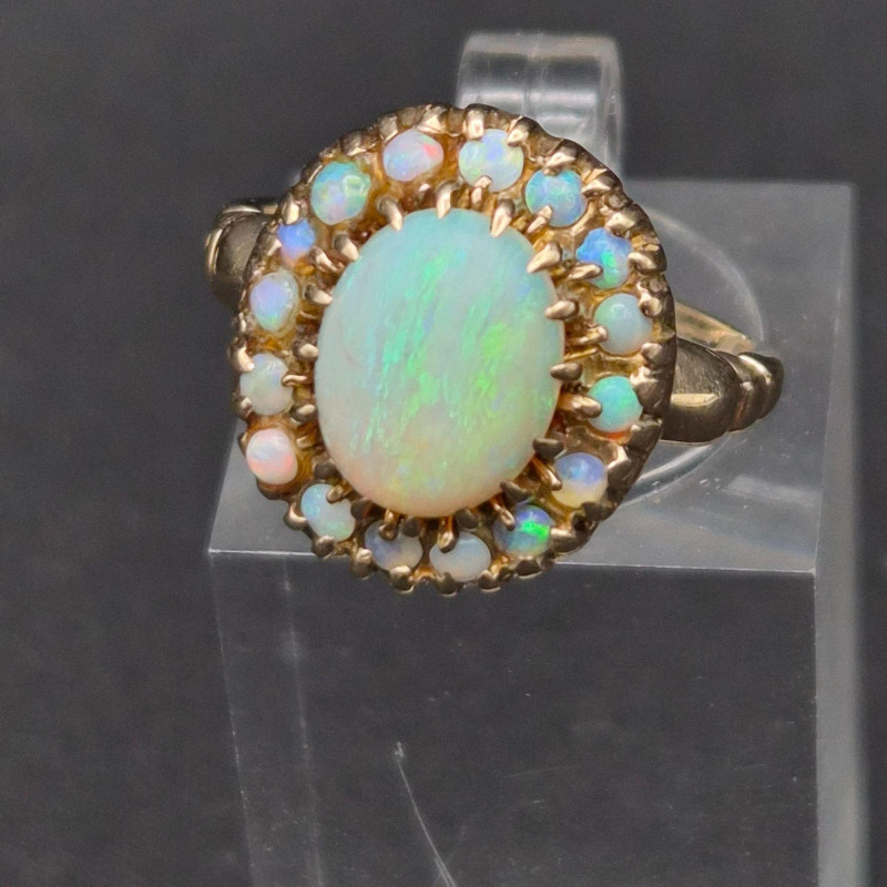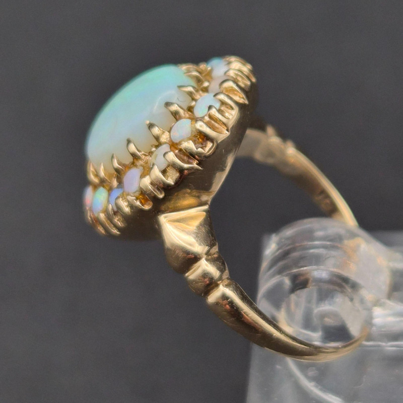 A dazzling Victorian-era treasure, this antique 10k gold ring features a mesmerizing oval opal center stone ablaze with color—flashes of green, blue, and pink dance across its surface. Surrounding it is a radiant halo of sixteen smaller opals, each securely prong-set in warm gold, amplifying the ring’s ethereal glow. Petite in size (3.5–4), this heirloom piece is ideal for collectors of antique jewelry or those seeking a romantic, resizable keepsake. Total weight: 3.1 grams. A rare and fiery find from a bygone era.