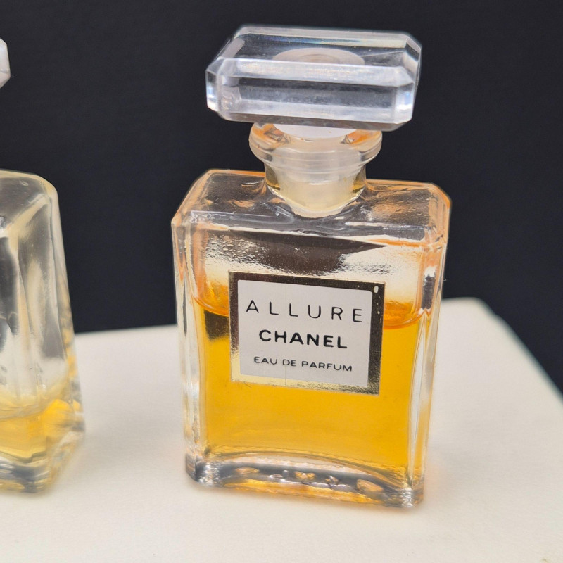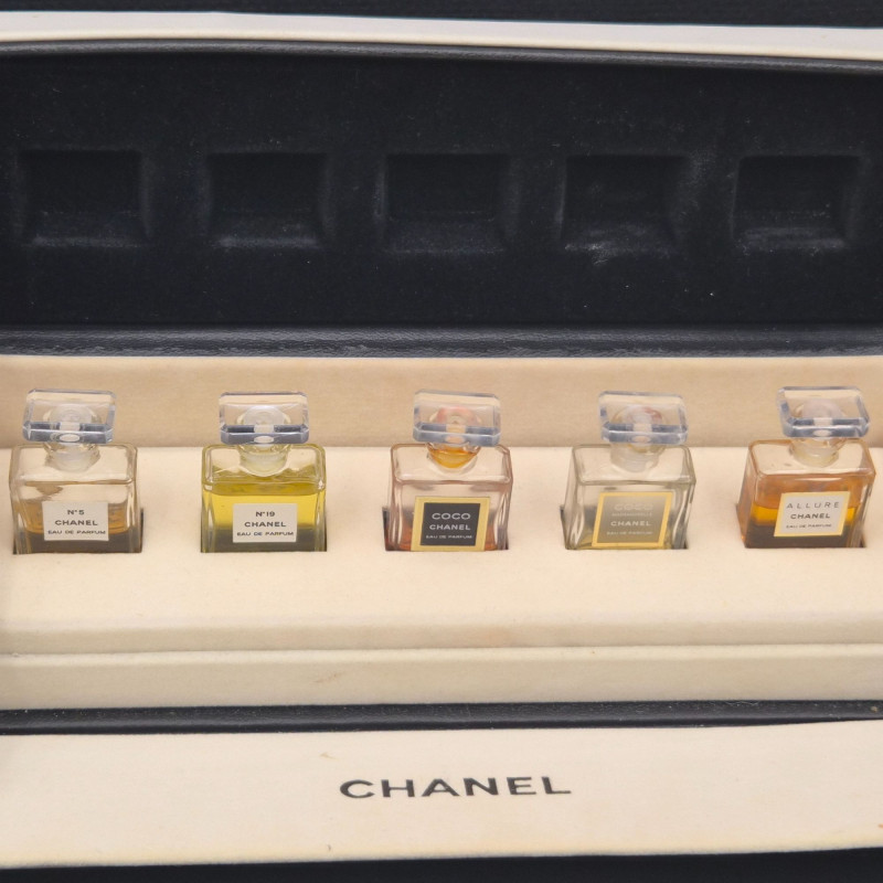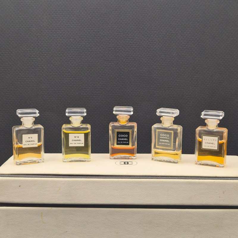 A luxurious set of five vintage Chanel mini perfume bottles, each nestled in its original presentation box. These glass minis feature acrylic stoppers and varying fill levels, with scents that still carry their signature allure. Includes iconic fragrances such as N°5, N°19, COCO Eau de Parfum, COCO Eau de Toilette, and ALLURE Eau de Parfum. A rare and elegant collection for display, gifting, or scent nostalgia.