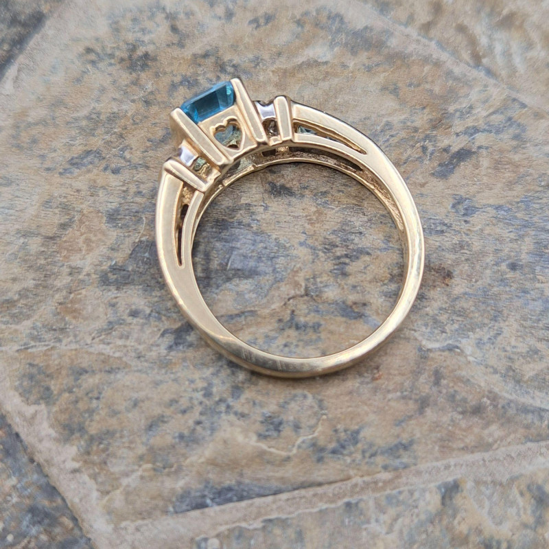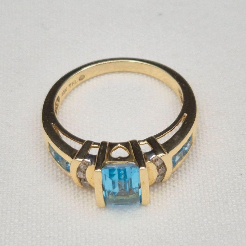 Samuel Aaron 10k yellow gold ring featuring a luminous rectangular-cut aqua gemstone at center—likely blue topaz or aquamarine. Flanking the main stone are three small round diamonds on each side, adding sparkle and symmetry. Two channel-set square princess-cut aqua stones accent the band, while delicate heart-shaped cutouts beneath the center stone lend a romantic touch. Stamped 10k THL, size 6, total weight 3.8 grams.