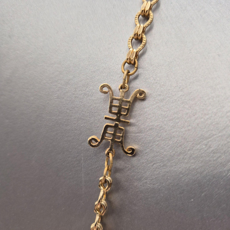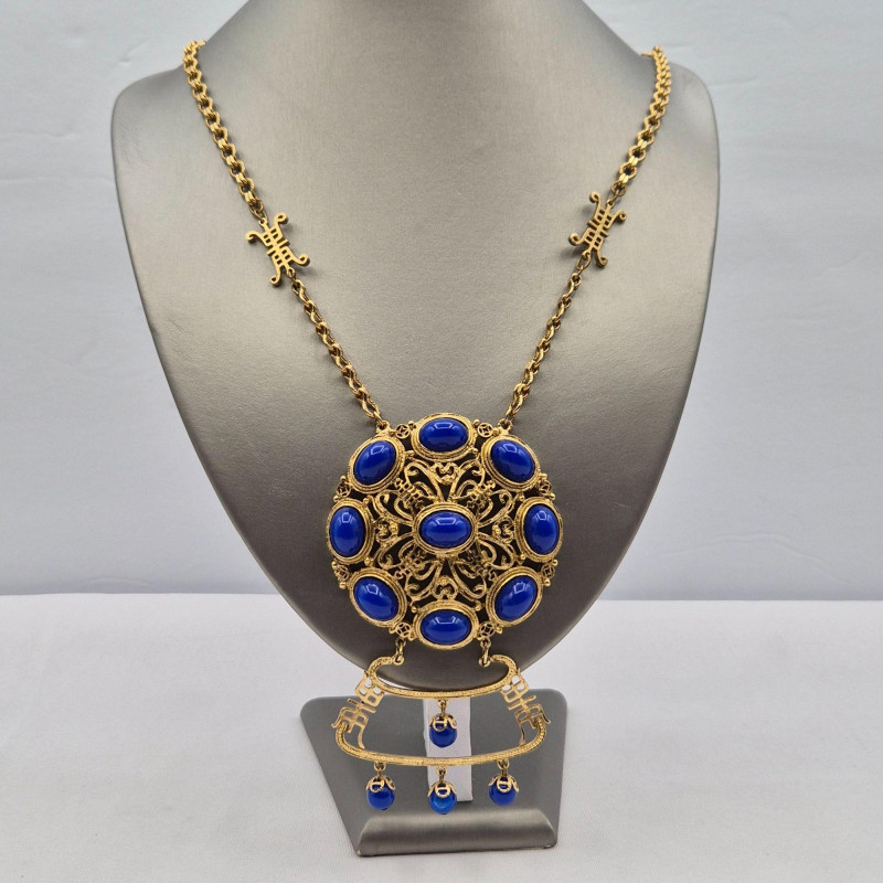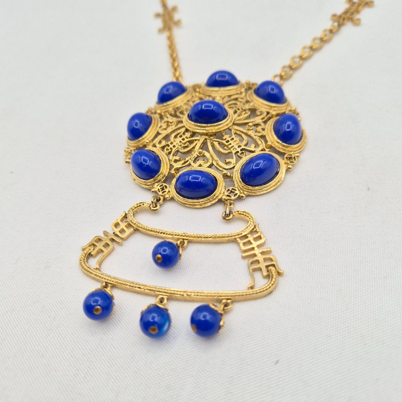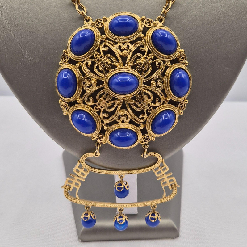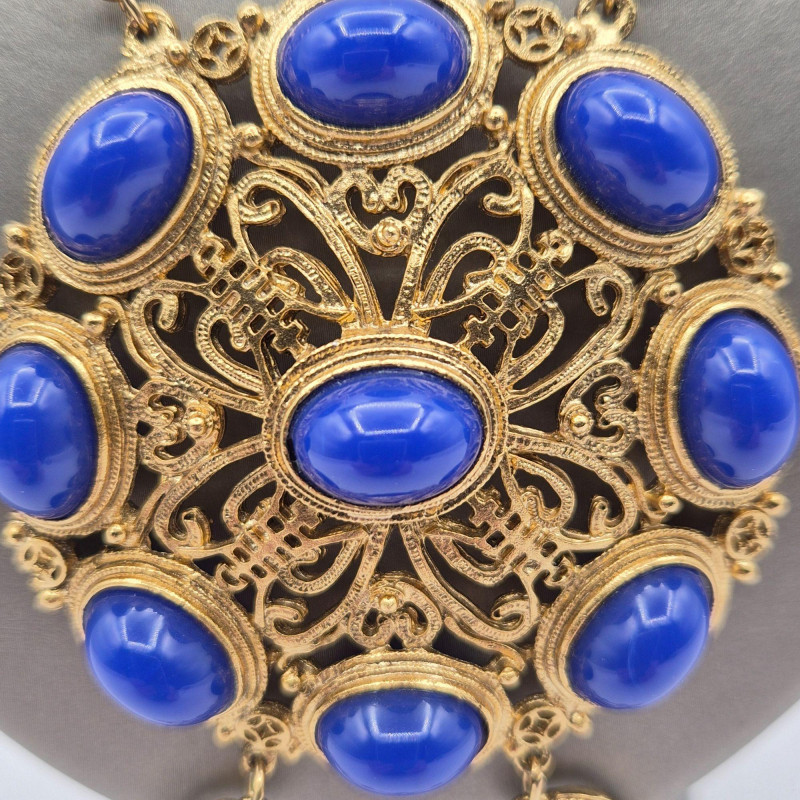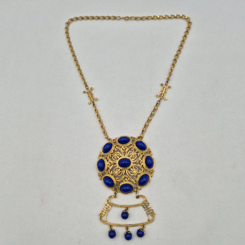 A dazzling vintage necklace with Asian-inspired flair, featuring a large circular gold-tone filigree medallion set with nine vibrant blue oval cabochons arranged in a radiant geometric pattern. Below, a decorative gold-tone element with cutout motifs anchors five moonglow-style bead drops, each encased in delicate filigree. The 19" chain offers a comfortable wearable length, while the pendant adds an impressive 4.25" drop for dramatic effect. Lightweight yet bold, this piece is a showstopper