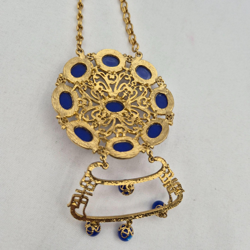 Lot # 12 - Ornate Blue Cabochon Necklace - Filigree Medallion, Moonglow Dangles