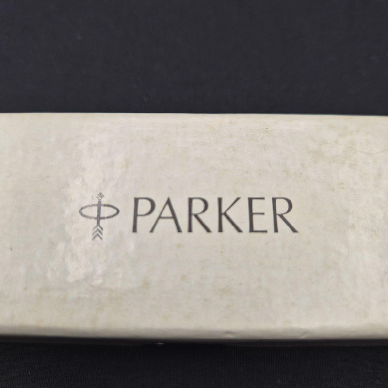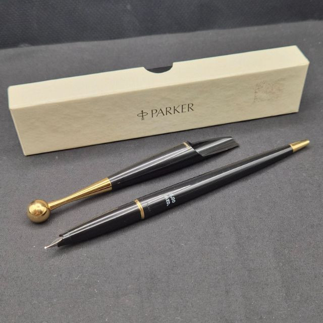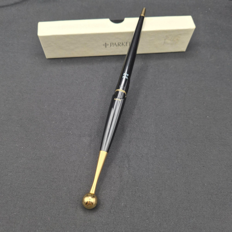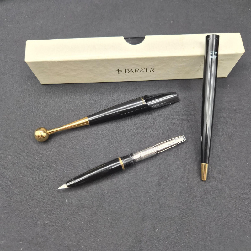 A sleek and collectible Parker USA fountain pen, paired with a decorative cap-style pen holder for elegant desk display. This set blends function with form, perfect for writers, professionals, or collectors of vintage Parker pens. A handsome addition to any desk or pen collection.