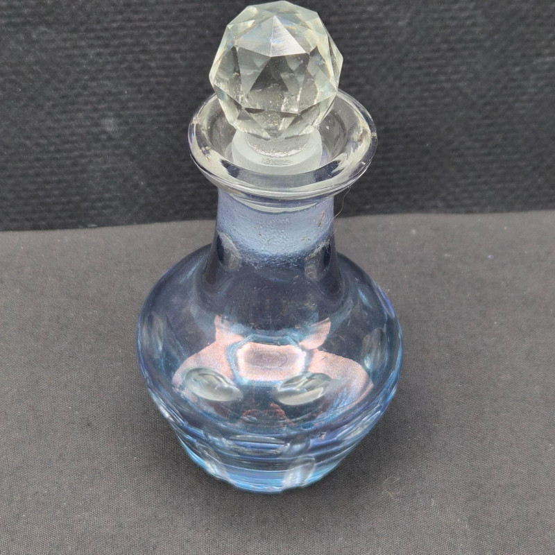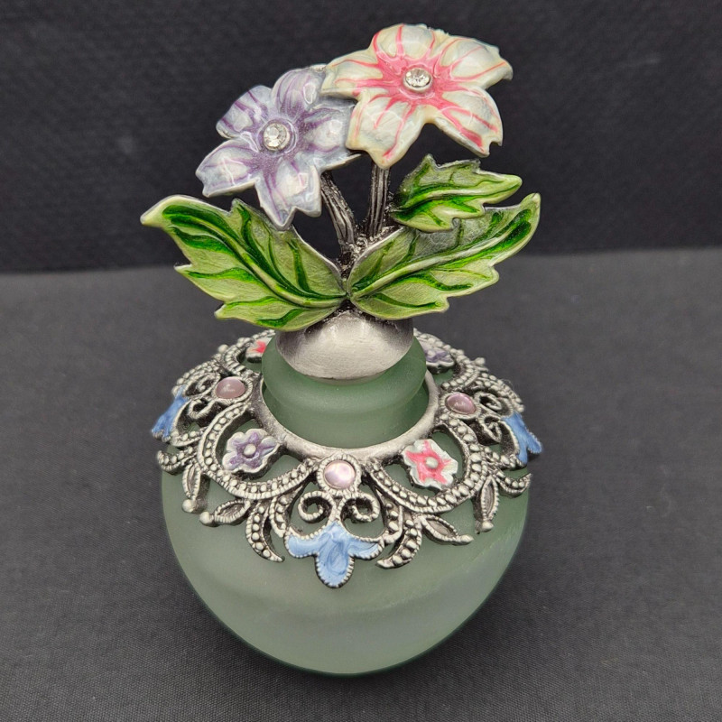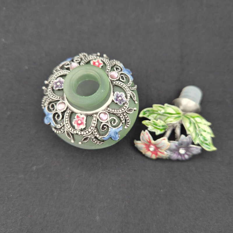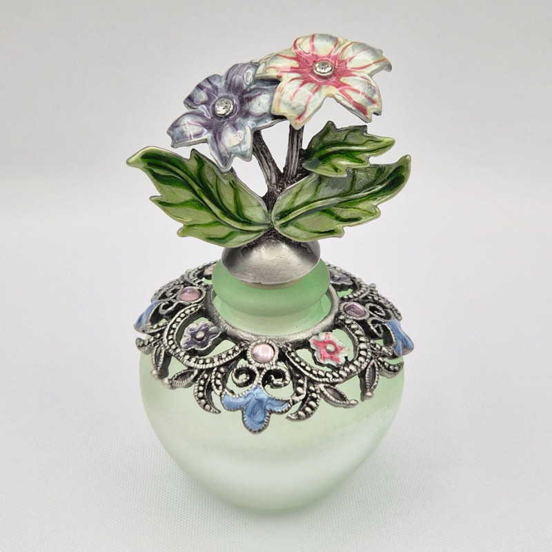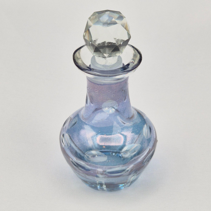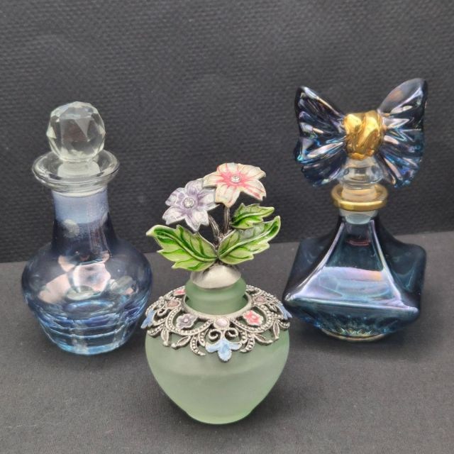 Three small vintage glass scent bottles, each with its own distinctive character: Together, these bottles create a colorful vignette of vanity glass, perfect for display, collecting, or gifting.