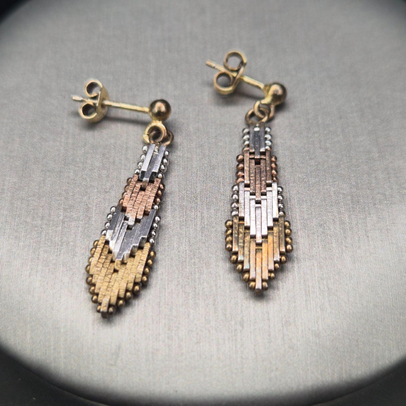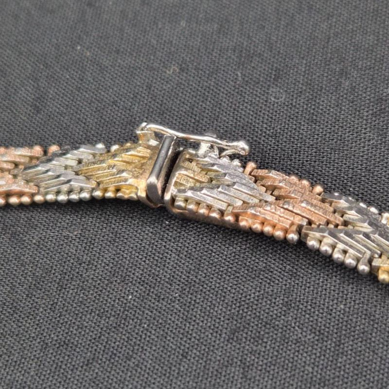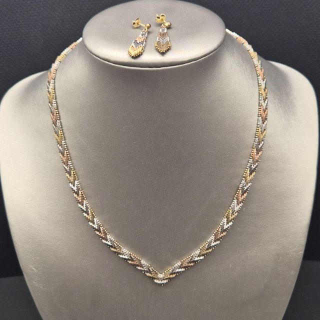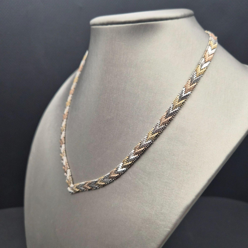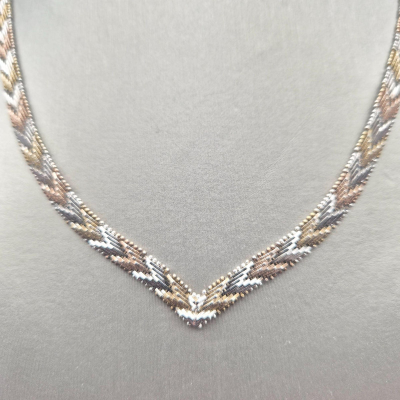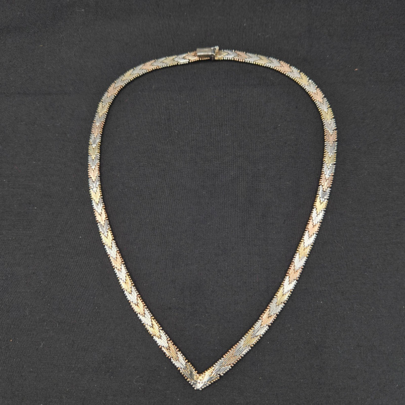 A striking Italian sterling silver set featuring a 16" chevron-weave necklace and matching 1.25" earrings. Crafted in 925 silver, the design incorporates three tones—silver, gold, and rose hues—woven in a chevron pattern for a bold yet elegant look. This ensemble blends Italian artistry with versatile styling.