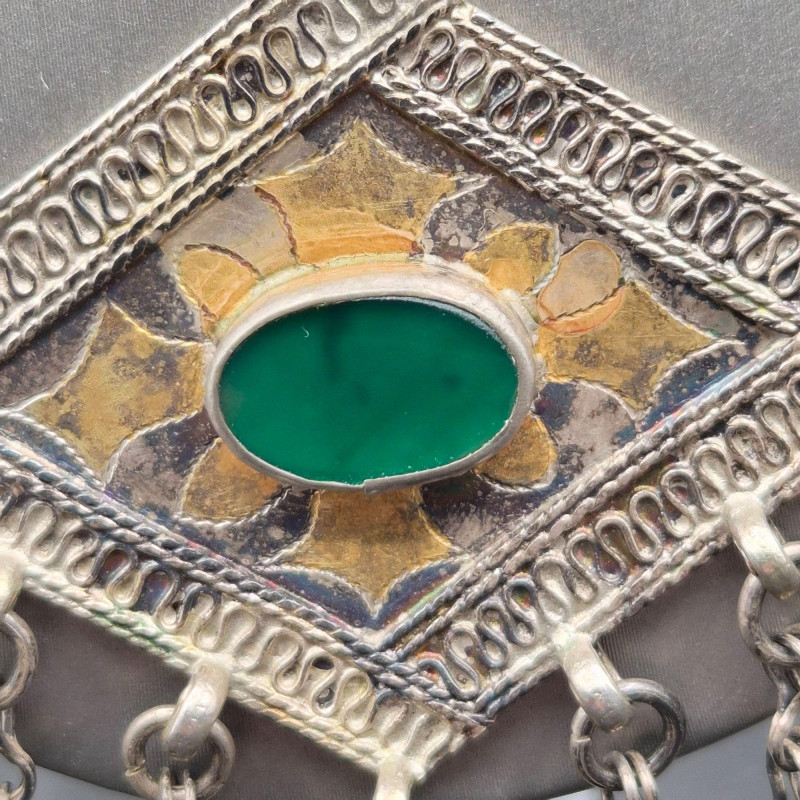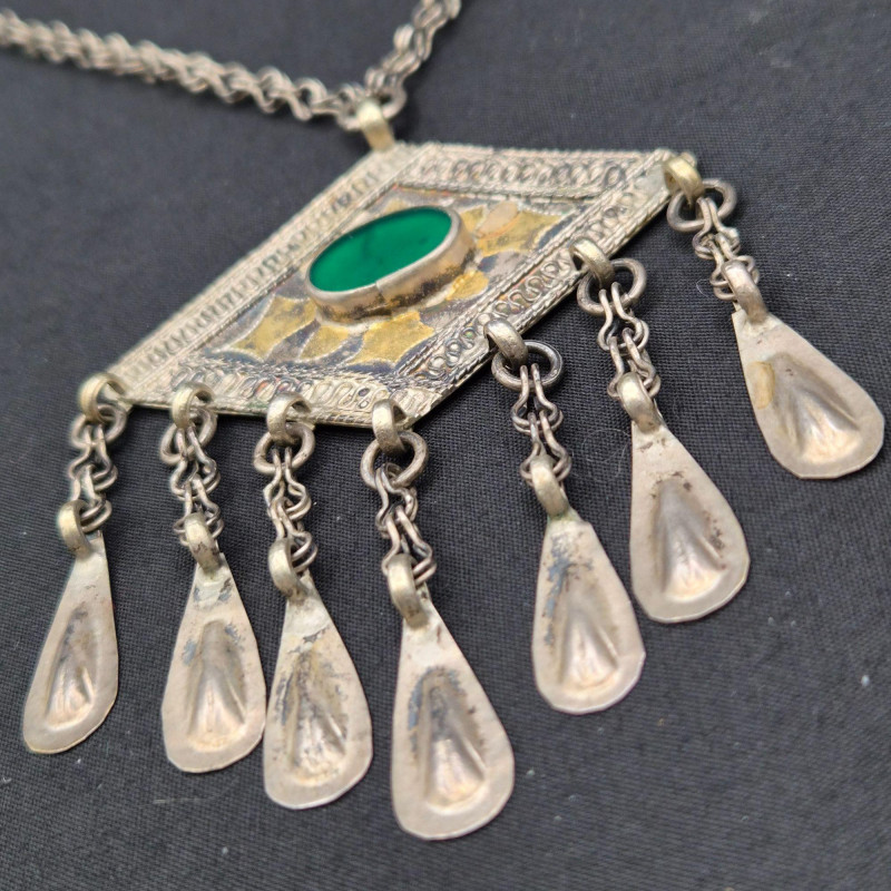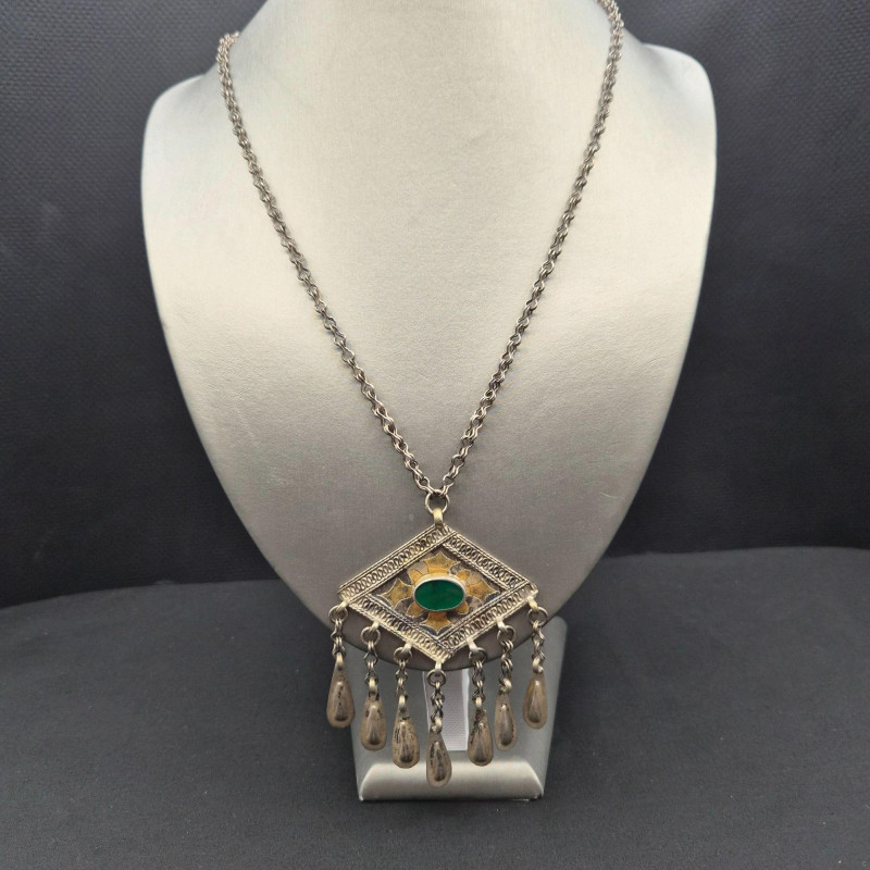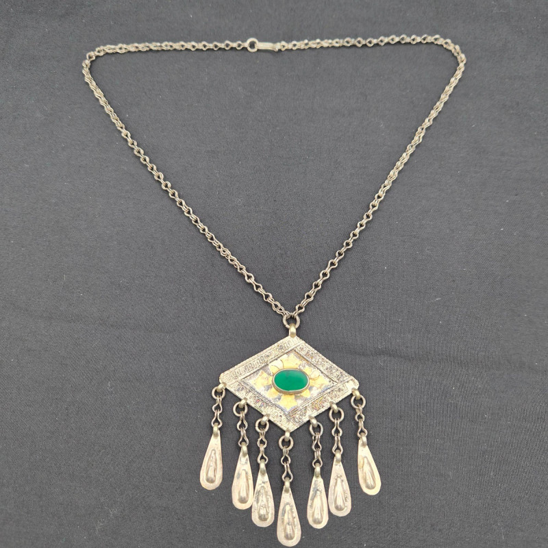 Lot # 30 - Artisan Tribal Silver Necklace with Dangles & Bezel-Set Green Stone