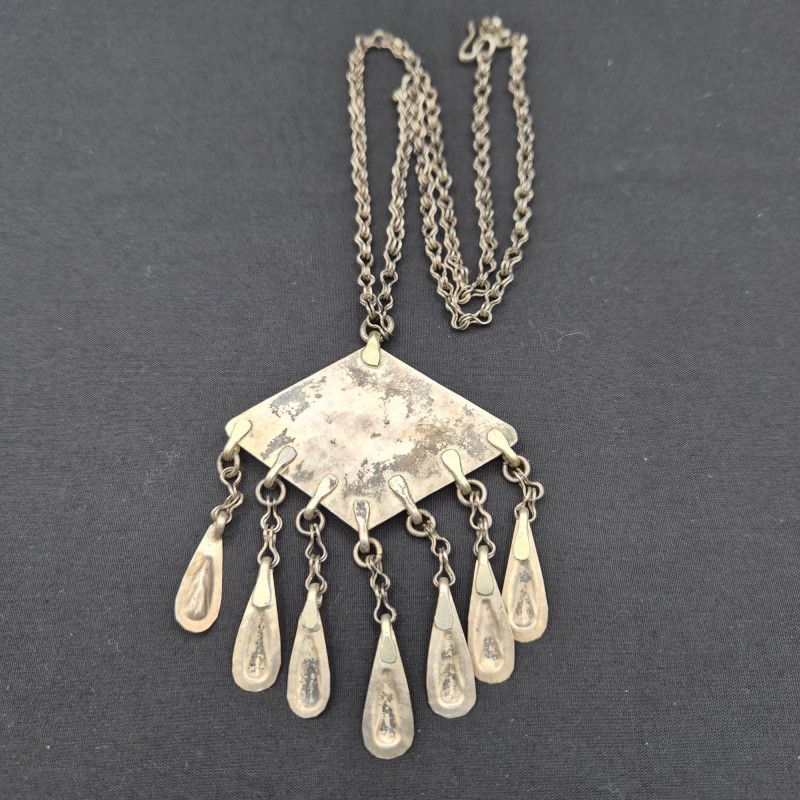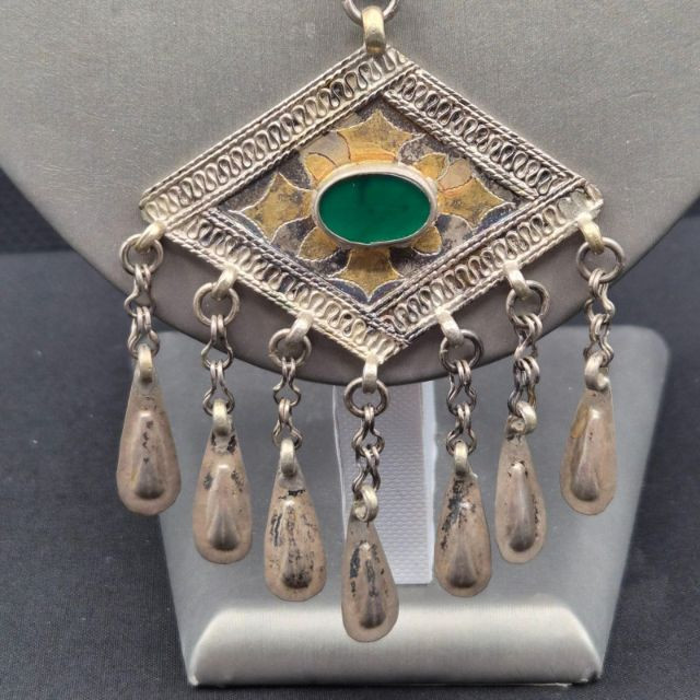 Handmade tribal-style necklace featuring a bold pendant and rich mixed-metal detailing. This piece blends ethnic craftsmanship with dramatic silhouette, ideal for collectors of tribal jewelry, statement necklaces, or mixed-metal artisan designs.