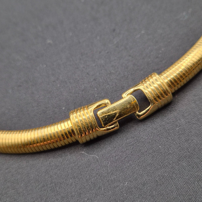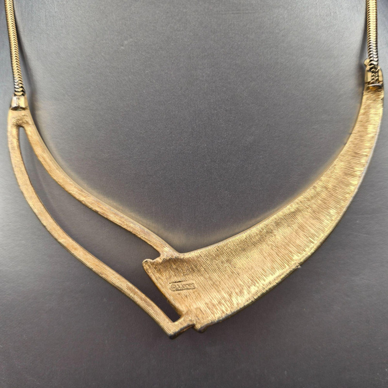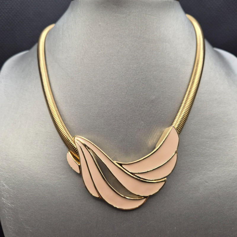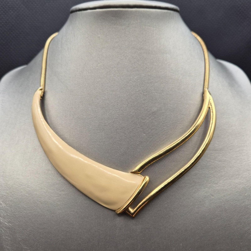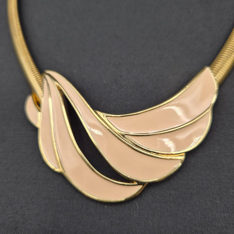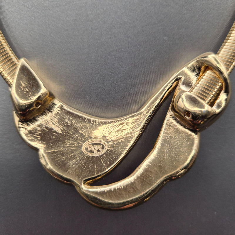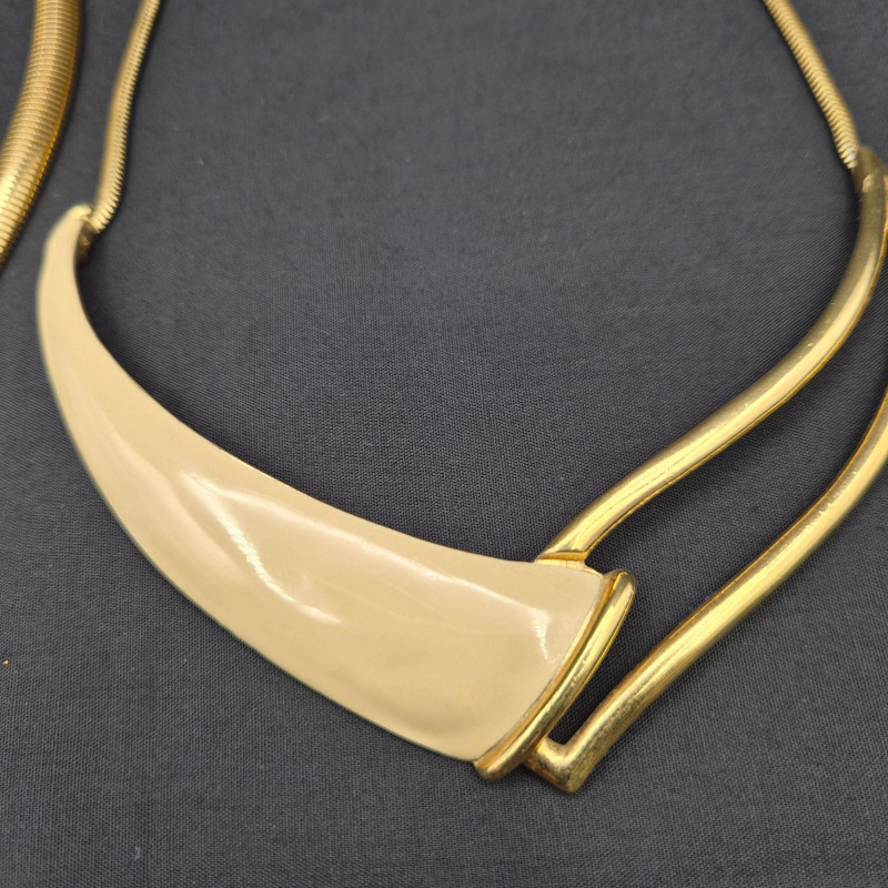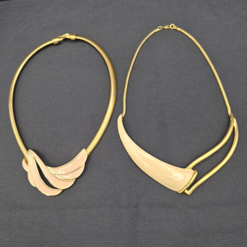 A pair of vintage designer choker necklaces in rich gold tone, each featuring natural-tone enameled pendants: Both necklaces measure approximately 14.5" choker length, designed to sit elegantly at the neckline. Together, they showcase the classic craftsmanship of Monet and Trifari, perfect for collectors of mid-century costume jewelry or those seeking versatile statement pieces.