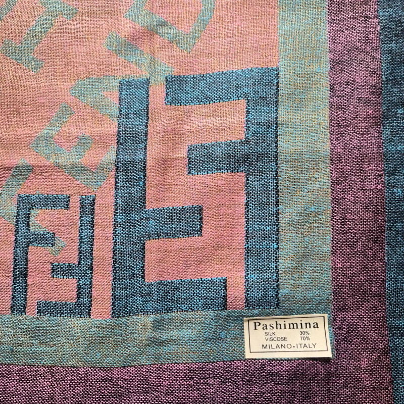 A richly patterned Italian pashmina-style scarf wrap in a Fendi-inspired design, featuring geometric motifs and bold color blocking in muted shades of blue, purple, peach, and green, finished with a yellow fringe edge. Perfect for adding a pop of color and pattern to winter coats, dresses, or travel ensembles. A standout piece for collectors of fashion-forward accessories with European flair.