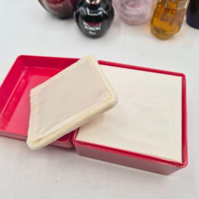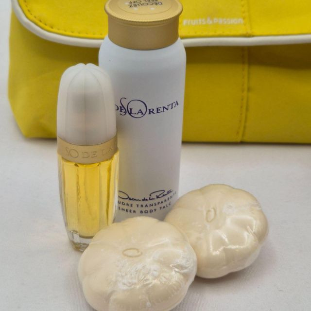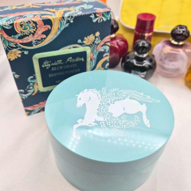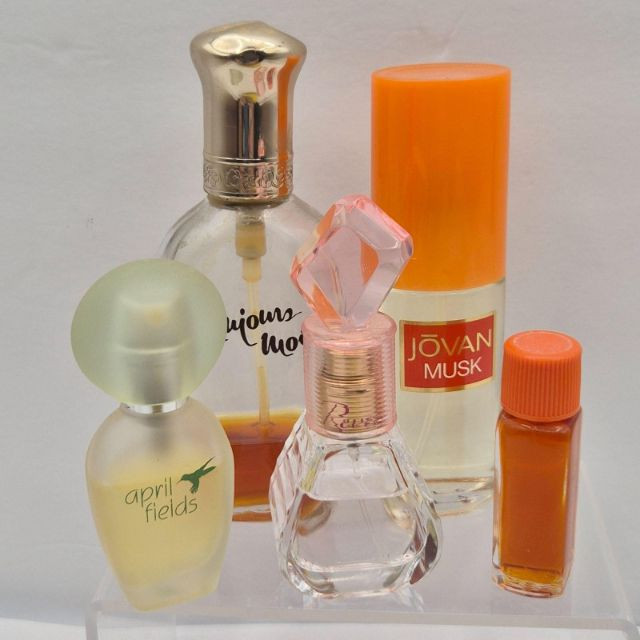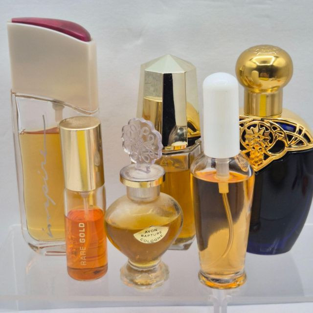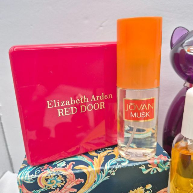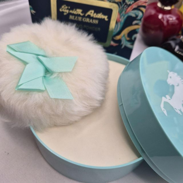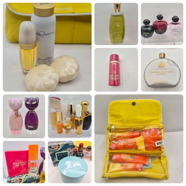 A nostalgic and visually captivating collection of vintage perfume bottles, powders, and bath accessories, featuring iconic brands and decorative packaging from multiple eras: