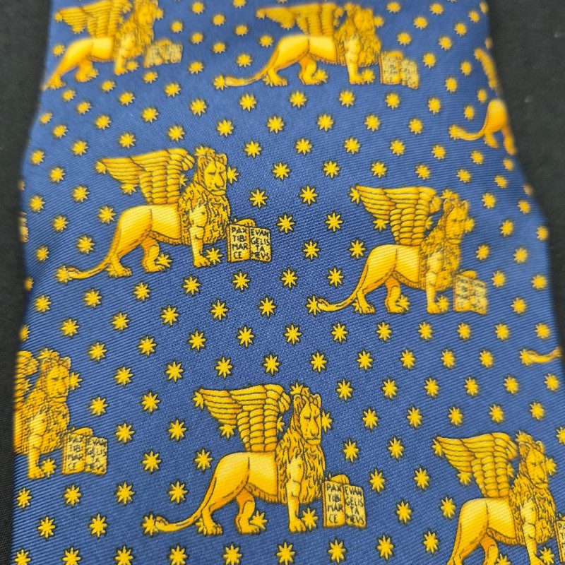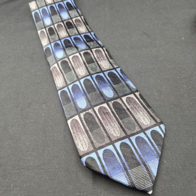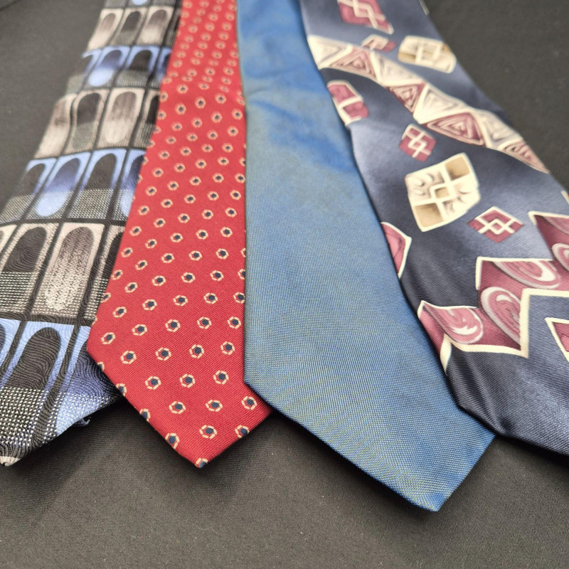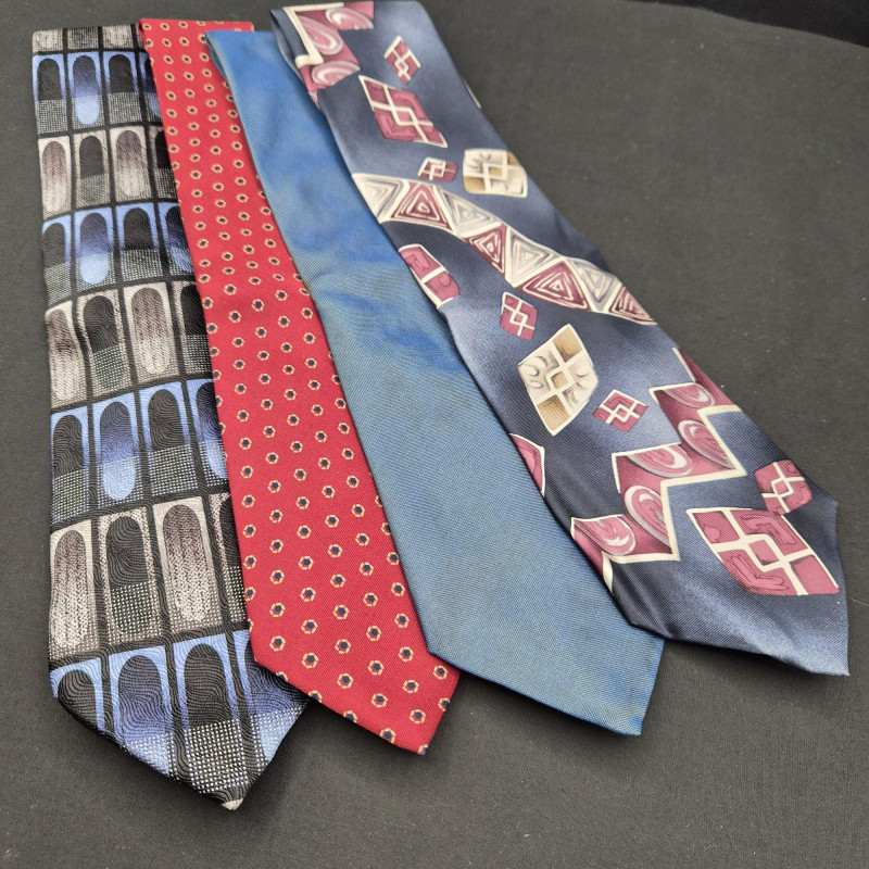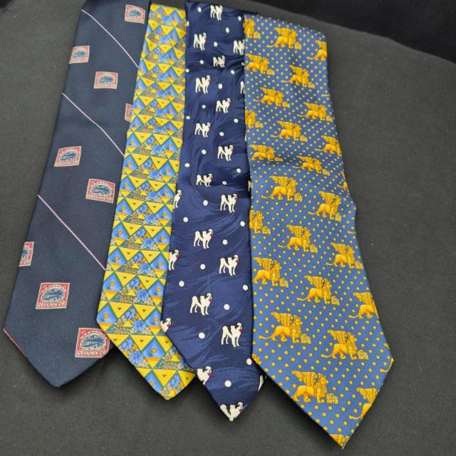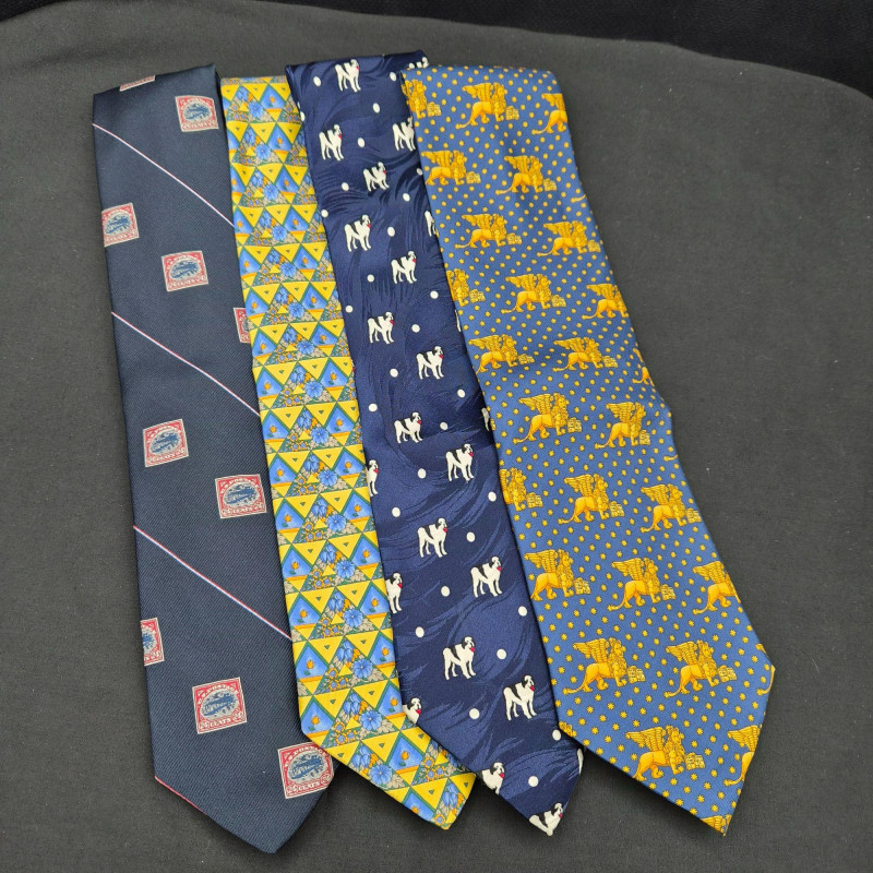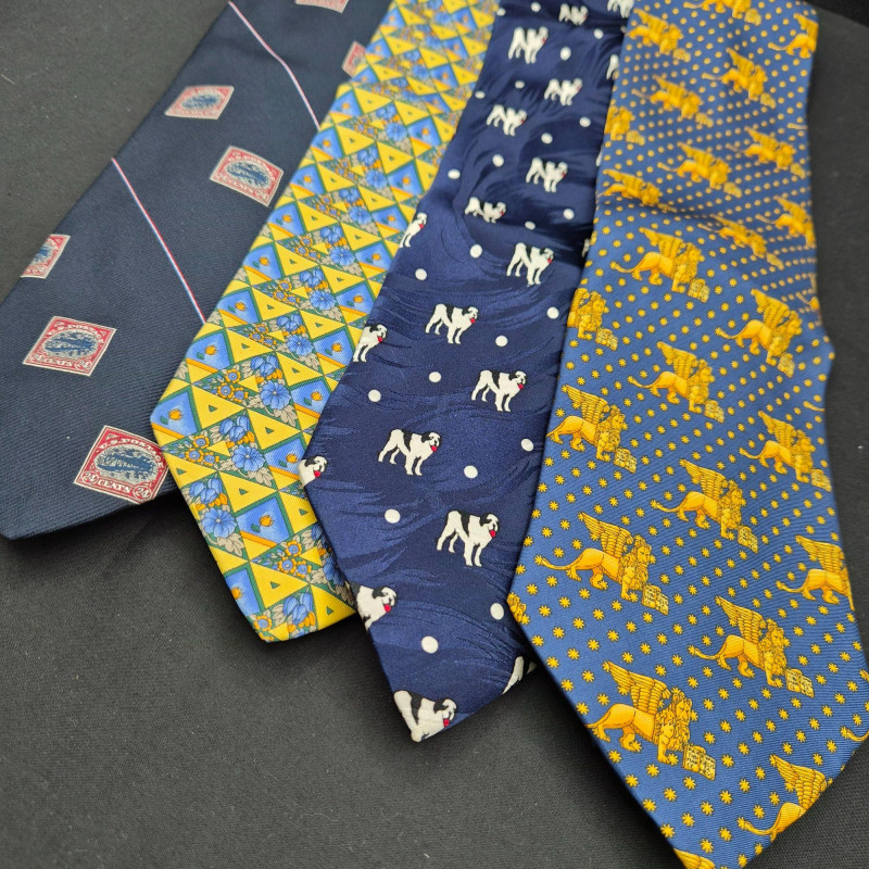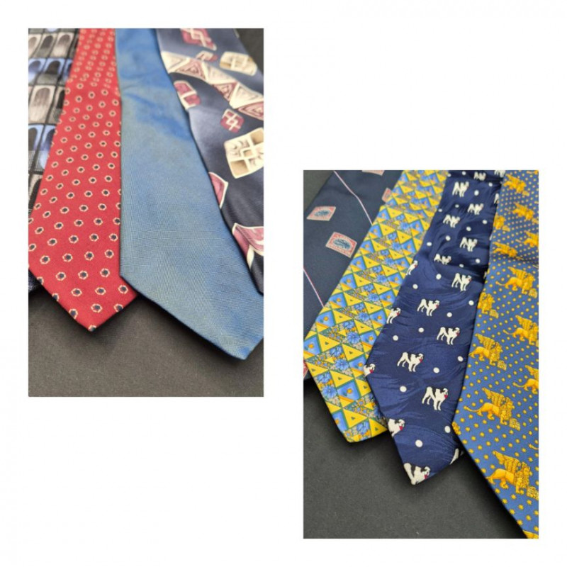A stylish spread of eight vintage men’s neckties, each with its own flair. From designer silk classics to a playful polyester postal stamp print, this lot offers a curated mix of color, texture, and personality.